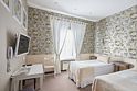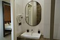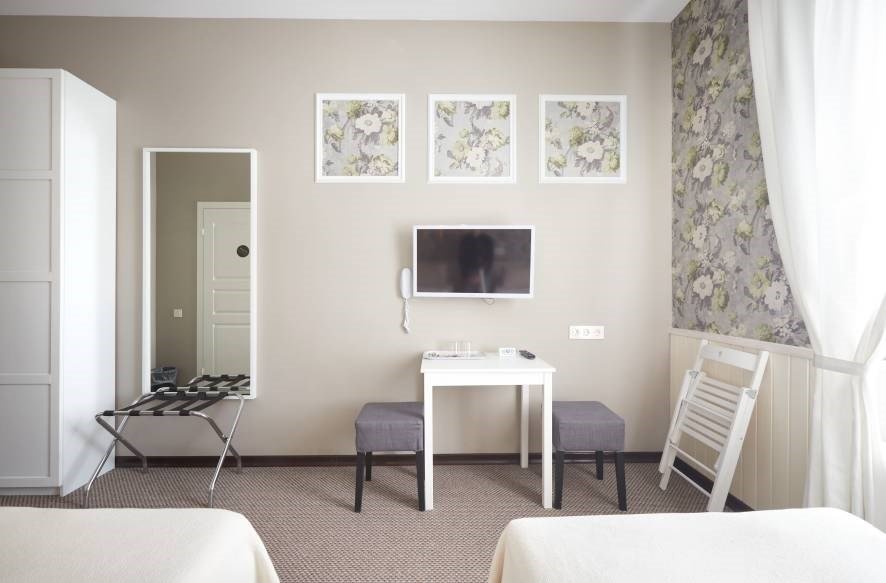 Wi-Fi, кондиционер, светильник, фен, утюг, обогреватель, санузел, теплый пол, банные принадлежности, банные полотенца, косметические средства, две односпальные или большая двуспальная кровать, ортопедический матрас, тумбы, стулья, шкаф для одежды, вешалки, письменный стол, багажная тумба, зеркало, пуфики, раковина, ковровое покрытие, отопление, душ, вид на сад, вид на город, кулер на этаже, туалетные средства, туалет, внутренний телефон, телевизор со Smart TV, номер для некурящих, мыло, без питомцевВ номере