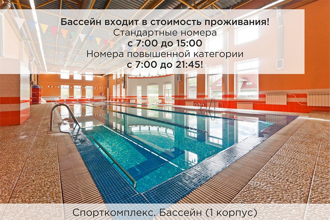 * Бассейн находится в 1 корпусе отеля. Посещение бассейна осуществляется по предварительной записи в часы работы спортивного комплекса. Для посещения бассейна необходимо иметь купальные принадлежности, тапочки и шапочки. Сеанс плавания в бассейне начинается ровно в каждый час и длится 45 минут. С 1.09 по 31.05 посещение бассейна для гостей отеля недоступно в понедельник, среду и пятницу с 19:00 до 20:00.