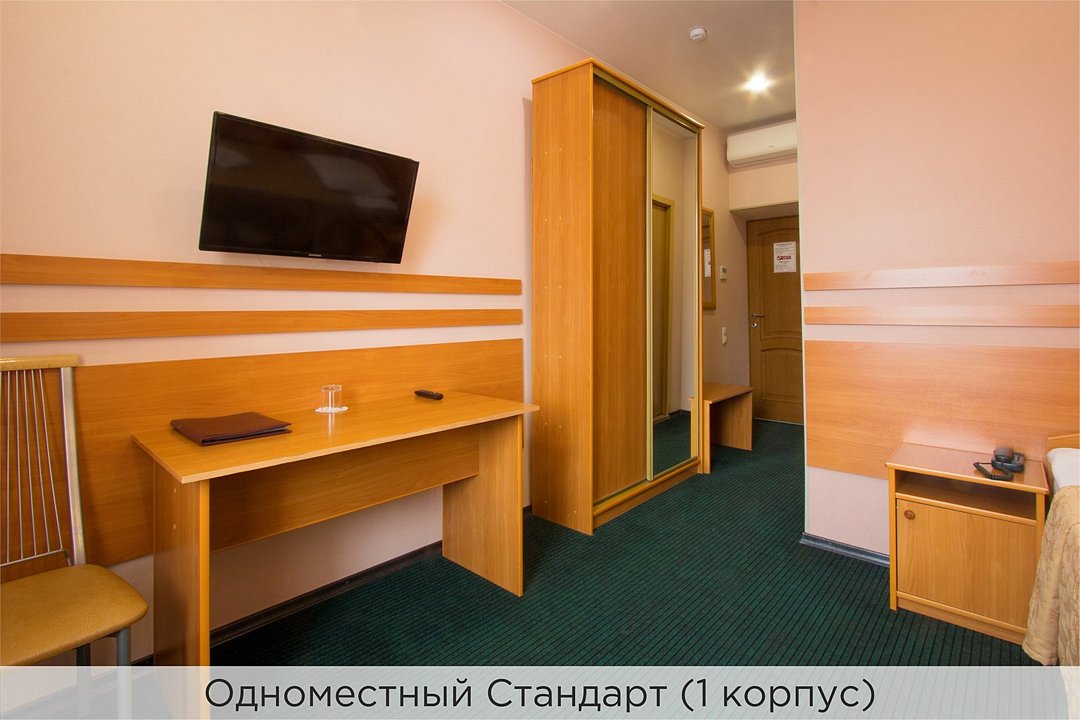 Номера категории "1 местный стандарт" - это отличное сочетание цены и качества. Номер состоит из спальной комнаты, небольшого холла и санузла. Стены номера оформлены в пастельных тонах, ковровое покрытие на полу. Номера данной категории расположены в 1 корпусе. Количество номеров - 2. Номера оборудованы кондиционерами. В стоимость проживания, в номере любой категории, входит: - завтрак «Шведский стол» с 7.00 до 11.00 (согласно выбранному тарифу). - посещение 25-метрового бассейна* с 7.00 до 21.45 в номерах повышенной категории; с 07.00 до 15.00 в номерах категории "Стандарт" (в остальное время - скидка 20%; с 1.06 по 31.08 бассейн входит в стоимость весь день для всех категорий номеров). - посещение тренажёрного зала, саун (финская и турецкая) с 7.00 до 21.45. - мини-гольф. - интернет Wi-Fi. - Скидка 20% на индивидуальные сауны, мангальные беседки и летнюю площадку для шашлыка. - Пользование площадкой со столиками "Звёздное небо" с возможностью аренды мангала. * Бассейн находится в 1 корпусе отеля. Посещение бассейна осуществляется по предварительной записи в часы работы спортивного комплекса. Для посещения бассейна необходимо иметь купальные принадлежности, тапочки и шапочки. Сеанс плавания в бассейне начинается ровно в каждый час и длится 45 минут. С 1.09 по 31.05 посещение бассейна для гостей отеля недоступно в понедельник, среду и пятницу с 19:00 до 20:00. При заселении в отель каждому гостю необходимо предъявить документ удостоверяющий личность (паспорт). Для детей до 14 лет необходимо предъявление свидетельства о рождении. Для заселения несовершеннолетних детей без родителей необходимо предъявить доверенность (для детей до 14 лет доверенность должна быть на сопровождающее лицо, для детей старше 14 лет доверенность может быть оформлена на ребенка). - С иностранных граждан взимается плата за услуги по оформлению документов для постановки на миграционный учёт в размере 300.00 RUB за весь период проживания с человека.Услуги и удобства