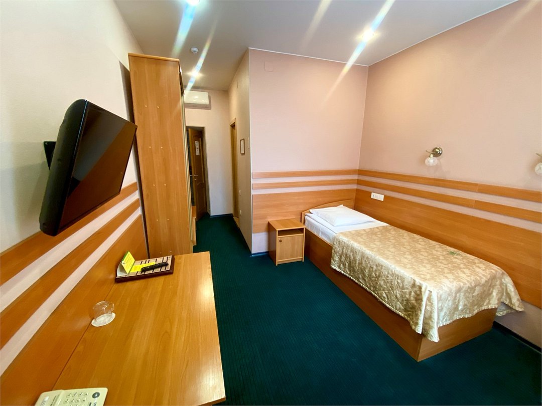 кабельное телевидение, Wi-Fi, интернет, телефон, холодильник, кондиционер, светильник, настольные лампы, санузел, банные полотенца, тапочки, односпальная кровать, шкаф для одежды, багажная тумба, зеркало, обслуживание номеров, унитаз, раковина, ковровое покрытие, отопление, душ, кулер на этаже, стул, стол, туалетные средства, телевизор с плоским экраном, гостиничная парфюмерия, номер для некурящих, общественный бассейн, холодильный шкаф, уборка номера, услуги прачечной (платно), прачечная (за дополнительную плату), еда на вынос (за дополнительную плату), без вида, без питомцевВ гостиничном номере