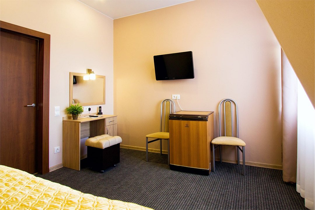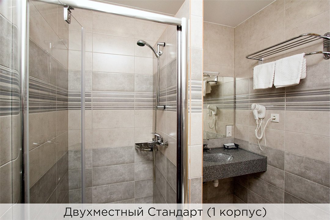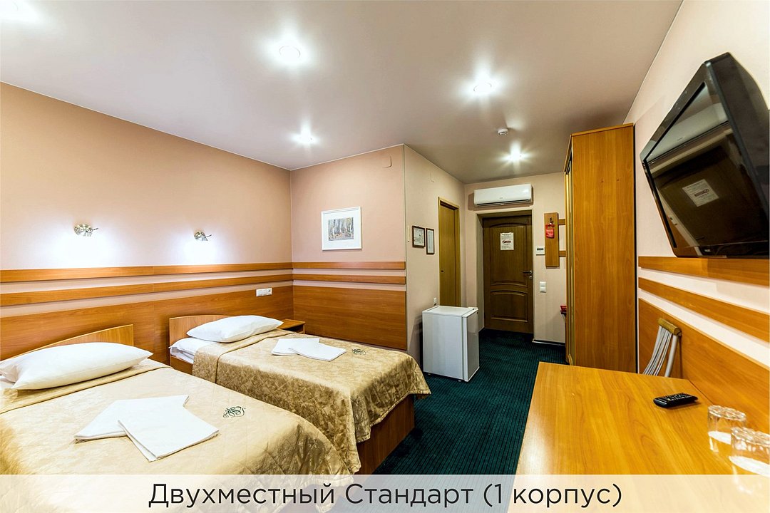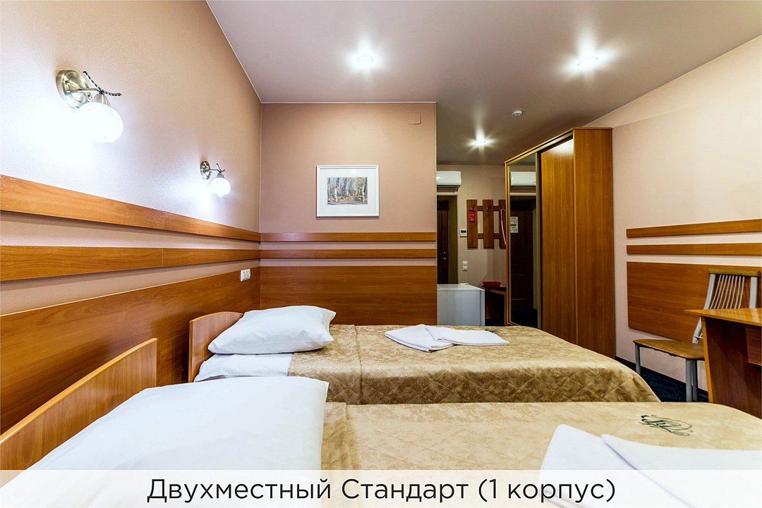 Однокомнатный номер с кухонным уголком, двумя полуторными кроватями и совмещенным санузлом. Номер расположен в 3 корпусе. Не оборудован кондиционером. Проживание с животными в данной категории не предусмотрено. В стоимость проживания, в номере любой категории, входит: - завтрак «Шведский стол» с 7.00 до 11.00 (согласно выбранному тарифу). - посещение 25-метрового бассейна* с 7.00 до 21.45 в номерах повышенной категории; с 07.00 до 15.00 в номерах категории "Стандарт" (в остальное время - скидка 20%; с 1.06 по 31.08 бассейн входит в стоимость весь день для всех категорий номеров). - посещение тренажёрного зала, саун (финская и турецкая) с 7.00 до 21.45. - мини-гольф. - интернет Wi-Fi. - Скидка 20% на индивидуальные сауны, мангальные беседки и летнюю площадку для шашлыка. - Пользование площадкой со столиками "Звёздное небо" с возможностью аренды мангала. * Бассейн находится в 1 корпусе отеля. Посещение бассейна осуществляется по предварительной записи в часы работы спортивного комплекса. Для посещения бассейна необходимо иметь купальные принадлежности, тапочки и шапочки. Сеанс плавания в бассейне начинается ровно в каждый час и длится 45 минут. С 1.09 по 31.05 посещение бассейна для гостей отеля недоступно в понедельник, среду и пятницу с 19:00 до 20:00. При заселении в отель каждому гостю необходимо предъявить документ удостоверяющий личность (паспорт). Для детей до 14 лет необходимо предъявление свидетельства о рождении. Для заселения несовершеннолетних детей без родителей необходимо предъявить доверенность (для детей до 14 лет доверенность должна быть на сопровождающее лицо, для детей старше 14 лет доверенность может быть оформлена на ребенка). - С иностранных граждан взимается плата за услуги по оформлению документов для постановки на миграционный учёт в размере 300.00 RUB за весь период проживания с человека.Услуги и удобства