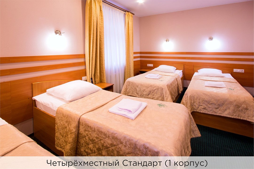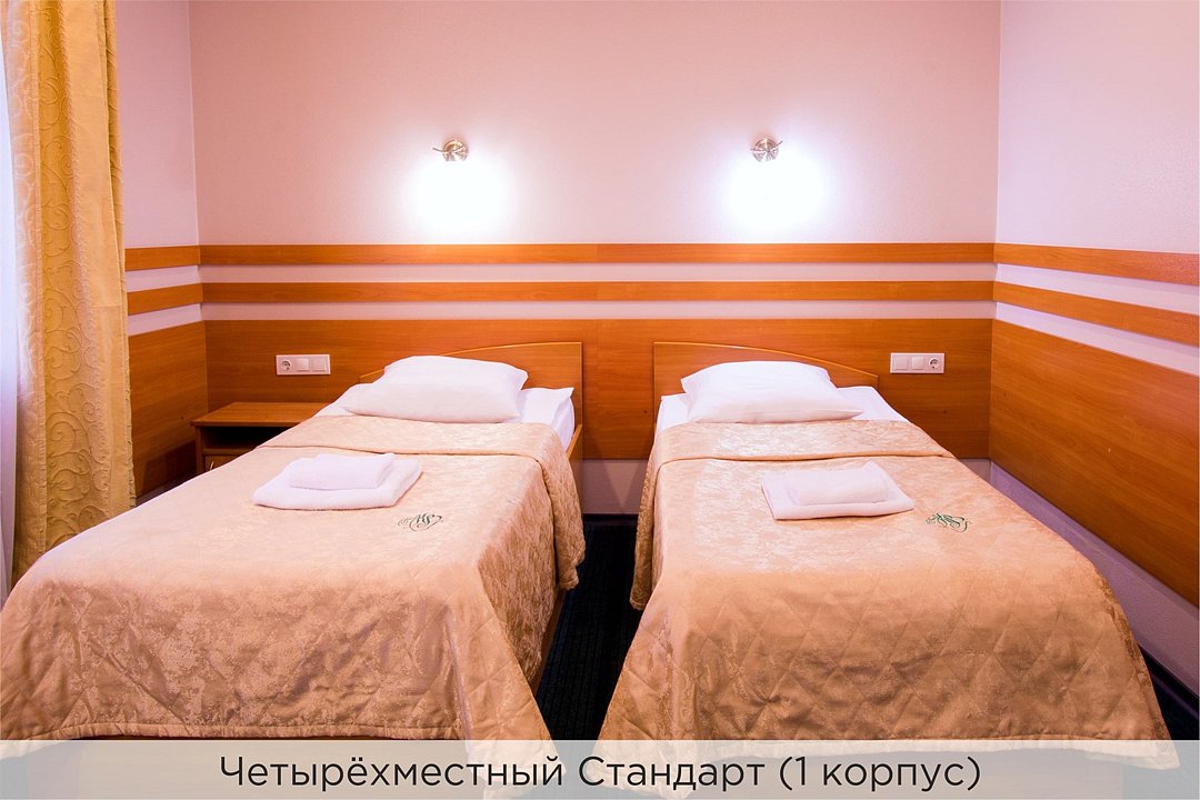 Номера категории "4 местный стандарт" - это отличное сочетание цены и качества. Номер состоит из спальной комнаты, небольшого холла и санузла. Стены номера оформлены в пастельных тонах, ковровое покрытие на полу. Номера данной категории расположены в 1 корпусе отеля и оборудованы кондиционером. Проживание с животными в данной категории не предусмотрено. В стоимость проживания, в номере любой категории, входит: - завтрак «Шведский стол» с 7.00 до 11.00 (согласно выбранному тарифу). - посещение 25-метрового бассейна* с 7.00 до 21.45 в номерах повышенной категории; с 07.00 до 15.00 в номерах категории "Стандарт" (в остальное время - скидка 20%; с 1.06 по 31.08 бассейн входит в стоимость весь день для всех категорий номеров). - посещение тренажёрного зала, саун (финская и турецкая) с 7.00 до 21.45. - мини-гольф. - интернет Wi-Fi. - Скидка 20% на индивидуальные сауны, мангальные беседки и летнюю площадку для шашлыка. - Пользование площадкой со столиками "Звёздное небо" с возможностью аренды мангала. * Бассейн находится в 1 корпусе отеля. Посещение бассейна осуществляется по предварительной записи в часы работы спортивного комплекса. Для посещения бассейна необходимо иметь купальные принадлежности, тапочки и шапочки. Сеанс плавания в бассейне начинается ровно в каждый час и длится 45 минут. С 1.09 по 31.05 посещение бассейна для гостей отеля недоступно в понедельник, среду и пятницу с 19:00 до 20:00. При заселении в отель каждому гостю необходимо предъявить документ удостоверяющий личность (паспорт). Для детей до 14 лет необходимо предъявление свидетельства о рождении. Для заселения несовершеннолетних детей без родителей необходимо предъявить доверенность (для детей до 14 лет доверенность должна быть на сопровождающее лицо, для детей старше 14 лет доверенность может быть оформлена на ребенка). - С иностранных граждан взимается плата за услуги по оформлению документов для постановки на миграционный учёт в размере 300.00 RUB за весь период проживания с человека.Услуги и удобства