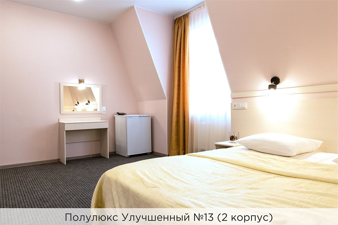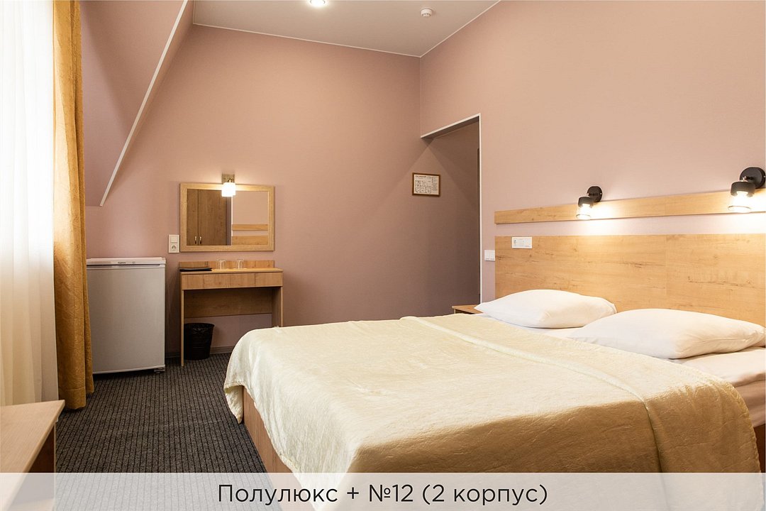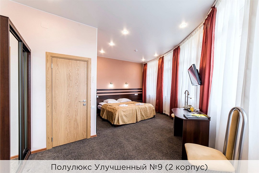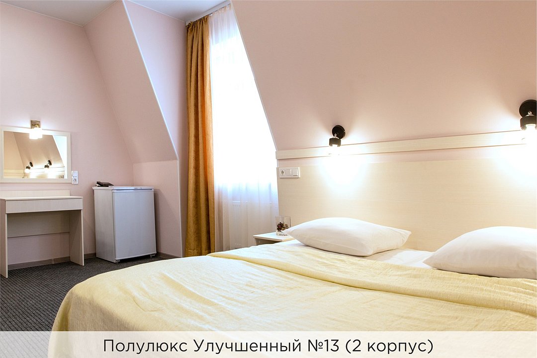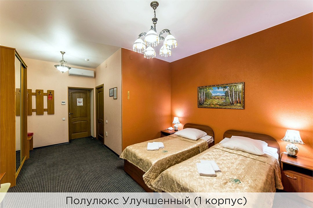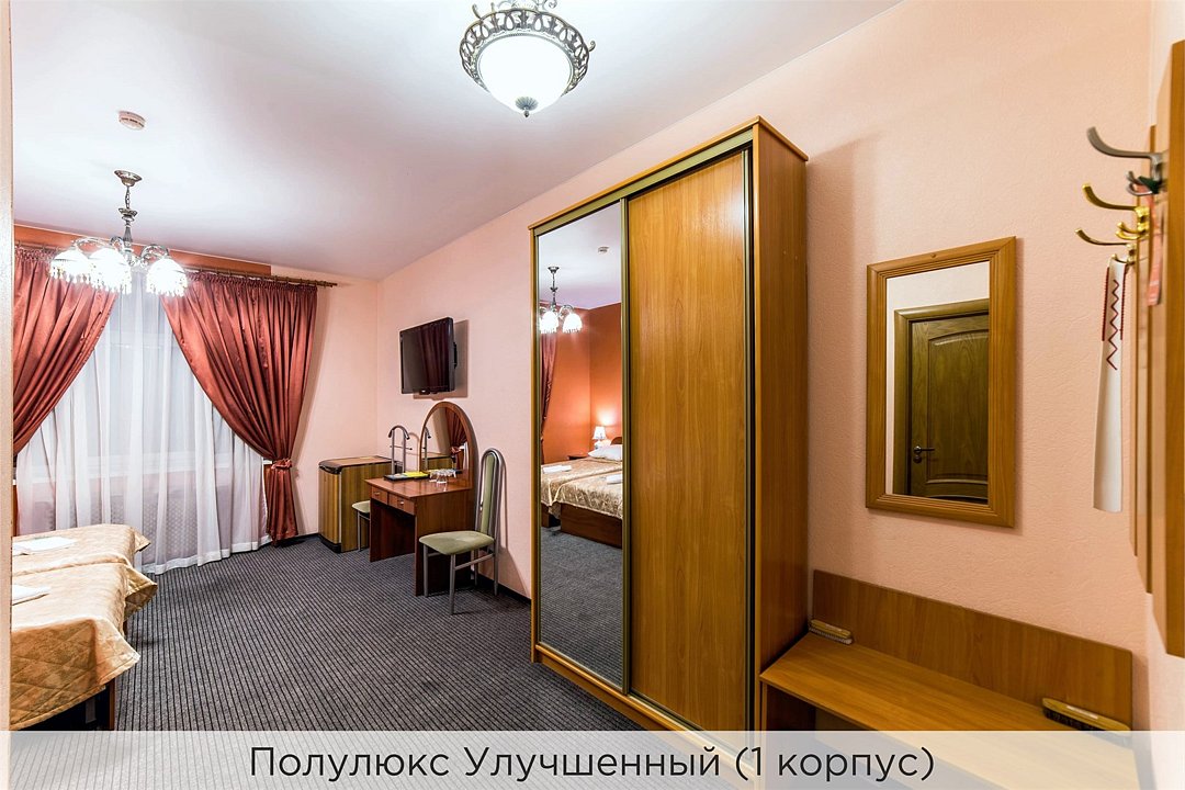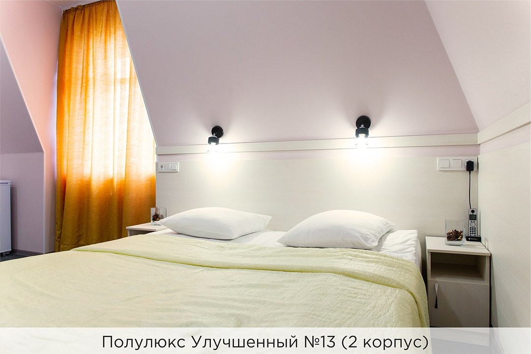 Номера категории "Полулюкс улучшенный" - комфортный 2-х местный номер, состоящий из спальной комнаты с двумя полуторными кроватями (могут стоять вместе или раздельно) или одной двуспальной, небольшого холла и санузла. Номера площадью 23 кв.м. Номера данной категории расположены в 1 и 2 корпусах отеля и оборудованы кондиционером. Проживание с животными в данной категории не предусмотрено. В стоимость проживания, в номере любой категории, входит: - завтрак «Шведский стол» с 7.00 до 11.00 (согласно выбранному тарифу). - посещение 25-метрового бассейна* с 7.00 до 21.45 в номерах повышенной категории; с 07.00 до 15.00 в номерах категории "Стандарт" (в остальное время - скидка 20%; с 1.06 по 31.08 бассейн входит в стоимость весь день для всех категорий номеров). - посещение тренажёрного зала, саун (финская и турецкая) с 7.00 до 21.45. - мини-гольф. - интернет Wi-Fi. - Скидка 20% на индивидуальные сауны, мангальные беседки и летнюю площадку для шашлыка. - Пользование площадкой со столиками "Звёздное небо" с возможностью аренды мангала. * Бассейн находится в 1 корпусе отеля. Посещение бассейна осуществляется по предварительной записи в часы работы спортивного комплекса. Для посещения бассейна необходимо иметь купальные принадлежности, тапочки и шапочки. Сеанс плавания в бассейне начинается ровно в каждый час и длится 45 минут. С 1.09 по 31.05 посещение бассейна для гостей отеля недоступно в понедельник, среду и пятницу с 19:00 до 20:00. При заселении в отель каждому гостю необходимо предъявить документ удостоверяющий личность (паспорт). Для детей до 14 лет необходимо предъявление свидетельства о рождении. Для заселения несовершеннолетних детей без родителей необходимо предъявить доверенность (для детей до 14 лет доверенность должна быть на сопровождающее лицо, для детей старше 14 лет доверенность может быть оформлена на ребенка). - С иностранных граждан взимается плата за услуги по оформлению документов для постановки на миграционный учёт в размере 300.00 RUB за весь период проживания с человека.Услуги и удобства