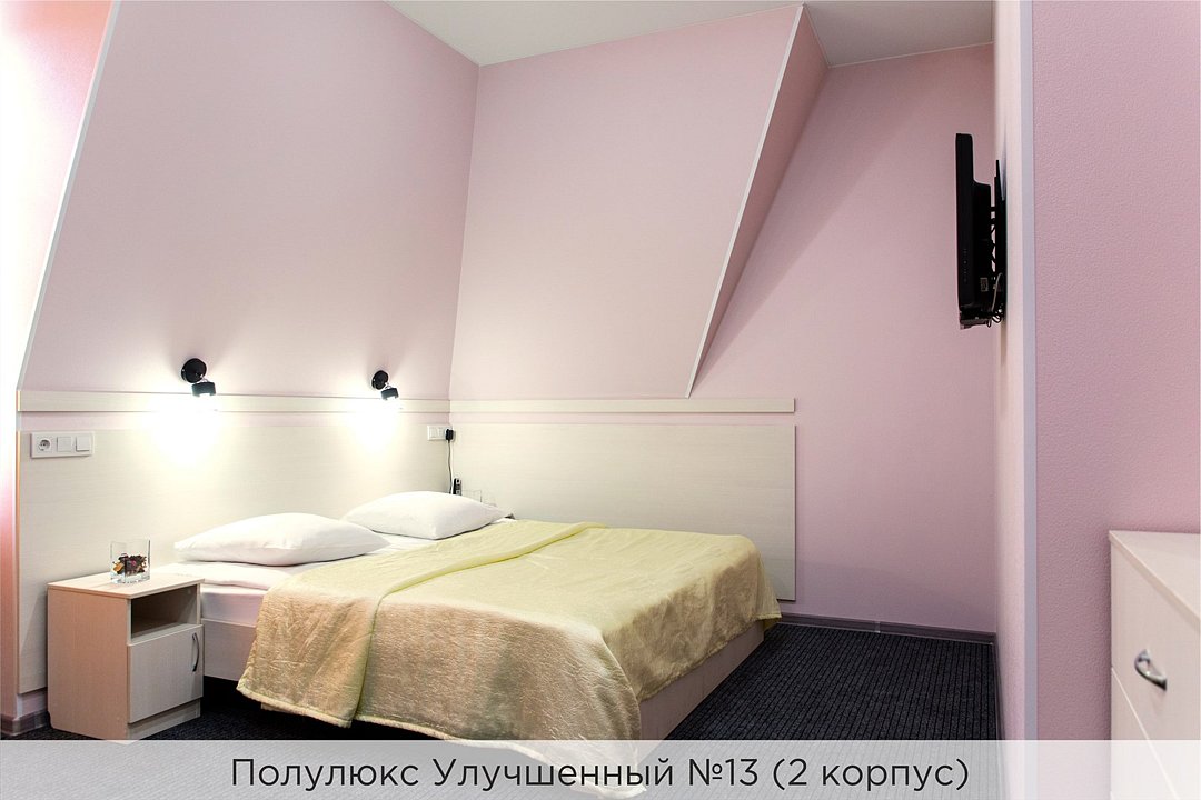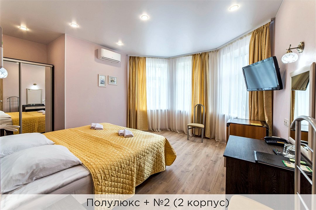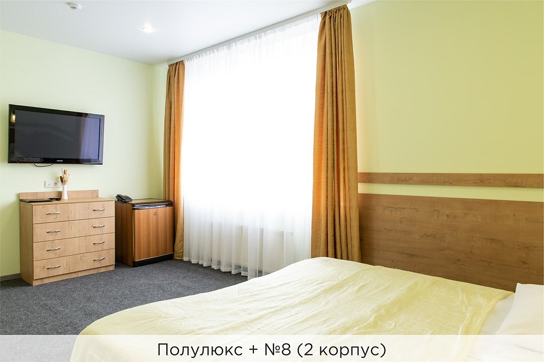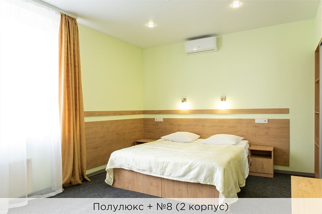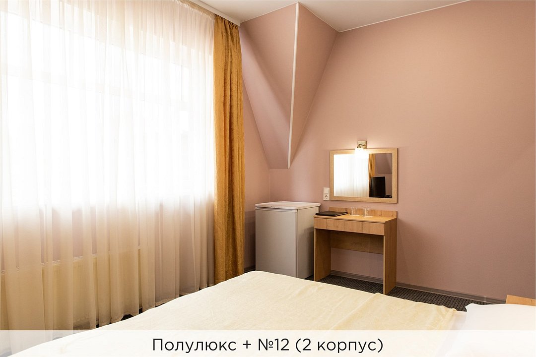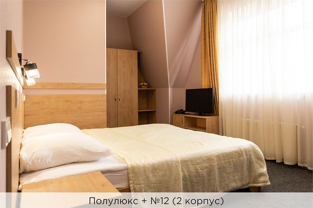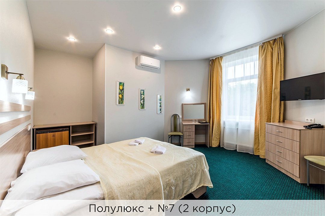 Номера категории "Полулюкс улучшенный" - комфортный 2-х местный номер, состоящий из спальной комнаты с двумя полуторными кроватями (могут стоять вместе или раздельно) или одной двуспальной, небольшого холла и санузла. Номера площадью 23 кв.м. Номера данной категории расположены в 1 и 2 корпусах отеля и оборудованы кондиционером. Проживание с животными в данной категории не предусмотрено. В стоимость проживания, в номере любой категории, входит: - завтрак «Шведский стол» с 7.00 до 11.00 (согласно выбранному тарифу). - посещение 25-метрового бассейна* с 7.00 до 21.45 в номерах повышенной категории; с 07.00 до 15.00 в номерах категории "Стандарт" (в остальное время - скидка 20%; с 1.06 по 31.08 бассейн входит в стоимость весь день для всех категорий номеров). - посещение тренажёрного зала, саун (финская и турецкая) с 7.00 до 21.45. - мини-гольф. - интернет Wi-Fi. - Скидка 20% на индивидуальные сауны, мангальные беседки и летнюю площадку для шашлыка. - Пользование площадкой со столиками "Звёздное небо" с возможностью аренды мангала. * Бассейн находится в 1 корпусе отеля. Посещение бассейна осуществляется по предварительной записи в часы работы спортивного комплекса. Для посещения бассейна необходимо иметь купальные принадлежности, тапочки и шапочки. Сеанс плавания в бассейне начинается ровно в каждый час и длится 45 минут. С 1.09 по 31.05 посещение бассейна для гостей отеля недоступно в понедельник, среду и пятницу с 19:00 до 20:00. При заселении в отель каждому гостю необходимо предъявить документ удостоверяющий личность (паспорт). Для детей до 14 лет необходимо предъявление свидетельства о рождении. Для заселения несовершеннолетних детей без родителей необходимо предъявить доверенность (для детей до 14 лет доверенность должна быть на сопровождающее лицо, для детей старше 14 лет доверенность может быть оформлена на ребенка). - С иностранных граждан взимается плата за услуги по оформлению документов для постановки на миграционный учёт в размере 300.00 RUB за весь период проживания с человека.Услуги и удобства