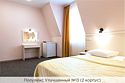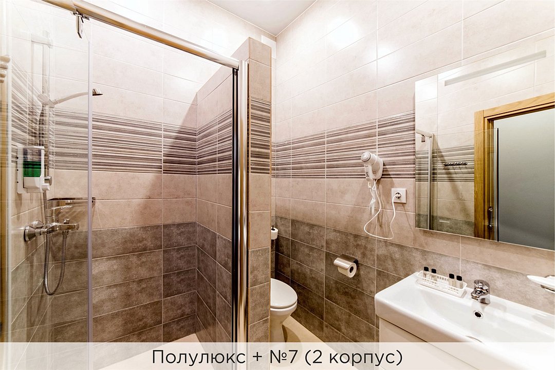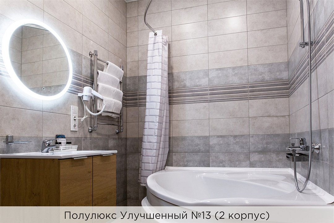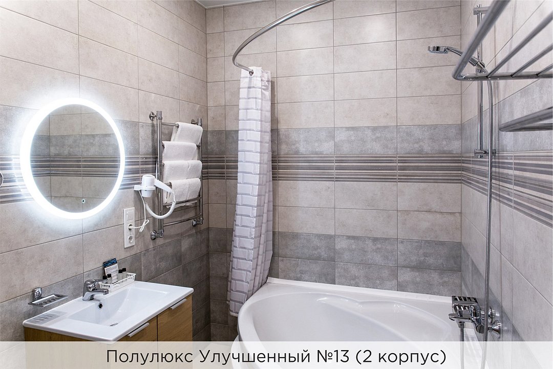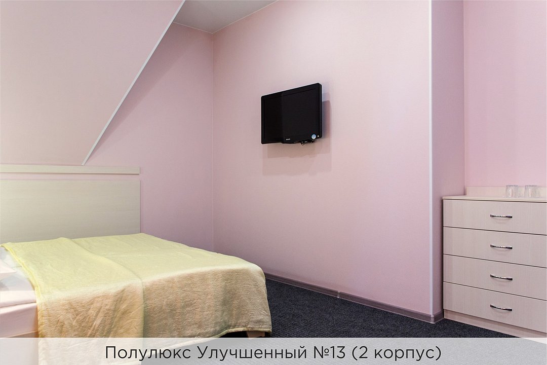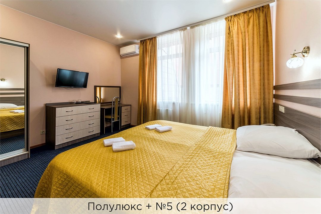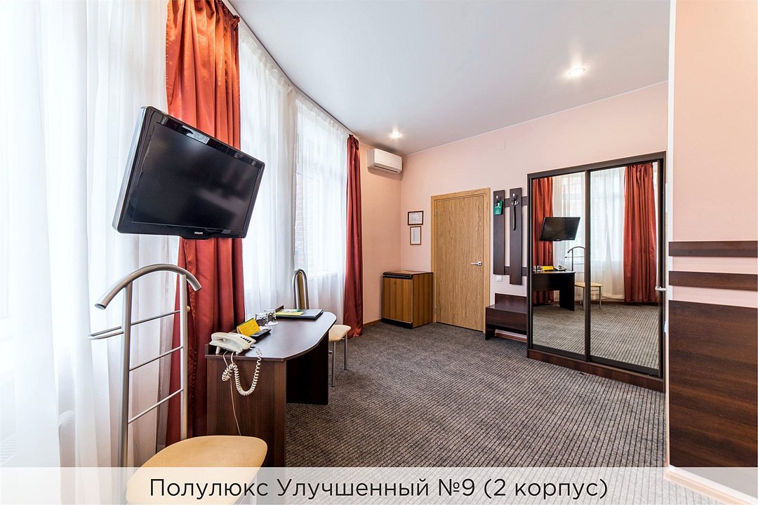 Номера категории "Полулюкс улучшенный" - комфортный 2-х местный номер, состоящий из спальной комнаты с двумя полуторными кроватями (могут стоять вместе или раздельно) или одной двуспальной, небольшого холла и санузла. Номера площадью 23 кв.м. Номера данной категории расположены в 1 и 2 корпусах отеля и оборудованы кондиционером. Проживание с животными в данной категории не предусмотрено. В стоимость проживания, в номере любой категории, входит: - завтрак «Шведский стол» с 7.00 до 11.00 (согласно выбранному тарифу). - посещение 25-метрового бассейна* с 7.00 до 21.45 в номерах повышенной категории; с 07.00 до 15.00 в номерах категории "Стандарт" (в остальное время - скидка 20%; с 1.06 по 31.08 бассейн входит в стоимость весь день для всех категорий номеров). - посещение тренажёрного зала, саун (финская и турецкая) с 7.00 до 21.45. - мини-гольф. - интернет Wi-Fi. - Скидка 20% на индивидуальные сауны, мангальные беседки и летнюю площадку для шашлыка. - Пользование площадкой со столиками "Звёздное небо" с возможностью аренды мангала. * Бассейн находится в 1 корпусе отеля. Посещение бассейна осуществляется по предварительной записи в часы работы спортивного комплекса. Для посещения бассейна необходимо иметь купальные принадлежности, тапочки и шапочки. Сеанс плавания в бассейне начинается ровно в каждый час и длится 45 минут. С 1.09 по 31.05 посещение бассейна для гостей отеля недоступно в понедельник, среду и пятницу с 19:00 до 20:00. При заселении в отель каждому гостю необходимо предъявить документ удостоверяющий личность (паспорт). Для детей до 14 лет необходимо предъявление свидетельства о рождении. Для заселения несовершеннолетних детей без родителей необходимо предъявить доверенность (для детей до 14 лет доверенность должна быть на сопровождающее лицо, для детей старше 14 лет доверенность может быть оформлена на ребенка). - С иностранных граждан взимается плата за услуги по оформлению документов для постановки на миграционный учёт в размере 300.00 RUB за весь период проживания с человека.Услуги и удобства