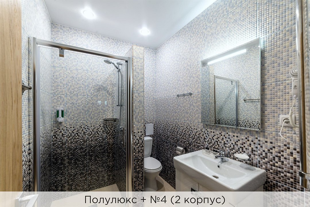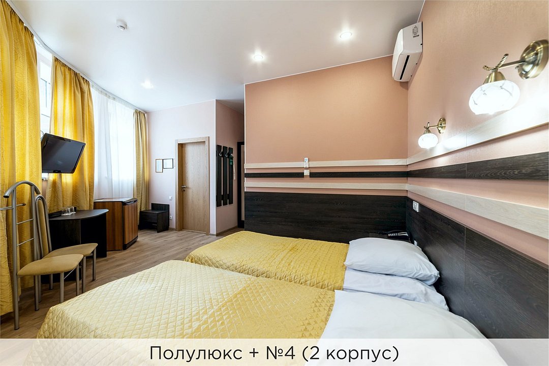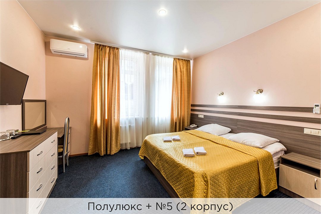 Номер категории "Полулюкс+" - комфортный 2-х местный номер, состоящий из спальной комнаты с двумя полуторными кроватями (могут стоять вместе или раздельно) или одной двуспальной, небольшого холла и санузла. Номера данной категории расположены во 2 корпусе отеля и оборудованы кондиционером. Проживание с животными в данной категории не предусмотрено. В стоимость проживания, в номере любой категории, входит: - завтрак «Шведский стол» с 7.00 до 11.00 (согласно выбранному тарифу). - посещение 25-метрового бассейна* с 7.00 до 21.45 в номерах повышенной категории; с 07.00 до 15.00 в номерах категории "Стандарт" (в остальное время - скидка 20%; с 1.06 по 31.08 бассейн входит в стоимость весь день для всех категорий номеров). - посещение тренажёрного зала, саун (финская и турецкая) с 7.00 до 21.45. - мини-гольф. - интернет Wi-Fi. - Скидка 20% на индивидуальные сауны, мангальные беседки и летнюю площадку для шашлыка. - Пользование площадкой со столиками "Звёздное небо" с возможностью аренды мангала. * Бассейн находится в 1 корпусе отеля. Посещение бассейна осуществляется по предварительной записи в часы работы спортивного комплекса. Для посещения бассейна необходимо иметь купальные принадлежности, тапочки и шапочки. Сеанс плавания в бассейне начинается ровно в каждый час и длится 45 минут. С 1.09 по 31.05 посещение бассейна для гостей отеля недоступно в понедельник, среду и пятницу с 19:00 до 20:00. При заселении в отель каждому гостю необходимо предъявить документ удостоверяющий личность (паспорт). Для детей до 14 лет необходимо предъявление свидетельства о рождении. Для заселения несовершеннолетних детей без родителей необходимо предъявить доверенность (для детей до 14 лет доверенность должна быть на сопровождающее лицо, для детей старше 14 лет доверенность может быть оформлена на ребенка). - С иностранных граждан взимается плата за услуги по оформлению документов для постановки на миграционный учёт в размере 300.00 RUB за весь период проживания с человека.Услуги и удобства