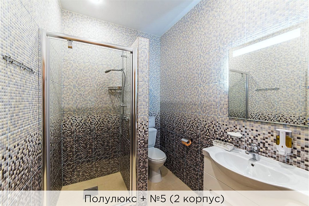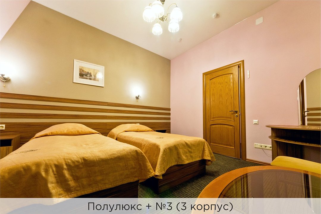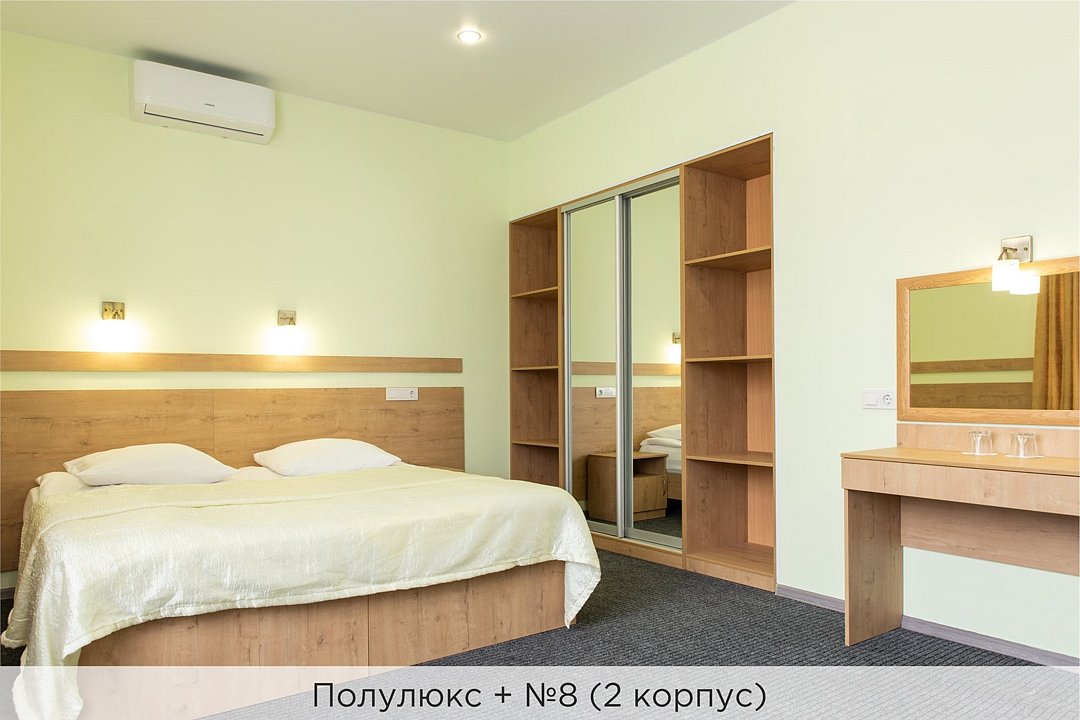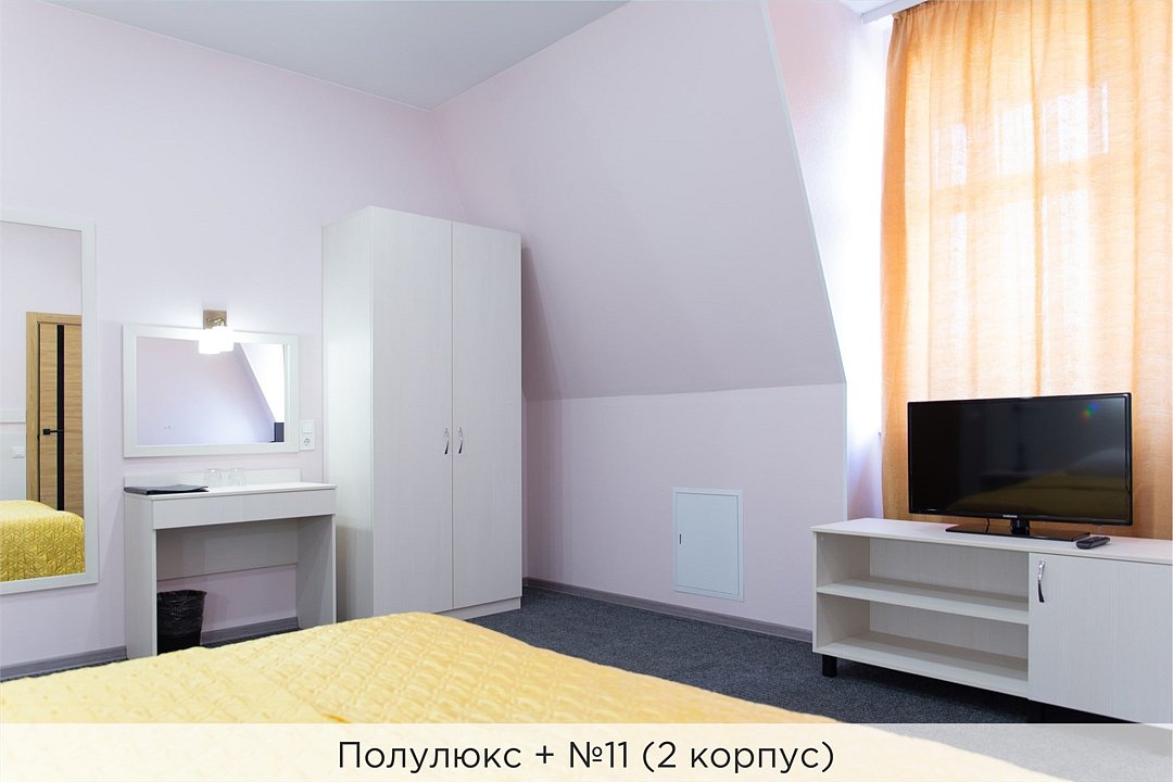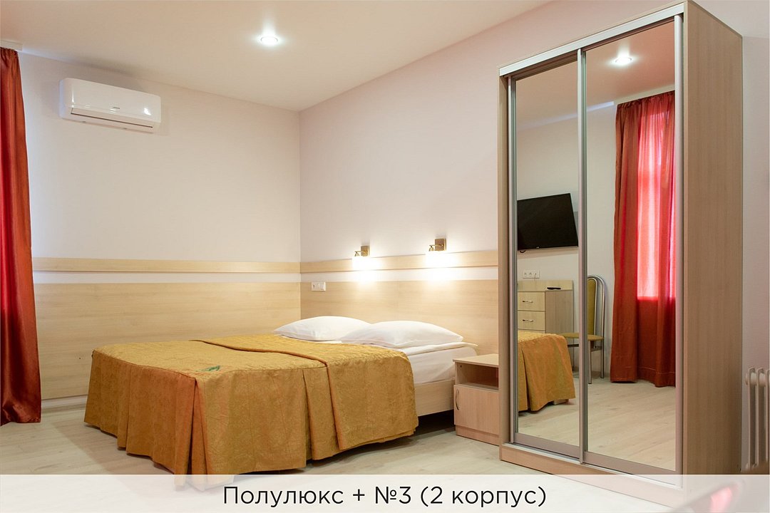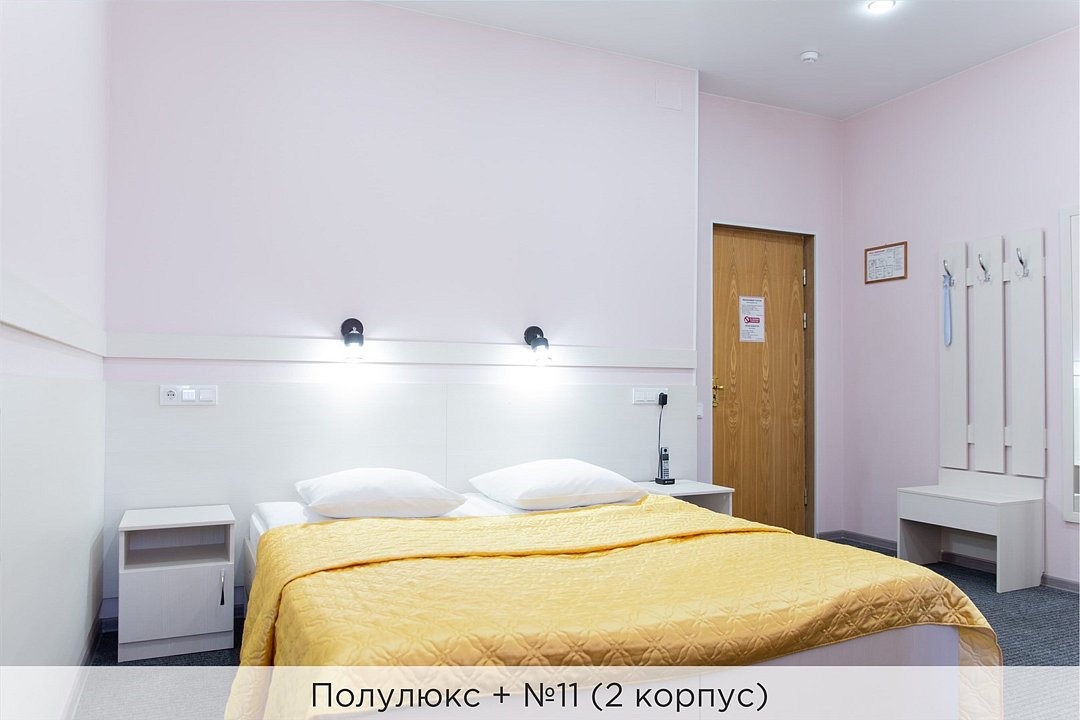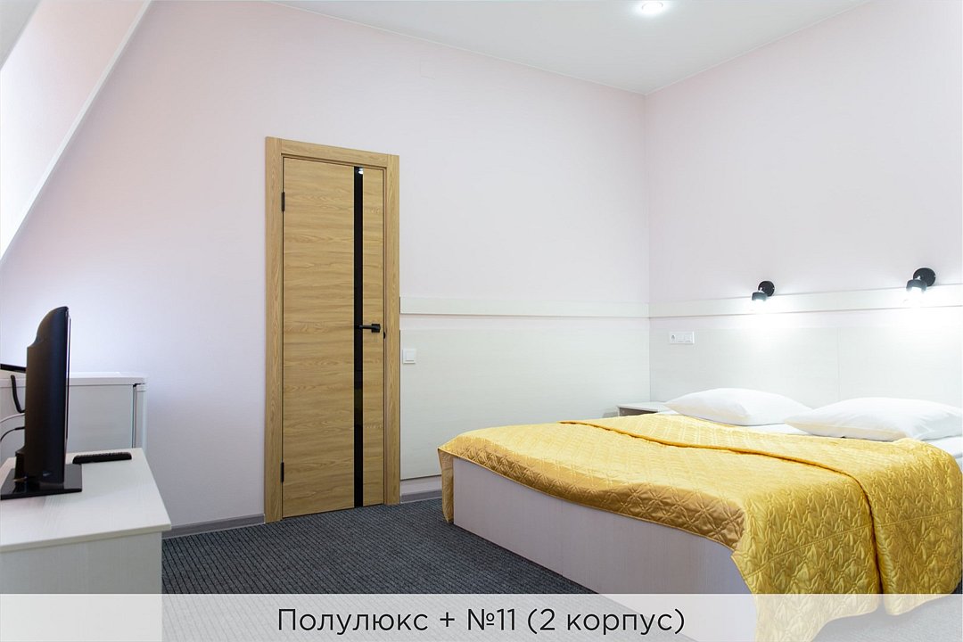 Номера категории "Полулюкс+" - комфортный 2-х местный номер, состоящий из спальной комнаты с двумя полуторными кроватями (могут стоять вместе или раздельно) или одной двуспальной (с единым наматрасником), небольшого холла и санузла. В №11 и №12 (2 корпус) установлены 2 раздельные кровати. Номера данной категории расположены во 2 корпусе (№3, №8, №11, 12) и в 3 корпусе (№1, №3) отеля. Номера на 2 корпусе оборудованы кондиционерами. (№1 и №3 на 3 корпусе не оборудованы кондиционерами). Проживание с животными в данной категории не предусмотрено. В стоимость проживания, в номере любой категории, входит: - завтрак «Шведский стол» с 7.00 до 11.00 (согласно выбранному тарифу). - посещение 25-метрового бассейна* с 7.00 до 21.45 в номерах повышенной категории; с 07.00 до 15.00 в номерах категории "Стандарт" (в остальное время - скидка 20%; с 1.06 по 31.08 бассейн входит в стоимость весь день для всех категорий номеров). - посещение тренажёрного зала, саун (финская и турецкая) с 7.00 до 21.45. - мини-гольф. - интернет Wi-Fi. - Скидка 20% на индивидуальные сауны, мангальные беседки и летнюю площадку для шашлыка. - Пользование площадкой со столиками "Звёздное небо" с возможностью аренды мангала. * Бассейн находится в 1 корпусе отеля. Посещение бассейна осуществляется по предварительной записи в часы работы спортивного комплекса. Для посещения бассейна необходимо иметь купальные принадлежности, тапочки и шапочки. Сеанс плавания в бассейне начинается ровно в каждый час и длится 45 минут. С 1.09 по 31.05 посещение бассейна для гостей отеля недоступно в понедельник, среду и пятницу с 19:00 до 20:00. При заселении в отель каждому гостю необходимо предъявить документ удостоверяющий личность (паспорт). Для детей до 14 лет необходимо предъявление свидетельства о рождении. Для заселения несовершеннолетних детей без родителей необходимо предъявить доверенность (для детей до 14 лет доверенность должна быть на сопровождающее лицо, для детей старше 14 лет доверенность может быть оформлена на ребенка). - С иностранных граждан взимается плата за услуги по оформлению документов для постановки на миграционный учёт в размере 300.00 RUB за весь период проживания с человека.Услуги и удобства