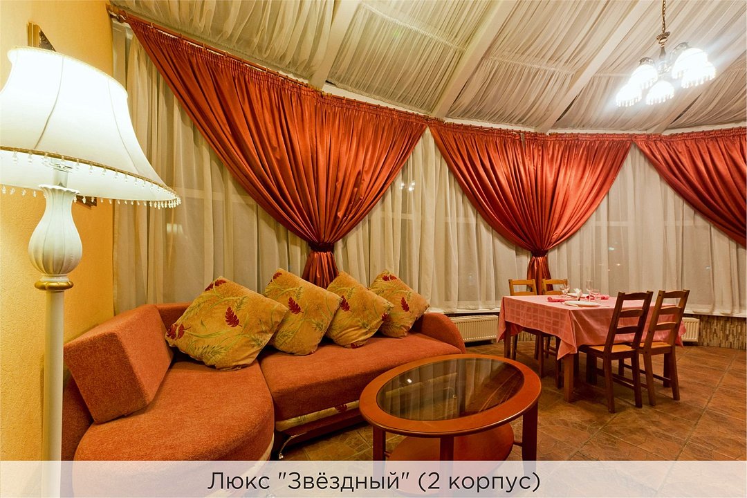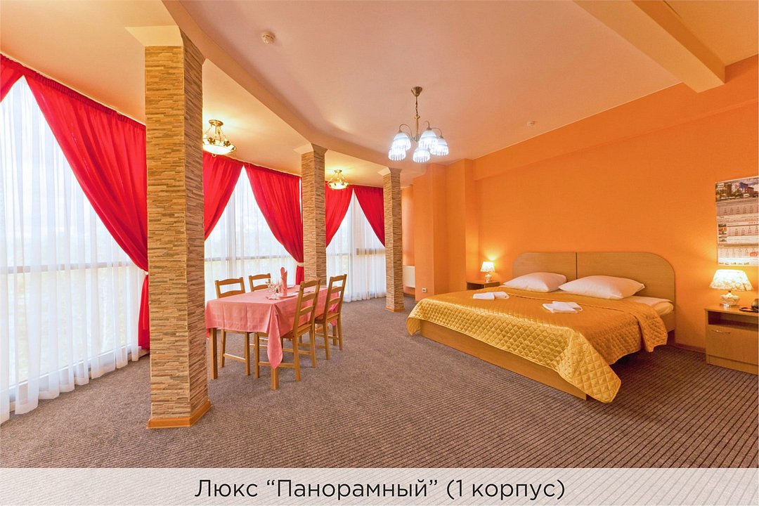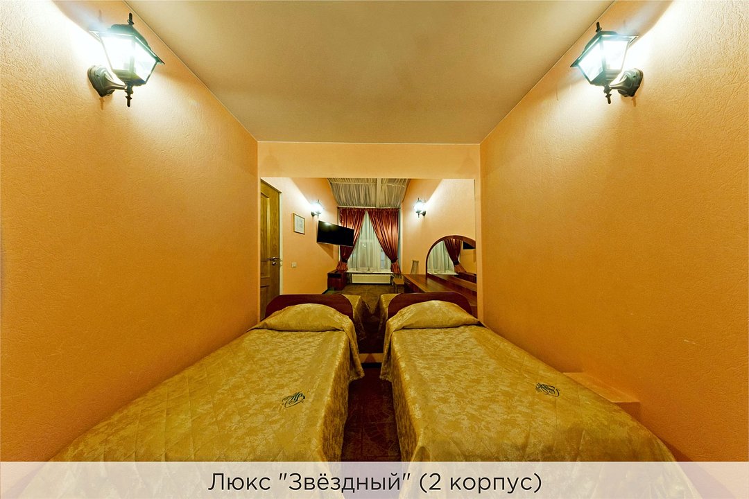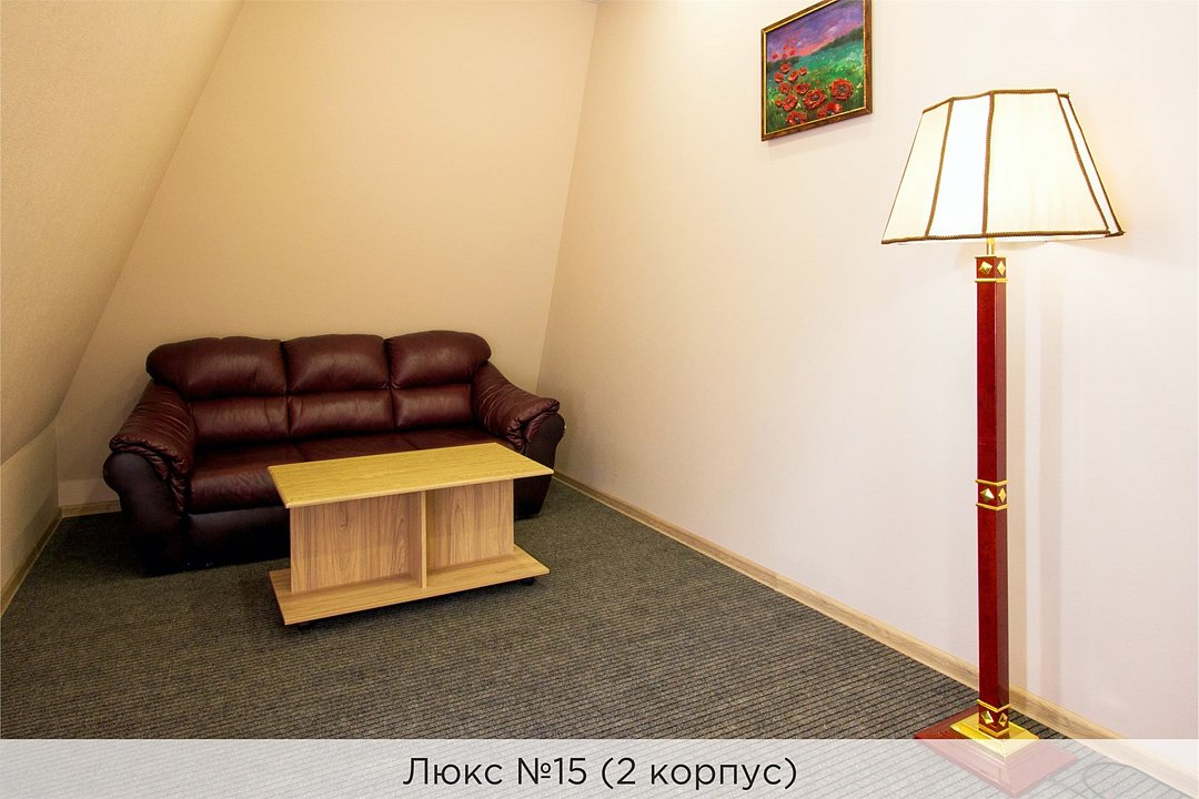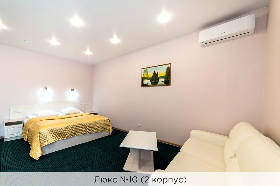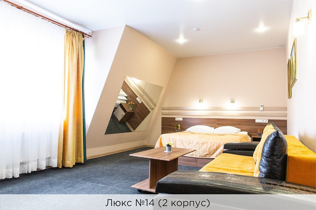 Площадь номеров 25-30 кв.м. Номера расположены во 2 корпусе и оборудованы кондиционером. Люкс №10 - уютный номер, состоящий из спальной комнаты с одной двуспальной кроватью (или двумя полуторными кроватями), небольшого холла и совмещенного санузла с ванной. Площадь номера - 25 кв.м. Номер расположен во 2 корпусе гостиничного комплекса. Уютный двухкомнатный Люкс №15 с двуспальной кроватью, состоящий из просторной спальной комнаты, гостиной с диваном, небольшого холла и совмещенного санузла. Уютный однокомнатный Люкс №14 с двуспальной кроватью и кожаным диваном, выполнен в пастельных тонах. Номер состоит из просторной спальной комнаты, небольшого холла и совмещенного санузла. Проживание с животными в данной категории не предусмотрено. В стоимость проживания, в номере любой категории, входит: - завтрак «Шведский стол» с 7.00 до 11.00 (согласно выбранному тарифу). - посещение 25-метрового бассейна* с 7.00 до 21.45 в номерах повышенной категории; с 07.00 до 15.00 в номерах категории "Стандарт" (в остальное время - скидка 20%; с 1.06 по 31.08 бассейн входит в стоимость весь день для всех категорий номеров). - посещение тренажёрного зала, саун (финская и турецкая) с 7.00 до 21.45. - мини-гольф. - интернет Wi-Fi. - Скидка 20% на индивидуальные сауны, мангальные беседки и летнюю площадку для шашлыка. - Пользование площадкой со столиками "Звёздное небо" с возможностью аренды мангала. * Бассейн находится в 1 корпусе отеля. Посещение бассейна осуществляется по предварительной записи в часы работы спортивного комплекса. Для посещения бассейна необходимо иметь купальные принадлежности, тапочки и шапочки. Сеанс плавания в бассейне начинается ровно в каждый час и длится 45 минут. С 1.09 по 31.05 посещение бассейна для гостей отеля недоступно в понедельник, среду и пятницу с 19:00 до 20:00. При заселении в отель каждому гостю необходимо предъявить документ удостоверяющий личность (паспорт). Для детей до 14 лет необходимо предъявление свидетельства о рождении. Для заселения несовершеннолетних детей без родителей необходимо предъявить доверенность (для детей до 14 лет доверенность должна быть на сопровождающее лицо, для детей старше 14 лет доверенность может быть оформлена на ребенка). - С иностранных граждан взимается плата за услуги по оформлению документов для постановки на миграционный учёт в размере 300.00 RUB за весь период проживания с человека.Услуги и удобства