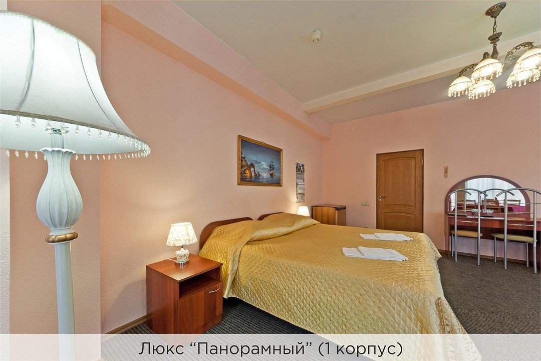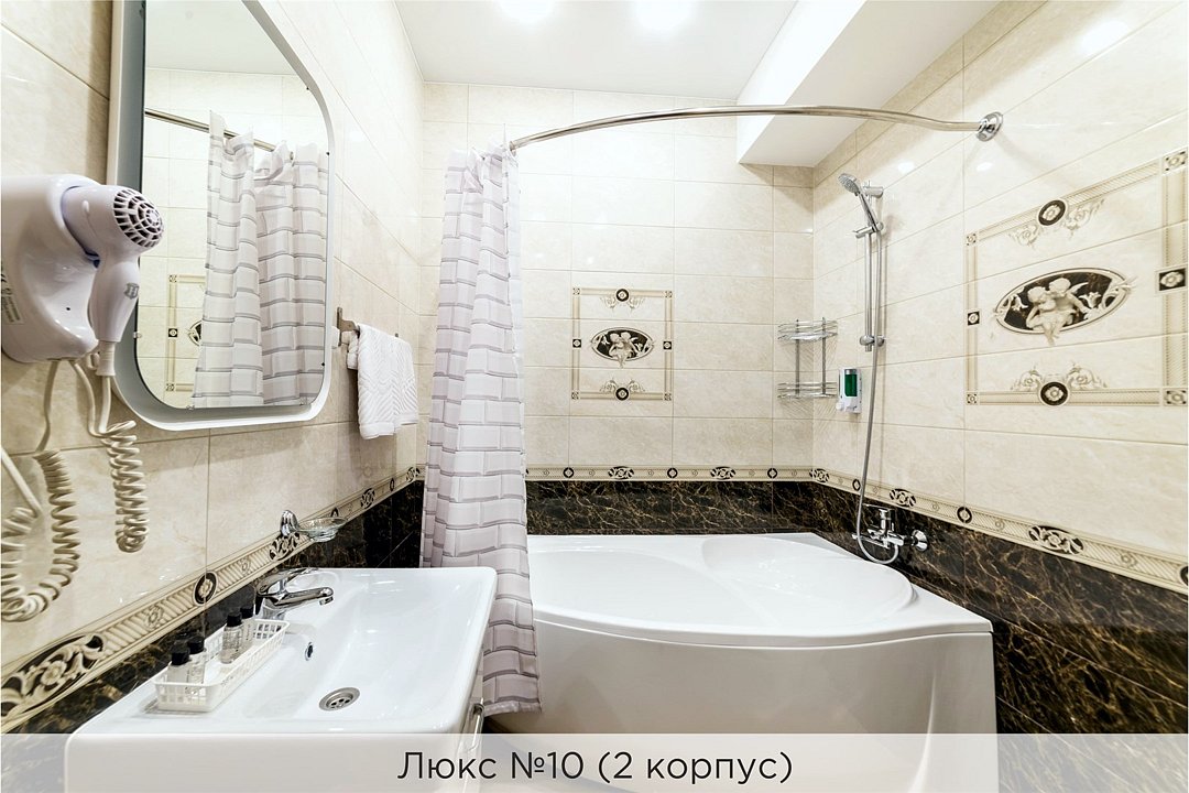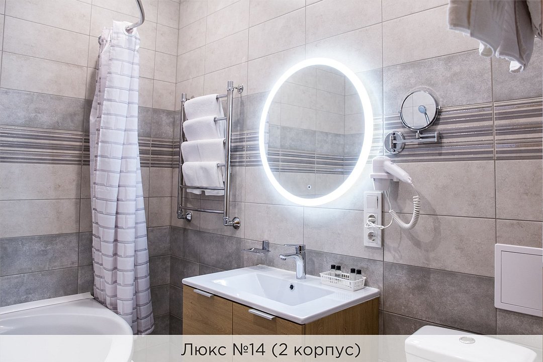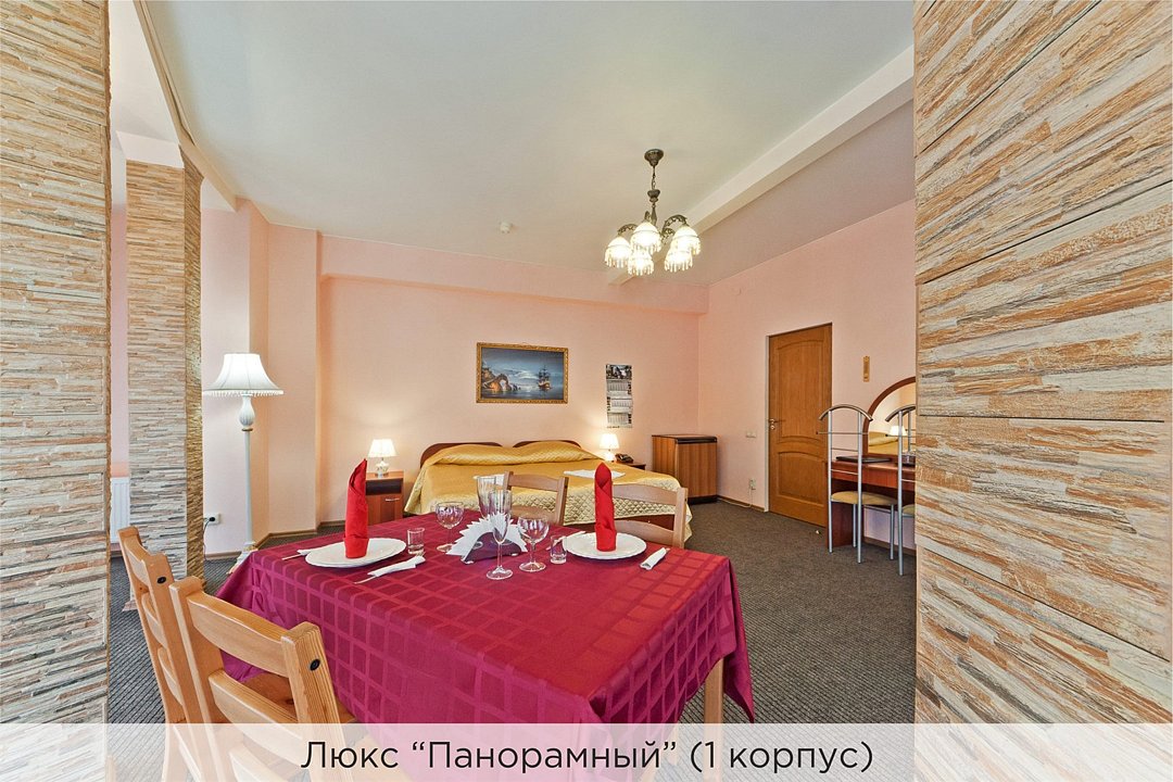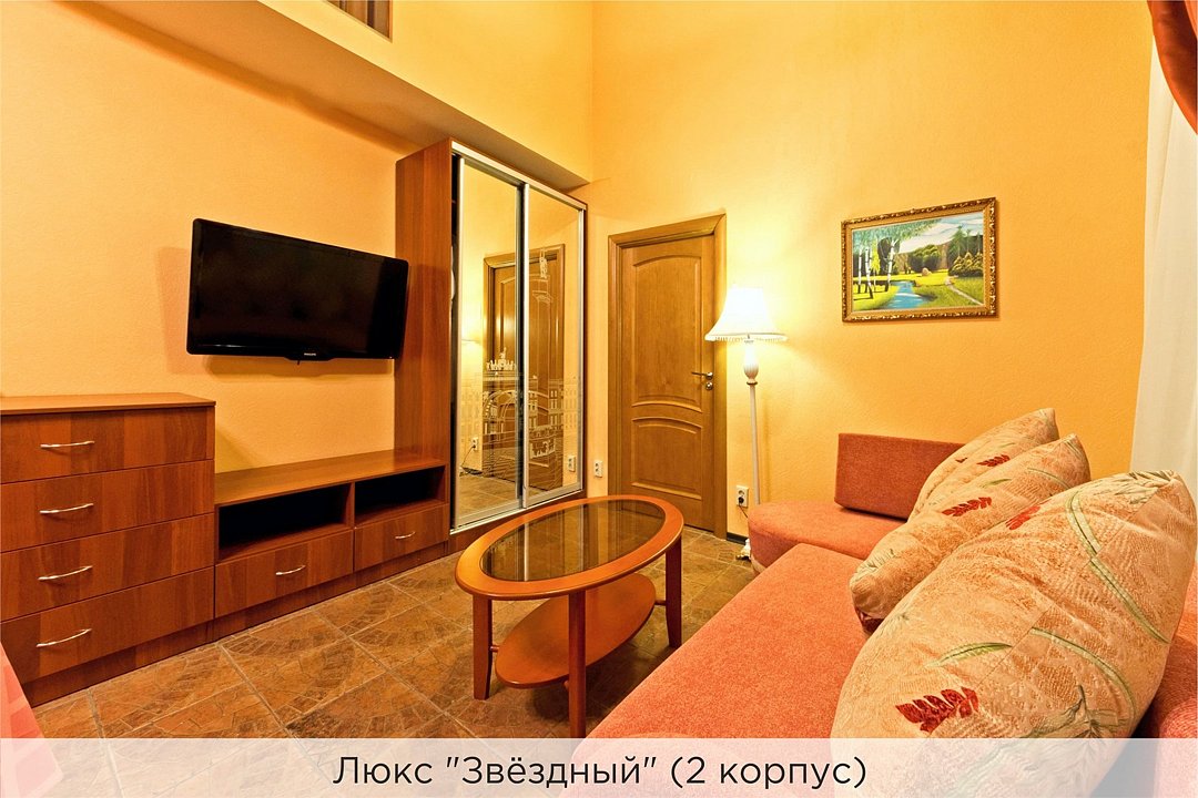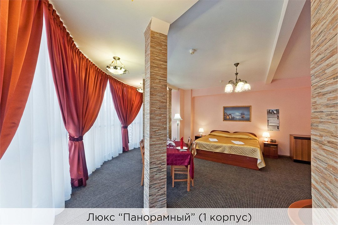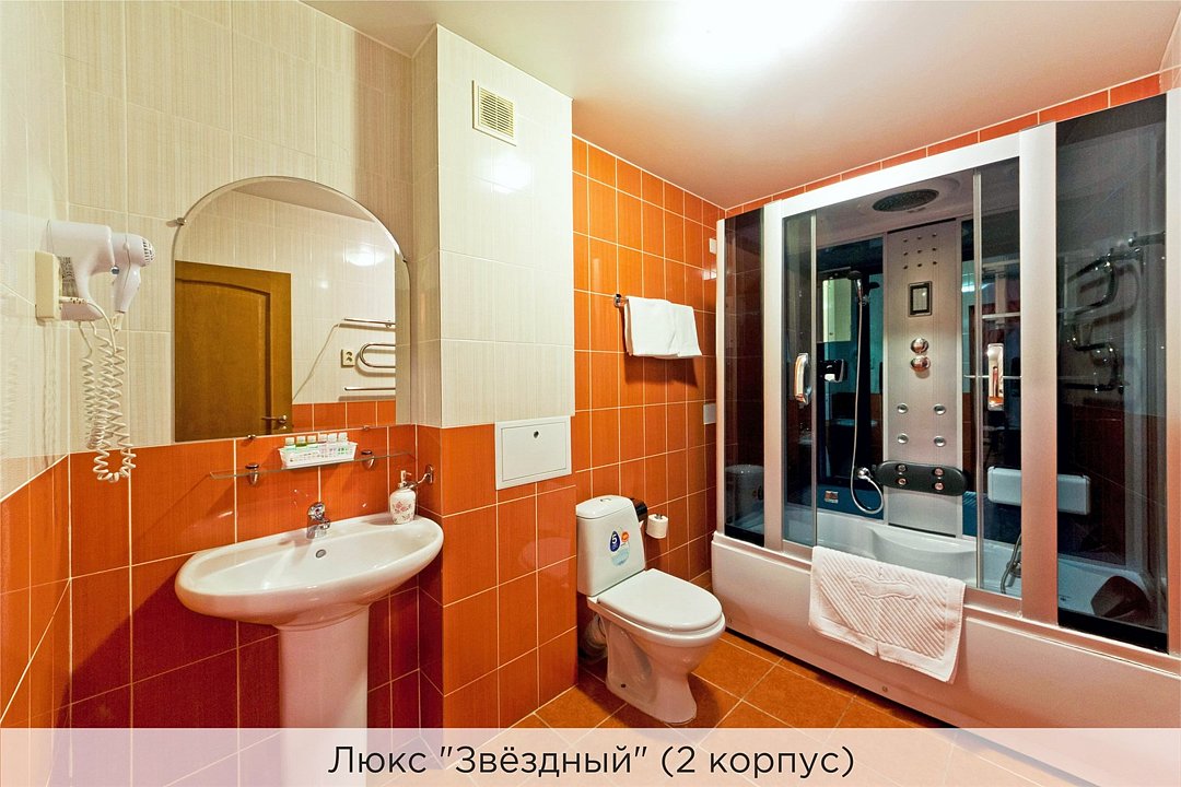 Площадь номеров 25-30 кв.м. Номера расположены во 2 корпусе и оборудованы кондиционером. Люкс №10 - уютный номер, состоящий из спальной комнаты с одной двуспальной кроватью (или двумя полуторными кроватями), небольшого холла и совмещенного санузла с ванной. Площадь номера - 25 кв.м. Номер расположен во 2 корпусе гостиничного комплекса. Уютный двухкомнатный Люкс №15 с двуспальной кроватью, состоящий из просторной спальной комнаты, гостиной с диваном, небольшого холла и совмещенного санузла. Уютный однокомнатный Люкс №14 с двуспальной кроватью и кожаным диваном, выполнен в пастельных тонах. Номер состоит из просторной спальной комнаты, небольшого холла и совмещенного санузла. Проживание с животными в данной категории не предусмотрено. В стоимость проживания, в номере любой категории, входит: - завтрак «Шведский стол» с 7.00 до 11.00 (согласно выбранному тарифу). - посещение 25-метрового бассейна* с 7.00 до 21.45 в номерах повышенной категории; с 07.00 до 15.00 в номерах категории "Стандарт" (в остальное время - скидка 20%; с 1.06 по 31.08 бассейн входит в стоимость весь день для всех категорий номеров). - посещение тренажёрного зала, саун (финская и турецкая) с 7.00 до 21.45. - мини-гольф. - интернет Wi-Fi. - Скидка 20% на индивидуальные сауны, мангальные беседки и летнюю площадку для шашлыка. - Пользование площадкой со столиками "Звёздное небо" с возможностью аренды мангала. * Бассейн находится в 1 корпусе отеля. Посещение бассейна осуществляется по предварительной записи в часы работы спортивного комплекса. Для посещения бассейна необходимо иметь купальные принадлежности, тапочки и шапочки. Сеанс плавания в бассейне начинается ровно в каждый час и длится 45 минут. С 1.09 по 31.05 посещение бассейна для гостей отеля недоступно в понедельник, среду и пятницу с 19:00 до 20:00. При заселении в отель каждому гостю необходимо предъявить документ удостоверяющий личность (паспорт). Для детей до 14 лет необходимо предъявление свидетельства о рождении. Для заселения несовершеннолетних детей без родителей необходимо предъявить доверенность (для детей до 14 лет доверенность должна быть на сопровождающее лицо, для детей старше 14 лет доверенность может быть оформлена на ребенка). - С иностранных граждан взимается плата за услуги по оформлению документов для постановки на миграционный учёт в размере 300.00 RUB за весь период проживания с человека.Услуги и удобства