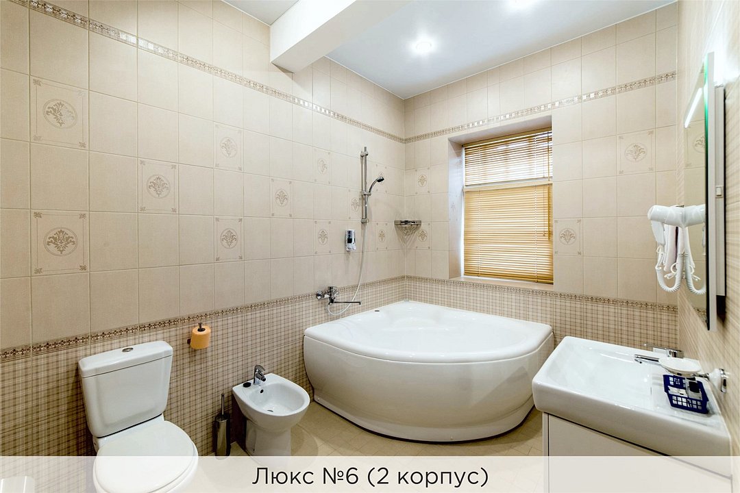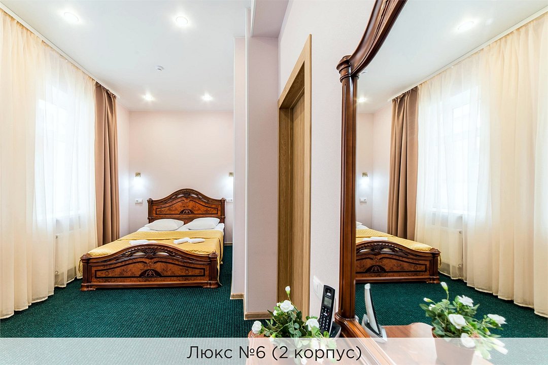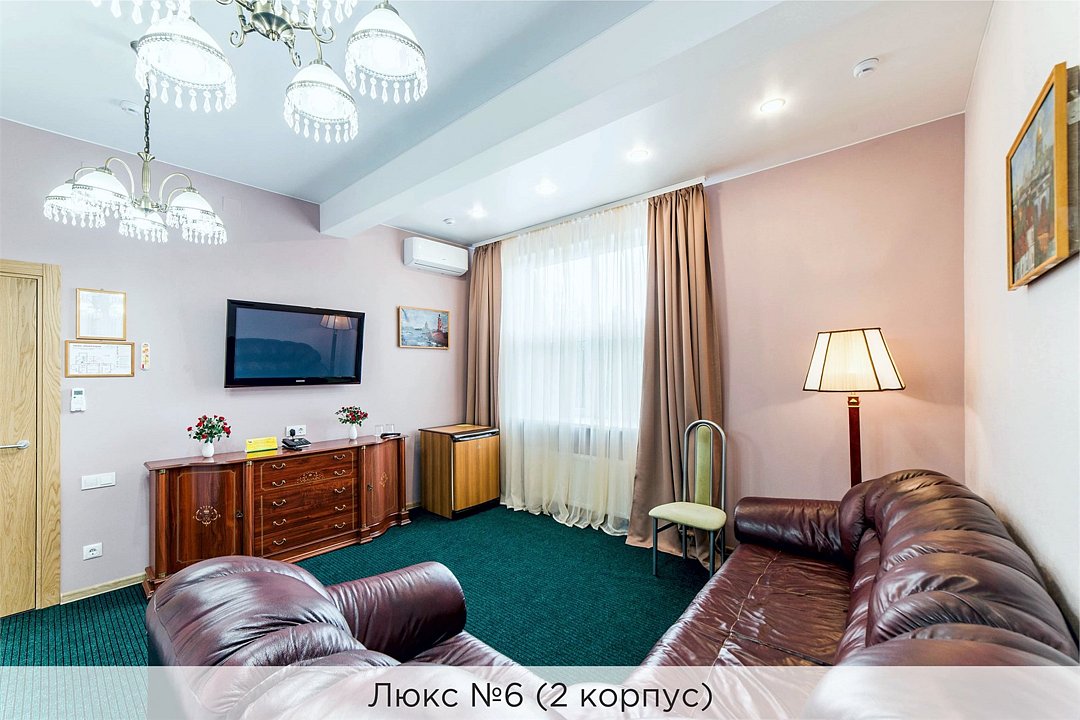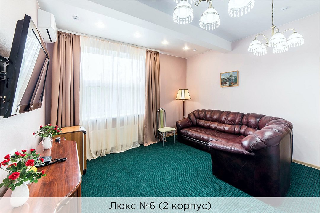 Уютный двухкомнатный Люкс №6 с двуспальной кроватью состоит из спальной комнаты, гостиной с большим кожаным диваном, небольшого холла и совмещенного санузла с джакузи и биде. Номер расположен во 2 корпусе и оборудован кондиционером. Проживание с животными в данной категории не предусмотрено. В стоимость проживания, в номере любой категории, входит: - завтрак «Шведский стол» с 7.00 до 11.00 (согласно выбранному тарифу). - посещение 25-метрового бассейна* с 7.00 до 21.45 в номерах повышенной категории; с 07.00 до 15.00 в номерах категории "Стандарт" (в остальное время - скидка 20%; с 1.06 по 31.08 бассейн входит в стоимость весь день для всех категорий номеров). - посещение тренажёрного зала, саун (финская и турецкая) с 7.00 до 21.45. - мини-гольф. - интернет Wi-Fi. - Скидка 20% на индивидуальные сауны, мангальные беседки и летнюю площадку для шашлыка. - Пользование площадкой со столиками "Звёздное небо" с возможностью аренды мангала. * Бассейн находится в 1 корпусе отеля. Посещение бассейна осуществляется по предварительной записи в часы работы спортивного комплекса. Для посещения бассейна необходимо иметь купальные принадлежности, тапочки и шапочки. Сеанс плавания в бассейне начинается ровно в каждый час и длится 45 минут. С 1.09 по 31.05 посещение бассейна для гостей отеля недоступно в понедельник, среду и пятницу с 19:00 до 20:00. При заселении в отель каждому гостю необходимо предъявить документ удостоверяющий личность (паспорт). Для детей до 14 лет необходимо предъявление свидетельства о рождении. Для заселения несовершеннолетних детей без родителей необходимо предъявить доверенность (для детей до 14 лет доверенность должна быть на сопровождающее лицо, для детей старше 14 лет доверенность может быть оформлена на ребенка). - С иностранных граждан взимается плата за услуги по оформлению документов для постановки на миграционный учёт в размере 300.00 RUB за весь период проживания с человека.Услуги и удобства