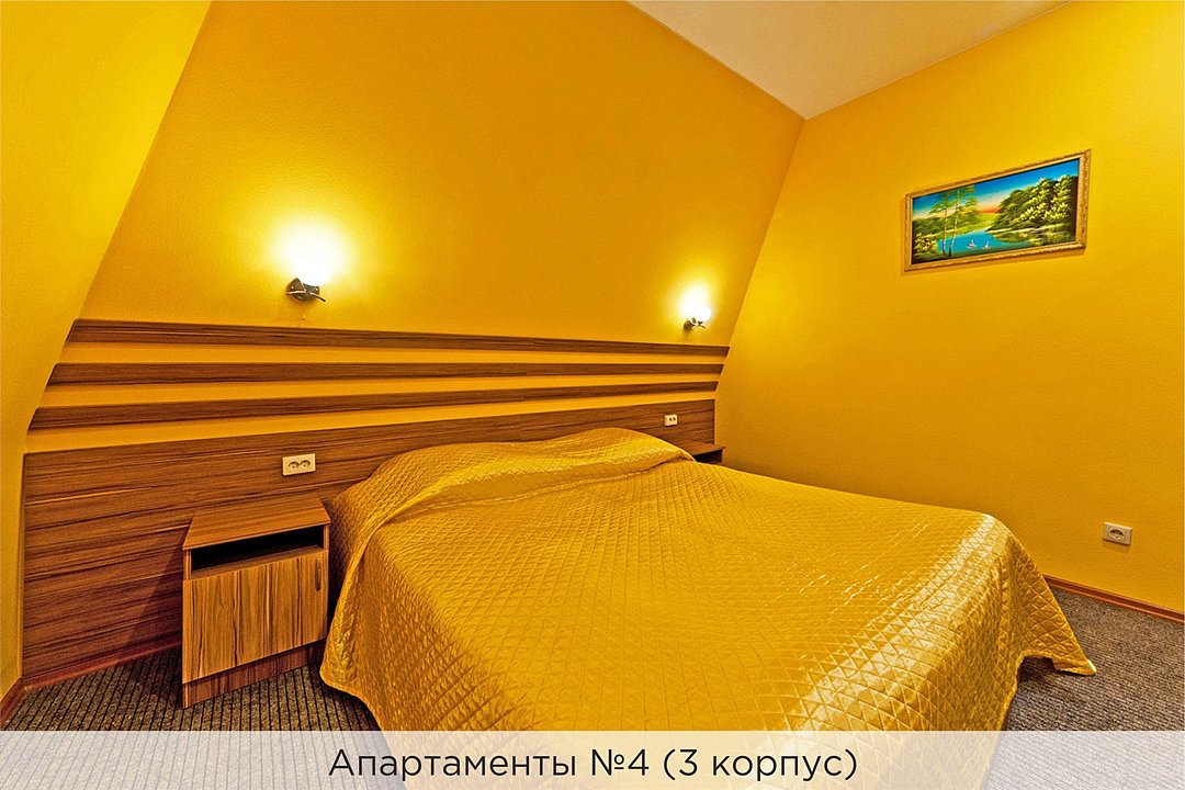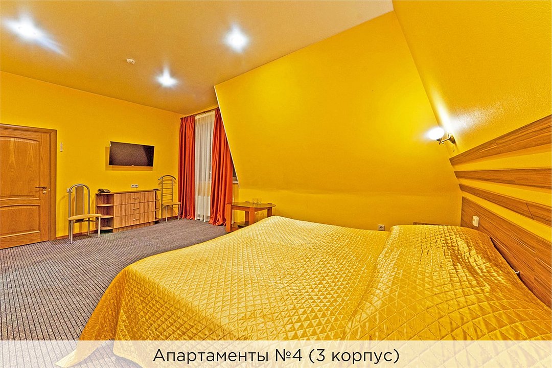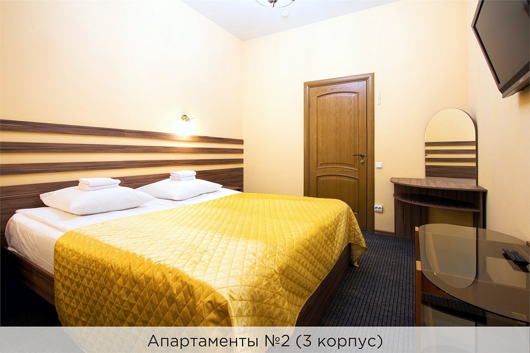 Уютные апартаменты с 1 спальной комнатой (2 кровати могут быть объеденены наматрасником), кухней и совмещенным санузлом. Кухня оборудована варочной панелью, холодильником, эл. чайником, есть вся необходимая посуда. Номер имеет отдельный вход и расположен в 3 корпусе. Не оборудован кондиционером. Проживание с животными в данной категории не предусмотрено. В стоимость проживания, в номере любой категории, входит: - завтрак «Шведский стол» с 7.00 до 11.00 (согласно выбранному тарифу). - посещение 25-метрового бассейна* с 7.00 до 21.45 в номерах повышенной категории; с 07.00 до 15.00 в номерах категории "Стандарт" (в остальное время - скидка 20%; с 1.06 по 31.08 бассейн входит в стоимость весь день для всех категорий номеров). - посещение тренажёрного зала, саун (финская и турецкая) с 7.00 до 21.45. - мини-гольф. - интернет Wi-Fi. - Скидка 20% на индивидуальные сауны, мангальные беседки и летнюю площадку для шашлыка. - Пользование площадкой со столиками "Звёздное небо" с возможностью аренды мангала. * Бассейн находится в 1 корпусе отеля. Посещение бассейна осуществляется по предварительной записи в часы работы спортивного комплекса. Для посещения бассейна необходимо иметь купальные принадлежности, тапочки и шапочки. Сеанс плавания в бассейне начинается ровно в каждый час и длится 45 минут. С 1.09 по 31.05 посещение бассейна для гостей отеля недоступно в понедельник, среду и пятницу с 19:00 до 20:00. При заселении в отель каждому гостю необходимо предъявить документ удостоверяющий личность (паспорт). Для детей до 14 лет необходимо предъявление свидетельства о рождении. Для заселения несовершеннолетних детей без родителей необходимо предъявить доверенность (для детей до 14 лет доверенность должна быть на сопровождающее лицо, для детей старше 14 лет доверенность может быть оформлена на ребенка). - С иностранных граждан взимается плата за услуги по оформлению документов для постановки на миграционный учёт в размере 300.00 RUB за весь период проживания с человека.Услуги и удобства