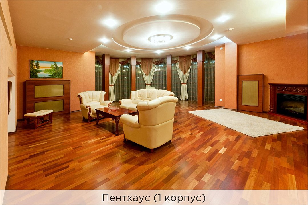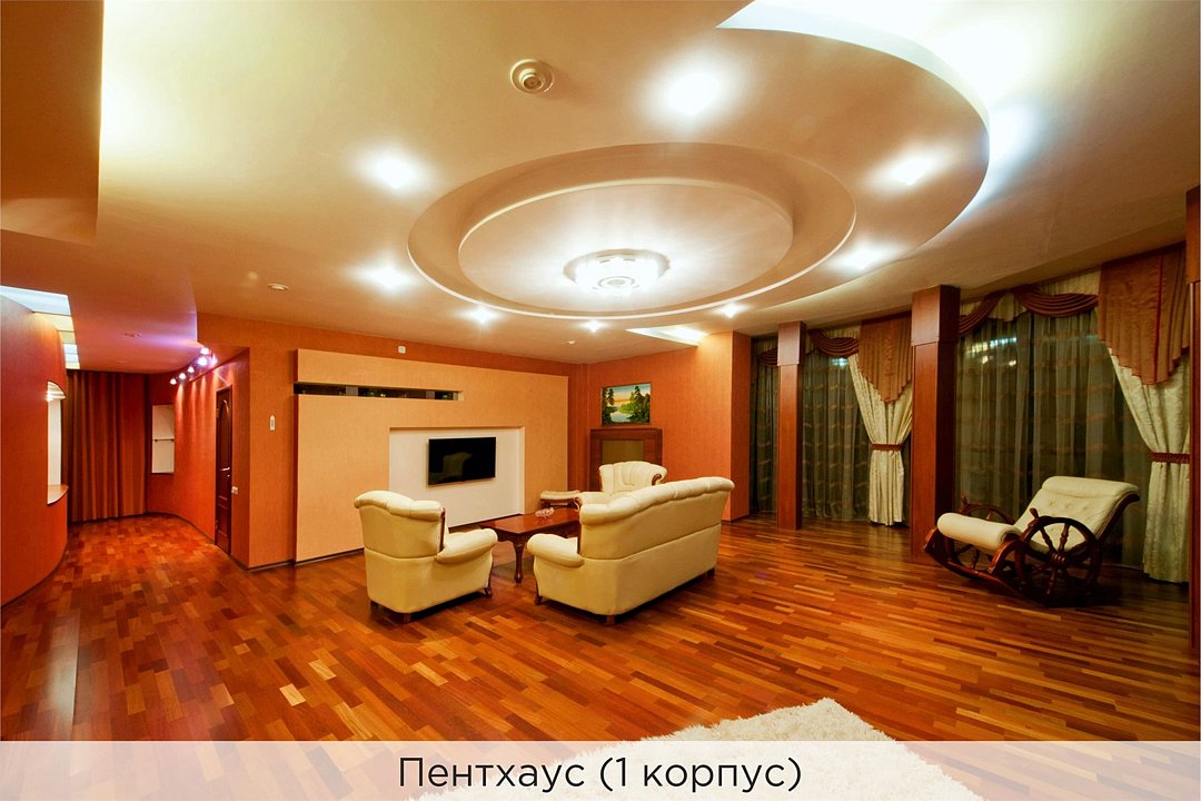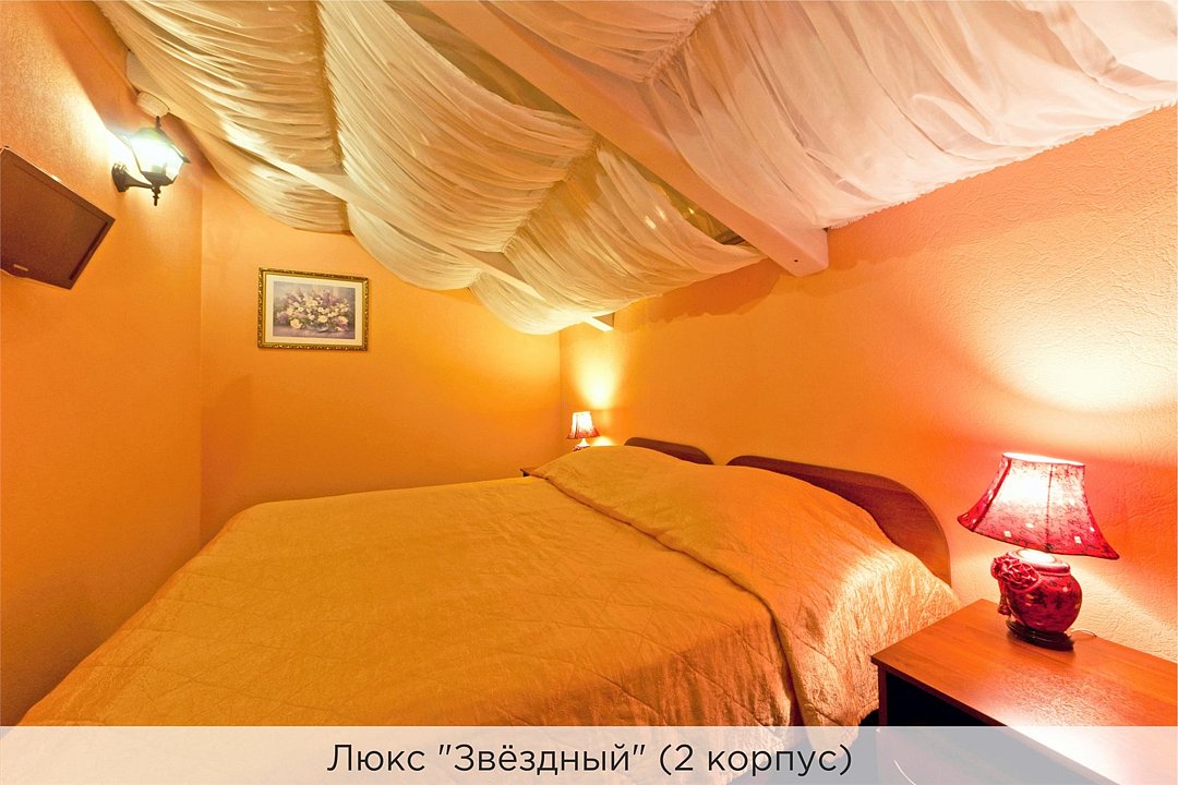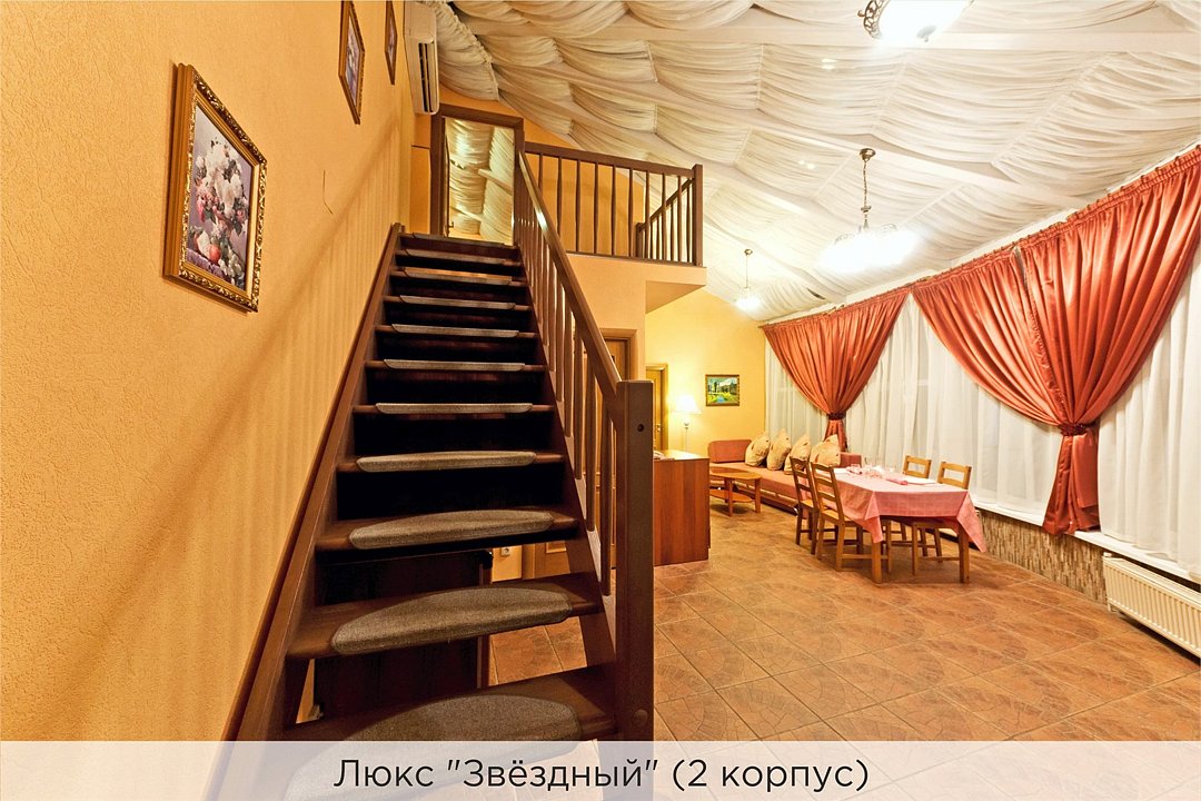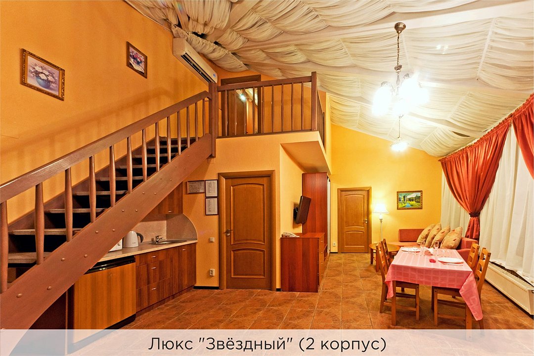 Оригинальный 2-х уровневый люкс под стеклянным куполом, 2 спальни, гостиная с диваном и мини-кухней. Номер выполнен в пастельных тонах. Совмещенный санузел, душевая кабина с гидромассажем. Номер расположен во 2 корпусе и оборудован кондиционерами. Проживание с животными в данной категории не предусмотрено. В стоимость проживания в номере входит: - завтрак «Шведский стол» с 7.00 до 11.00 (согласно выбранному тарифу). - посещение 25-метрового бассейна с 7.00 до 21.45* - посещение тренажёрного зала, саун (финская и турецкая) с 7.00 до 21.45. - мини-гольф. - интернет Wi-Fi. - Скидка 20% на индивидуальные сауны, мангальные беседки и летнюю площадку для шашлыка. - Пользование площадкой со столиками "Звёздное небо" с возможностью аренды мангала. * Бассейн находится в 1 корпусе отеля. Посещение бассейна осуществляется по предварительной записи в часы работы спортивного комплекса. Для посещения бассейна необходимо иметь купальные принадлежности, тапочки и шапочки. Сеанс плавания в бассейне начинается ровно в каждый час и длится 45 минут. С 1.09 по 31.05 посещение бассейна для гостей отеля недоступно в понедельник, среду и пятницу с 19:00 до 20:00. При заселении в отель каждому гостю необходимо предъявить документ удостоверяющий личность (паспорт). Для детей до 14 лет необходимо предъявление свидетельства о рождении. Для заселения несовершеннолетних детей без родителей необходимо предъявить доверенность (для детей до 14 лет доверенность должна быть на сопровождающее лицо, для детей старше 14 лет доверенность может быть оформлена на ребенка). - С иностранных граждан взимается плата за услуги по оформлению документов для постановки на миграционный учёт в размере 300.00 RUB за весь период проживания с человека.Услуги и удобства