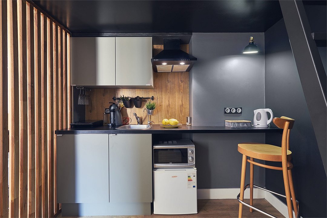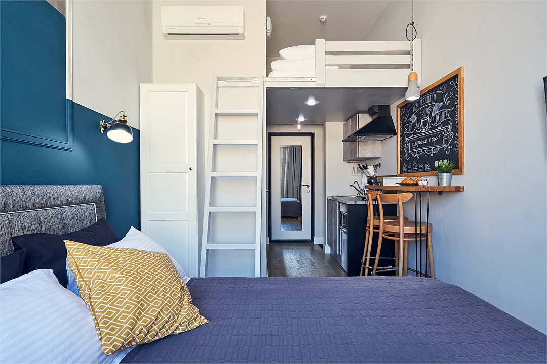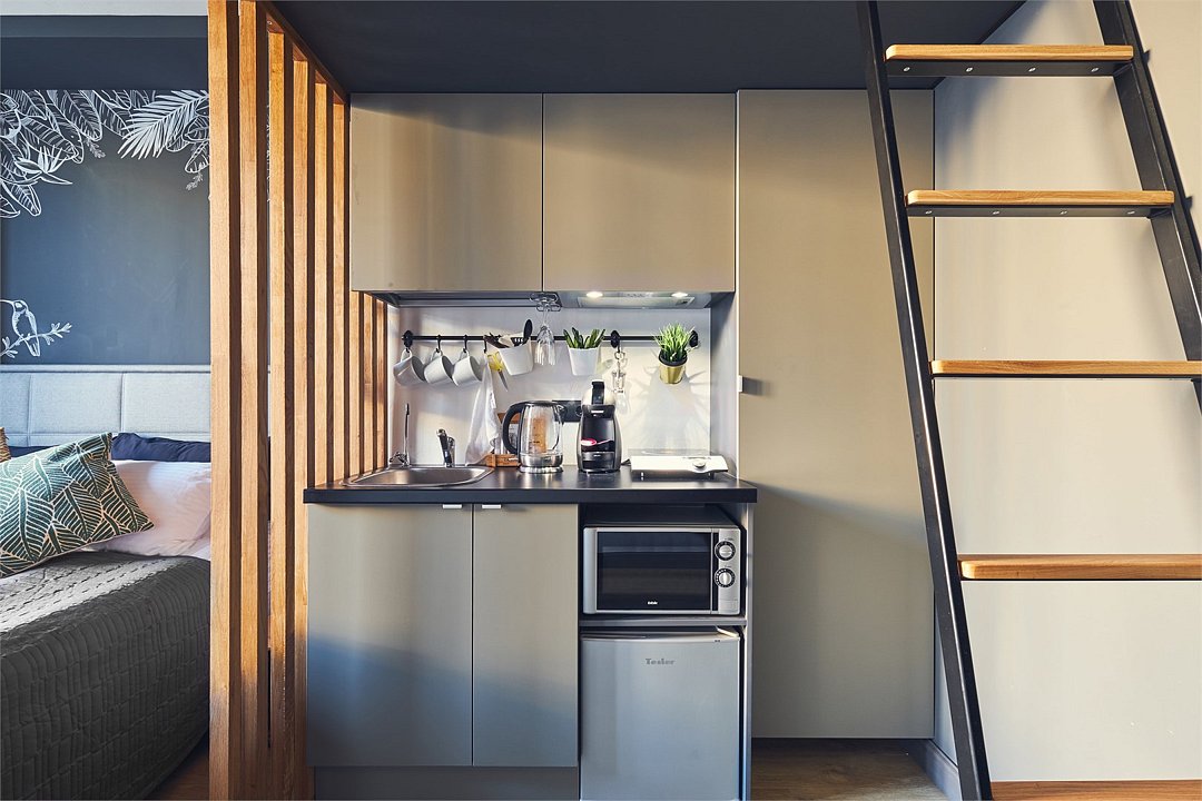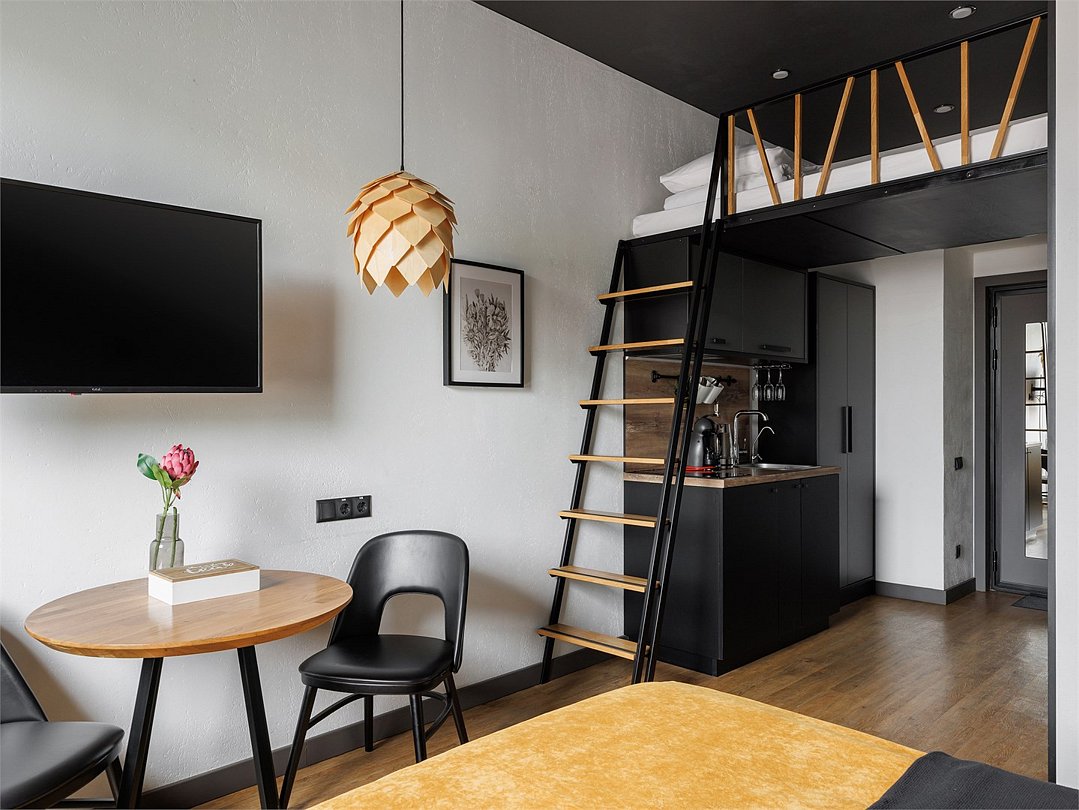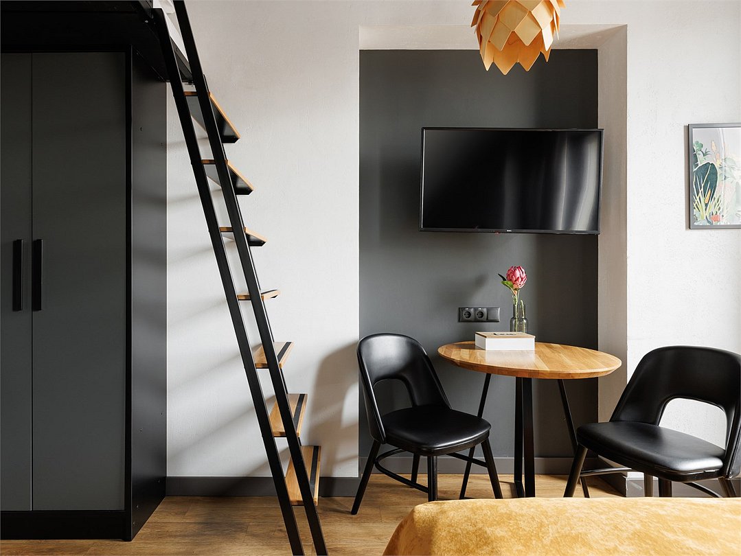 Всего в отеле 38 номеров категорий Улучшенный, Студии и Апартаменты. Все они рассчитаны на 2-4 постояльца. Комнаты имеют интересный дизайн, в спальнях имеются вторые этажи для дополнительной кровати с лестницей, мини-кухни, обеденные столы и стулья, утюг, электрочайник, микроволновка, холодильник, телевизор, набор посуды для приготовления пищи и чаепития.