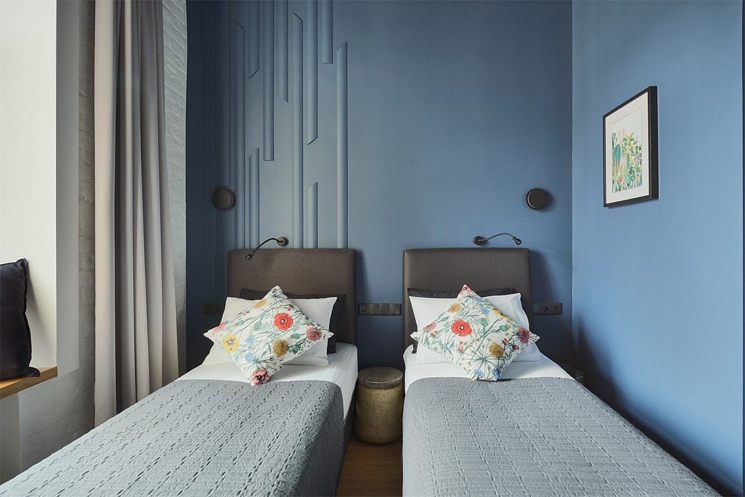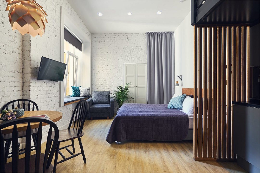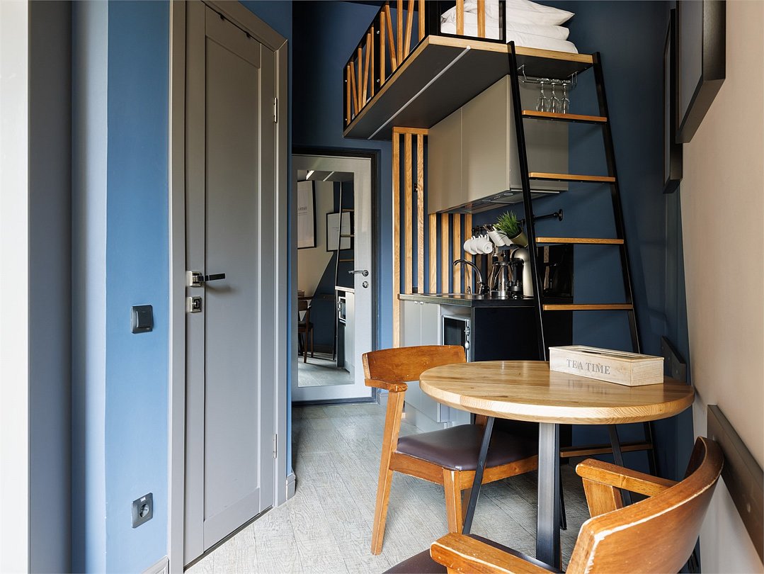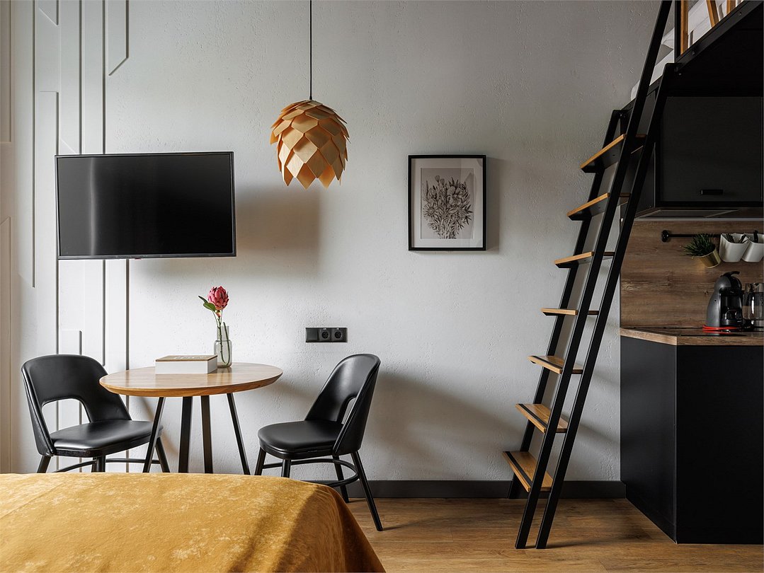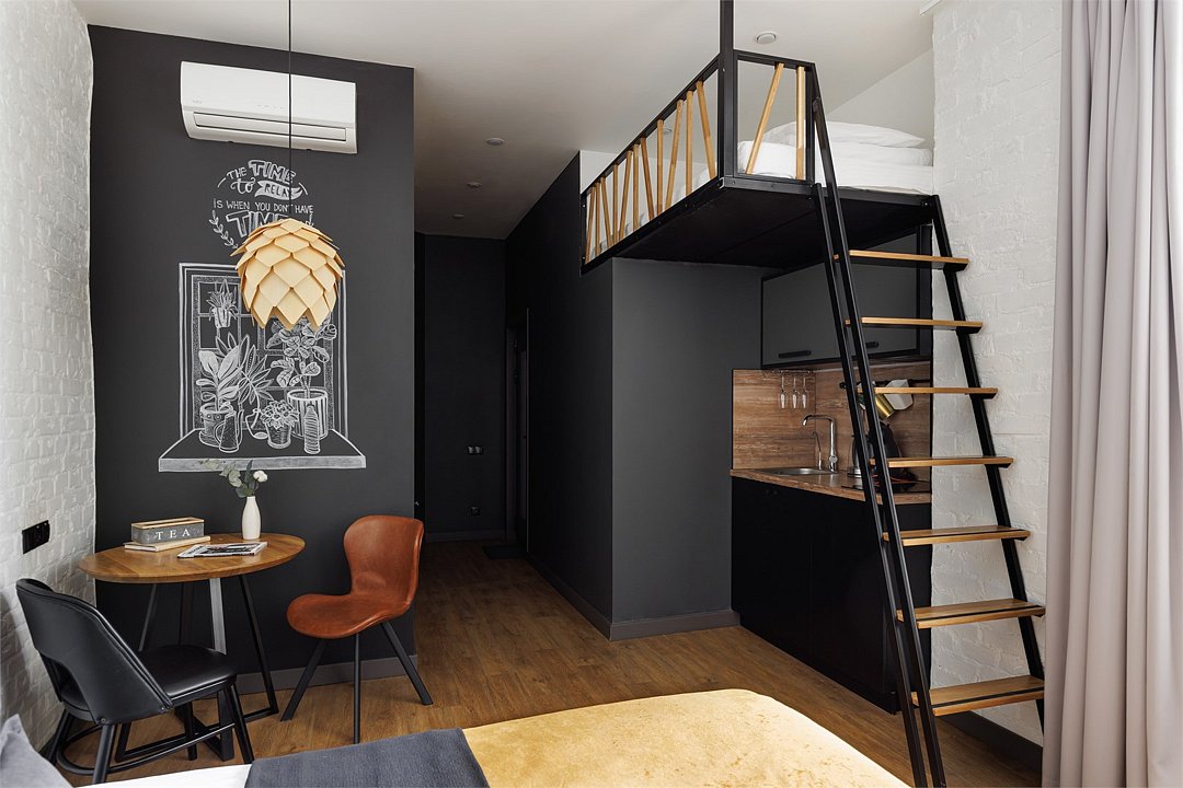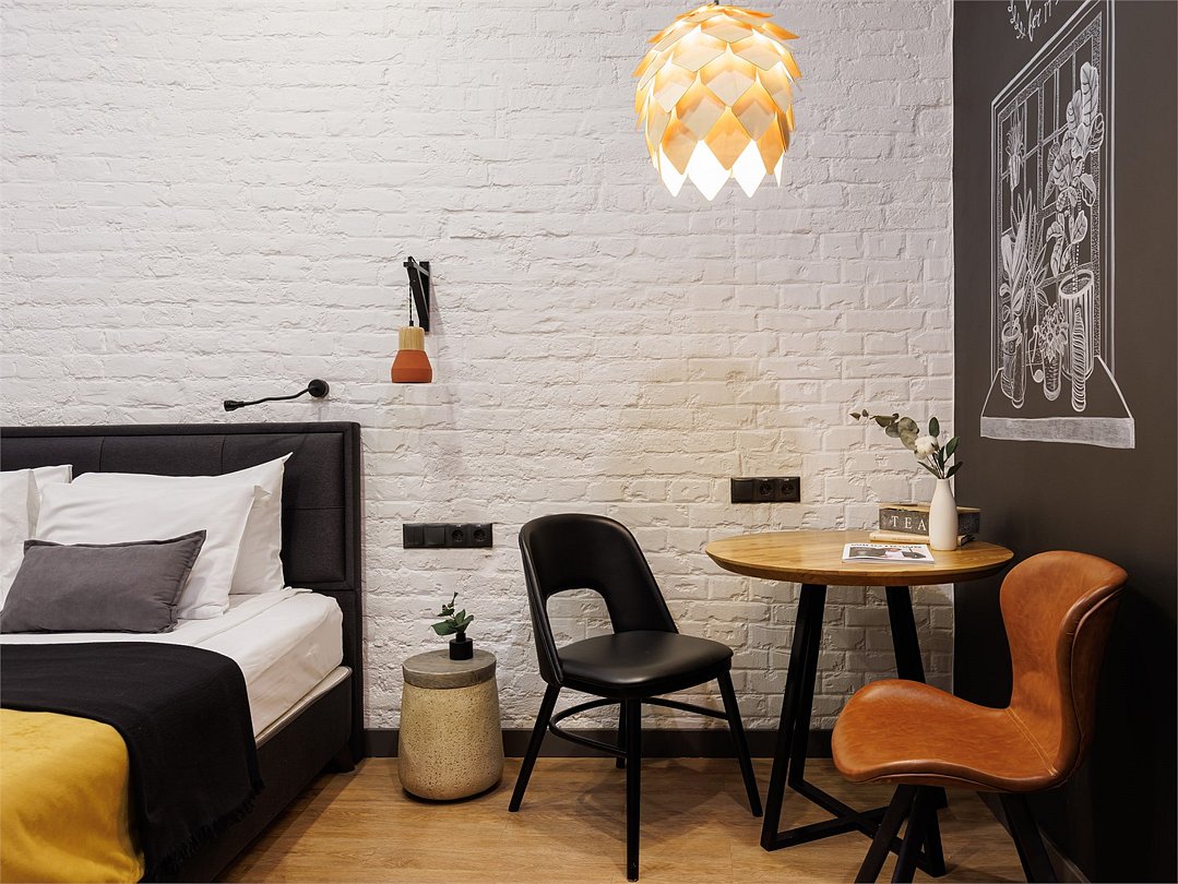 Всего в отеле 38 номеров категорий Улучшенный, Студии и Апартаменты. Все они рассчитаны на 2-4 постояльца. Комнаты имеют интересный дизайн, в спальнях имеются вторые этажи для дополнительной кровати с лестницей, мини-кухни, обеденные столы и стулья, утюг, электрочайник, микроволновка, холодильник, телевизор, набор посуды для приготовления пищи и чаепития.