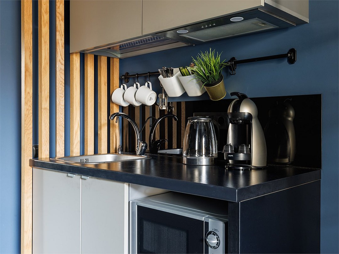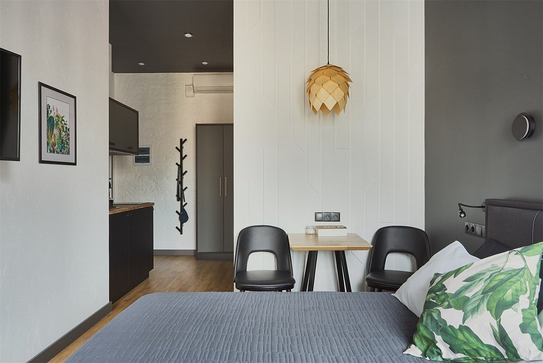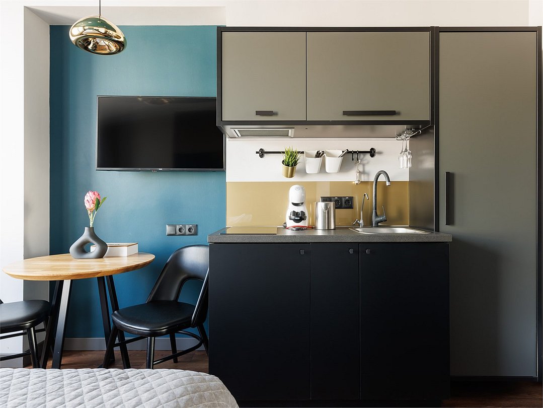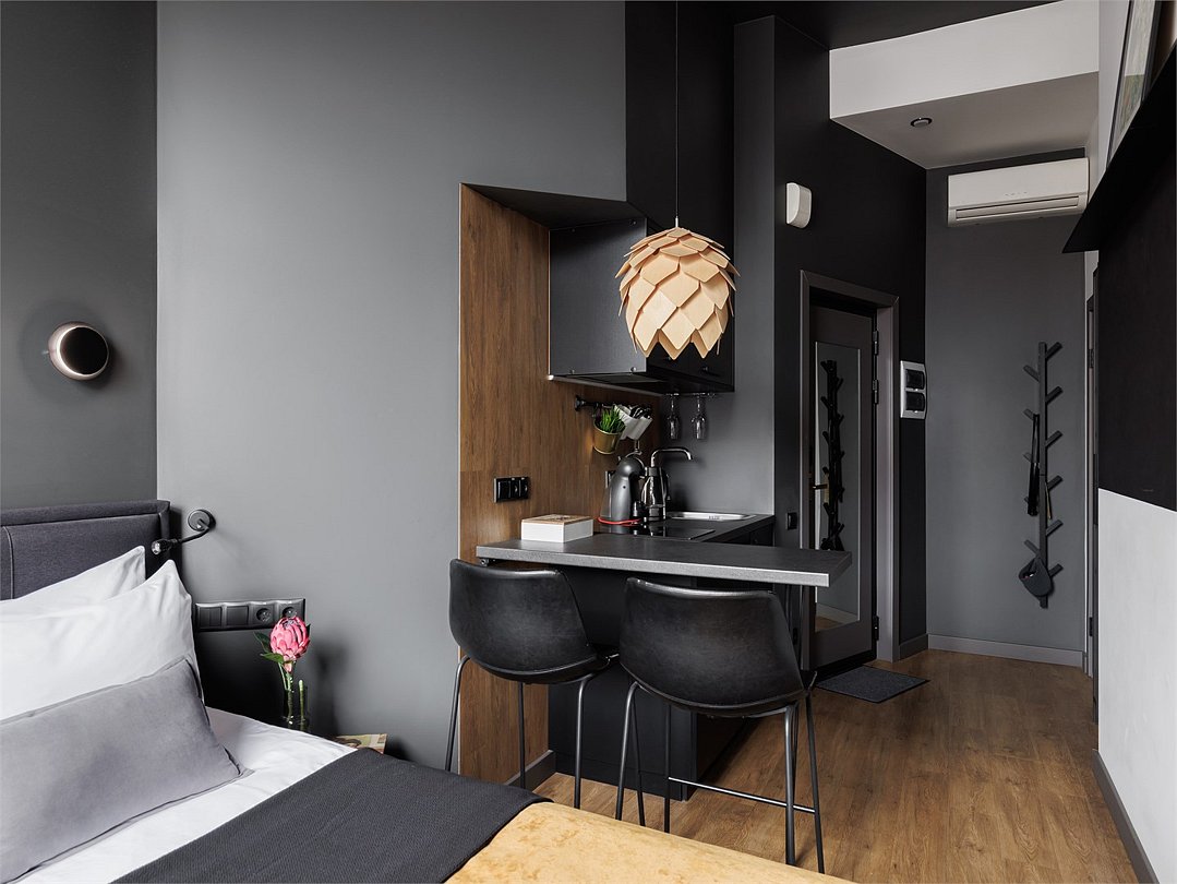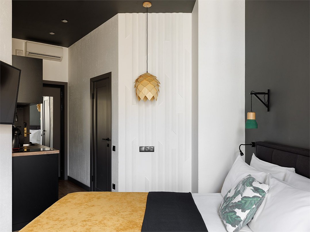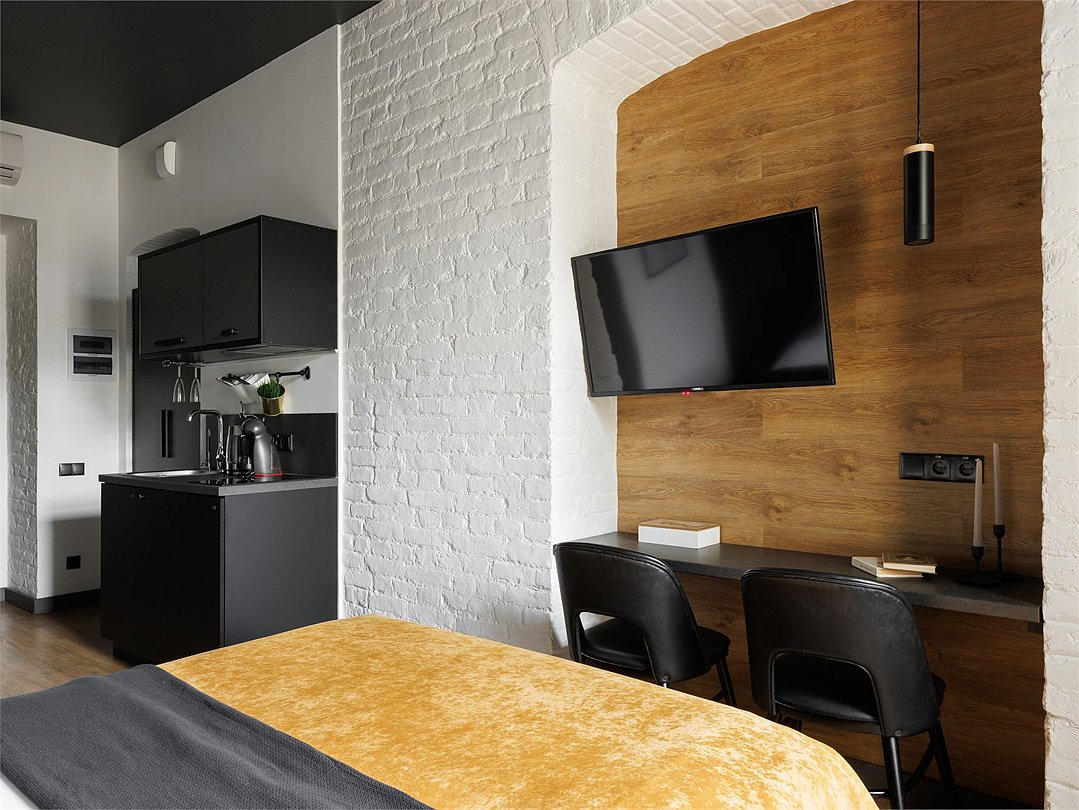 Мечтаете провести романтический отдых вдвоем? Номер-студио "Делюкс" с кроватью King-size – отличный вариант! Здесь вы по-настоящему сможете расслабиться и насладиться обществом друг друга. Огромная кровать и стильный интерьер, умело дополненные великолепным видом на город, создают атмосферу уюта и роскоши. Мини-кухня предоставит возможность приготовить романтический ужин, добавляя особый шарм вашему отдыху. Представьте: вы просыпаетесь утром в объятиях любимого человека, завариваете себе чашечку кофе и наслаждаетесь видом на город, который только начинает просыпаться. А вечером, вы сможете провести время вместе, наслаждаясь романтической атмосферой своего номера. Не упустите возможность сделать ваш отдых незабываемым! Забронируйте номер-студио "Делюкс" с кроватью размера "King-size" и наслаждайтесь всеми преимуществами роскошного и комфортного номера.Услуги и удобства