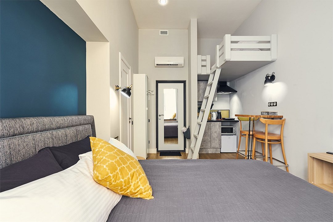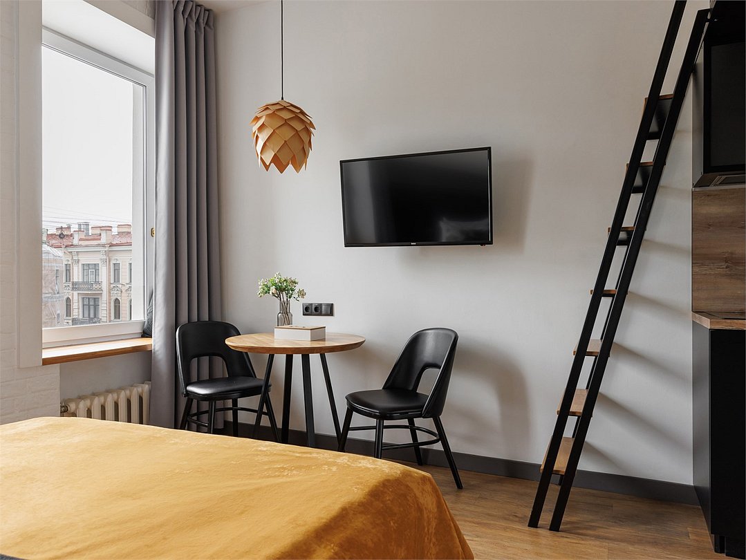 Ищете номер, где можно разместиться всей семьей или небольшой компанией? Этот улучшенный номер-студио с видом на город – идеальный выбор! Просторный и светлый, он станет вашим личным убежищем, где каждый почувствует себя как дома. Двуспальная кровать и уютная односпальная кровать на втором уровне – это не просто спальные места, это личное пространство для каждого гостя. Есть возможность сделать три отдельных спальных места по запросу. Мини-кухня позволит вам приготовить любимые блюда, а кондиционер создаст идеальный микроклимат в любое время года. Представьте: вы просыпаетесь утром, завариваете себе чашечку ароматного чая или кофе и наслаждаетесь видом на Невский проспект. А вечером, после насыщенного дня, вы сможете расслабиться и посмотреть любимый фильм по спутниковому телевидению. Не упустите возможность сделать ваше путешествие еще более комфортным и незабываемым! Забронируйте улучшенный номер-студио с видом на город и наслаждайтесь всеми преимуществами просторного и уютного номера.Услуги и удобства