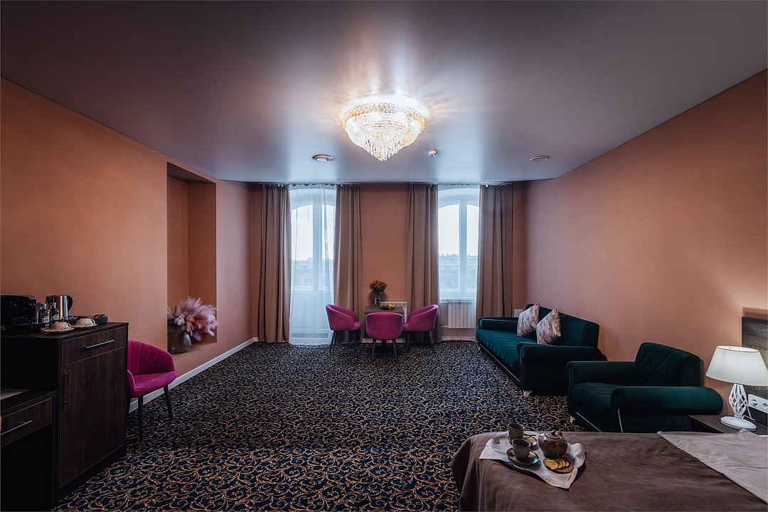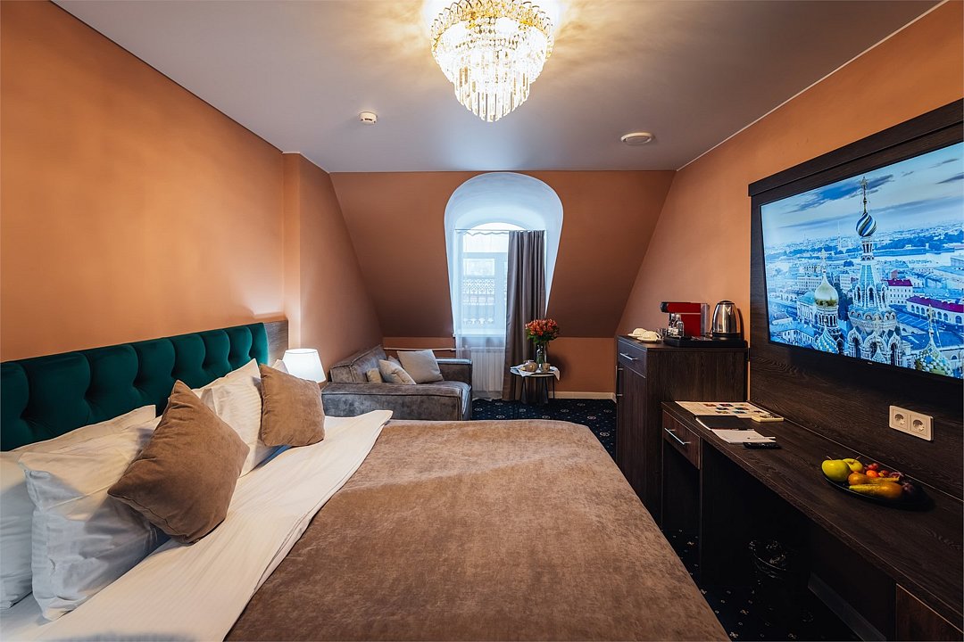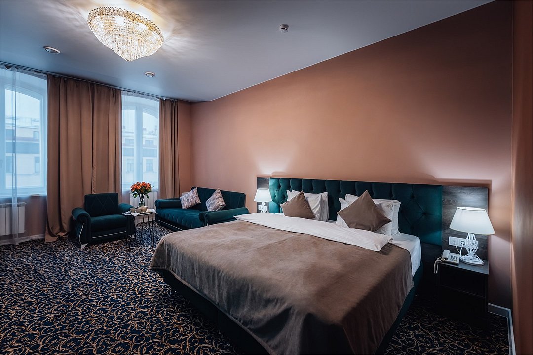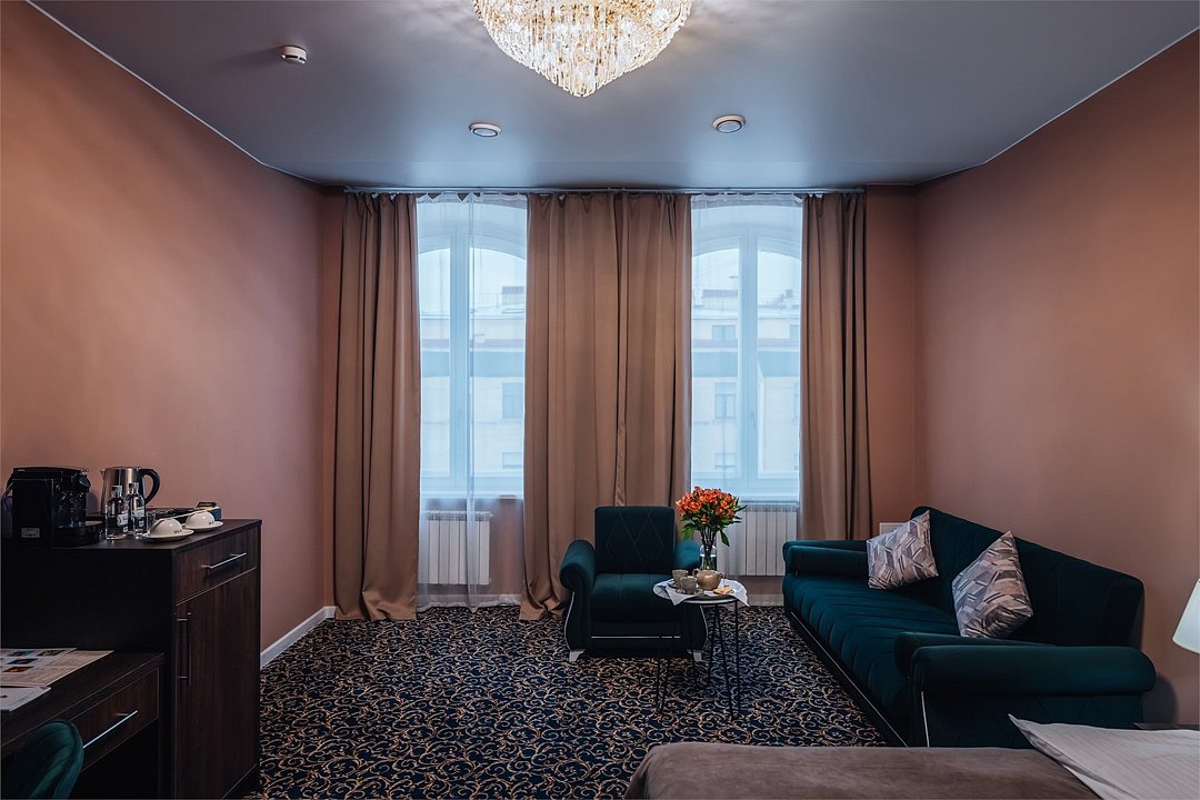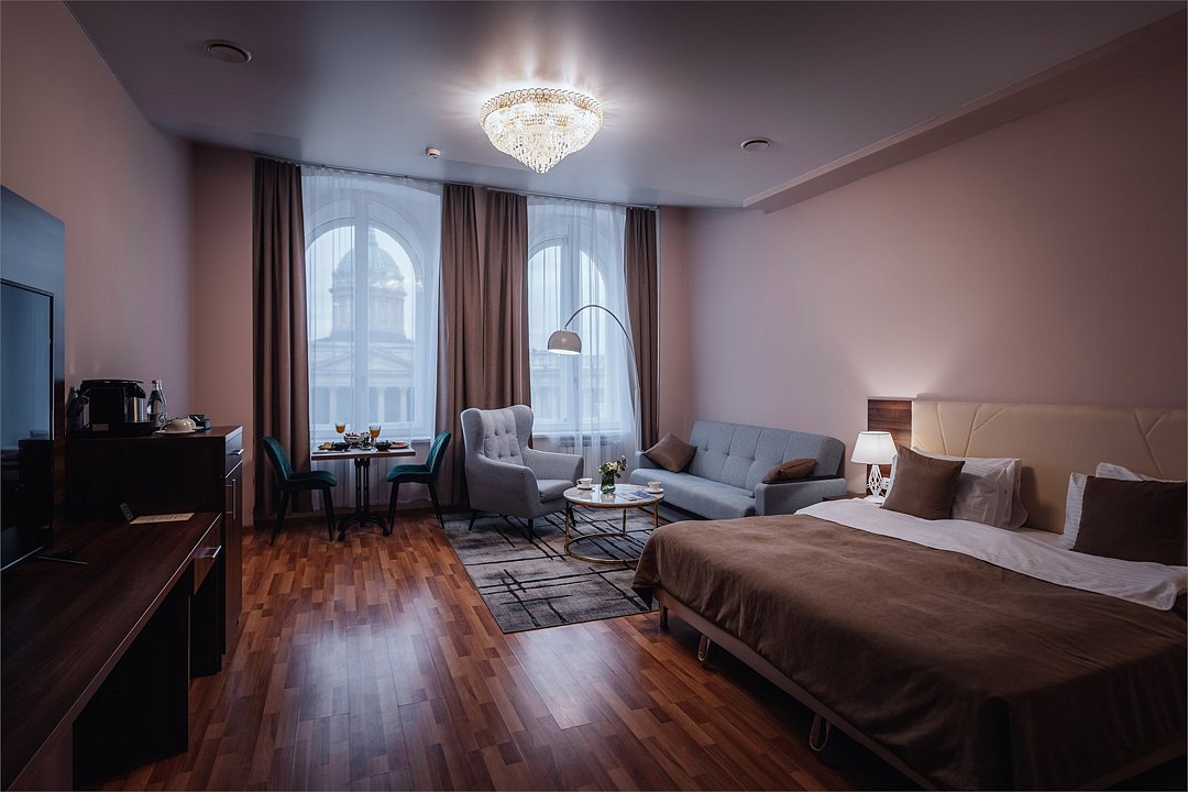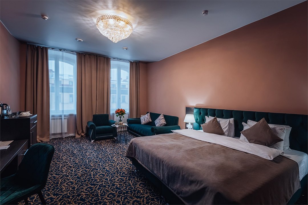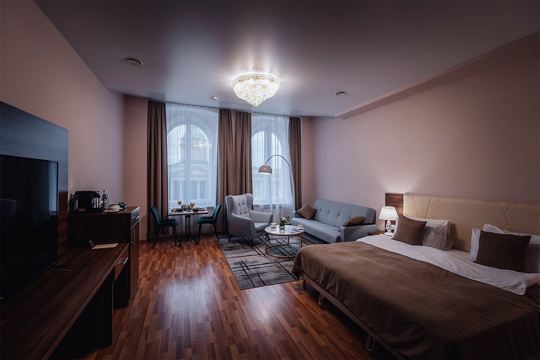 Самый роскошный номер Люкс с собственным балконом и фронтальным видом на Казанский собор делает его главным украшением отеля. Площадь номера - 50 кв. м., расположен на четвертом этаже. В номере отлично сочетаются классический стиль интерьера и современный комфорт. Здесь есть все необходимое для комфортного проживания - спальная зона с кроватью king size, гостиная зона с уютным диваном и креслами, рабочая зона с полноценным столом для работы. Помимо этого в номере располагается большой обеденный стол с мягкими стульями. Большая ванная комната с душем увеличенного размера, с красивой люстрой и полным спектром косметических принадлежностей не оставит никого равнодушным.Услуги и удобства