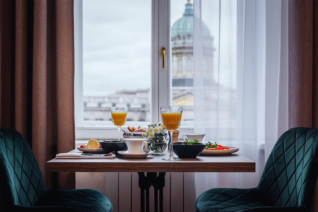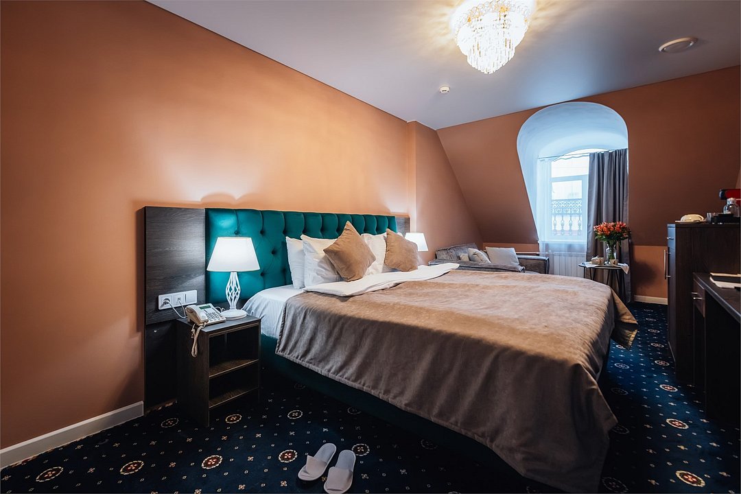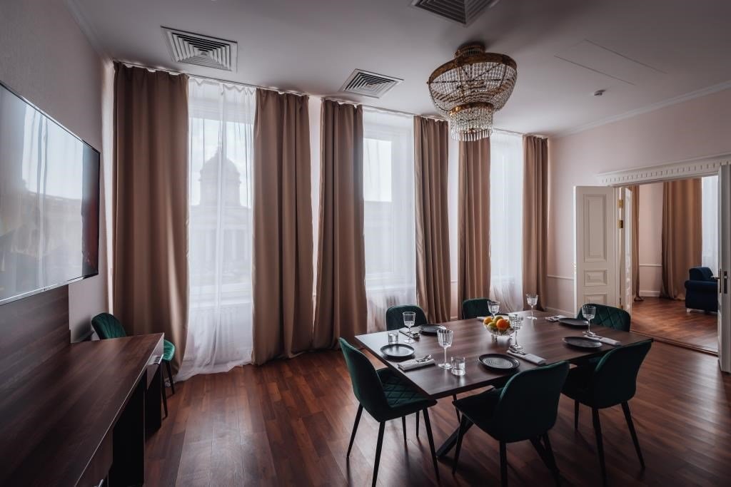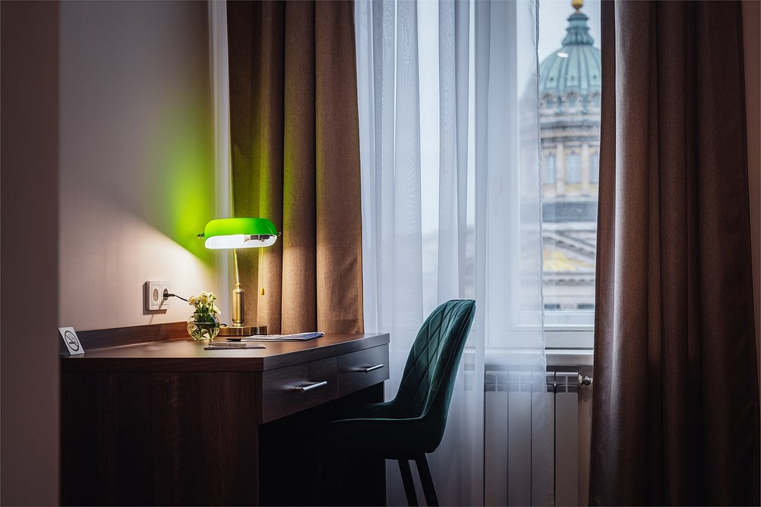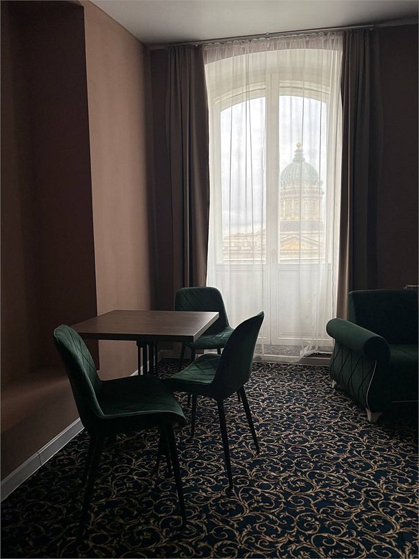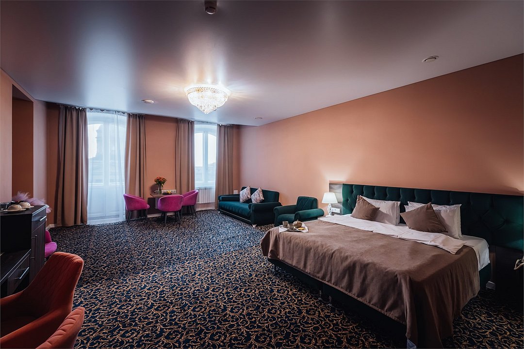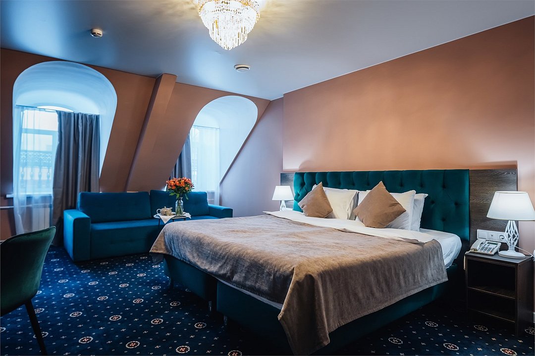 Самый роскошный номер Люкс с собственным балконом и фронтальным видом на Казанский собор делает его главным украшением отеля. Площадь номера - 50 кв. м., расположен на четвертом этаже. В номере отлично сочетаются классический стиль интерьера и современный комфорт. Здесь есть все необходимое для комфортного проживания - спальная зона с кроватью king size, гостиная зона с уютным диваном и креслами, рабочая зона с полноценным столом для работы. Помимо этого в номере располагается большой обеденный стол с мягкими стульями. Большая ванная комната с душем увеличенного размера, с красивой люстрой и полным спектром косметических принадлежностей не оставит никого равнодушным.Услуги и удобства