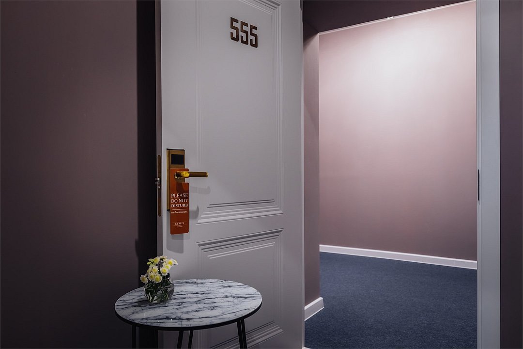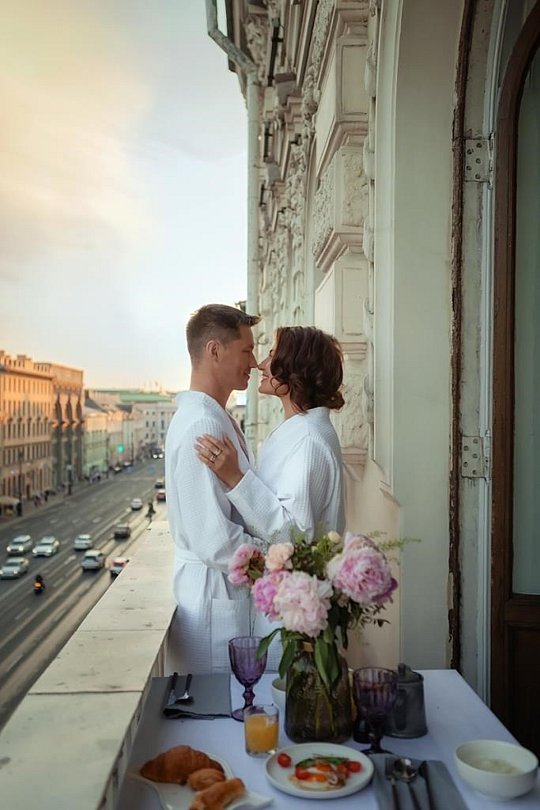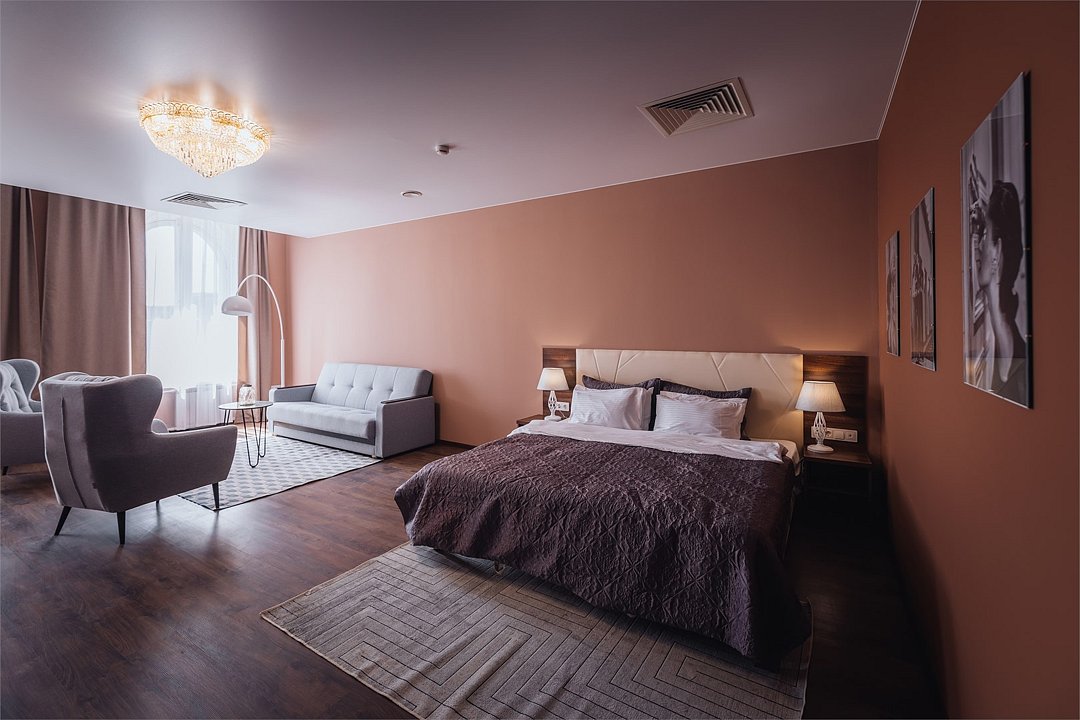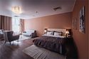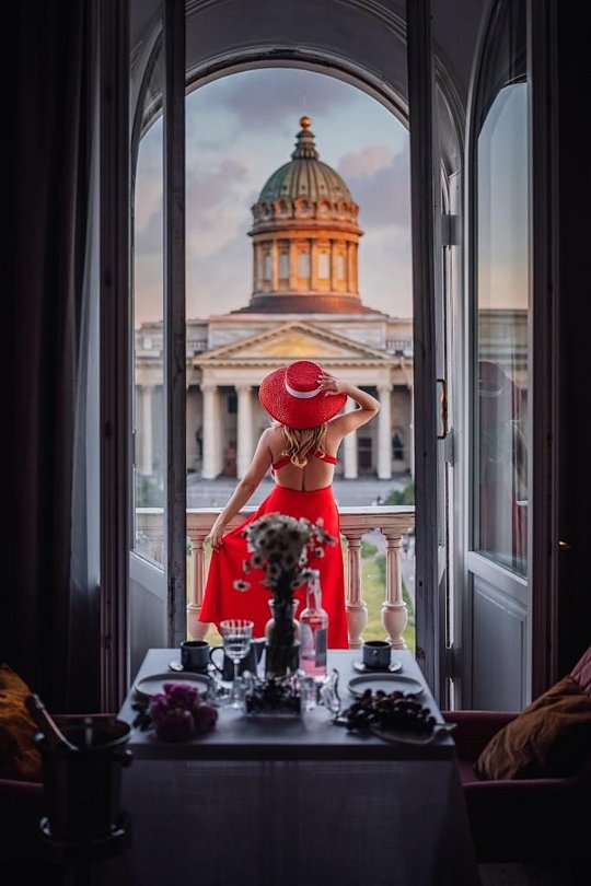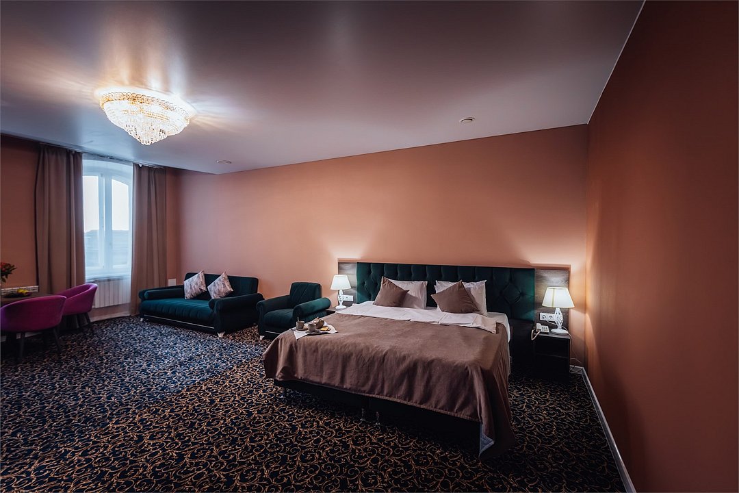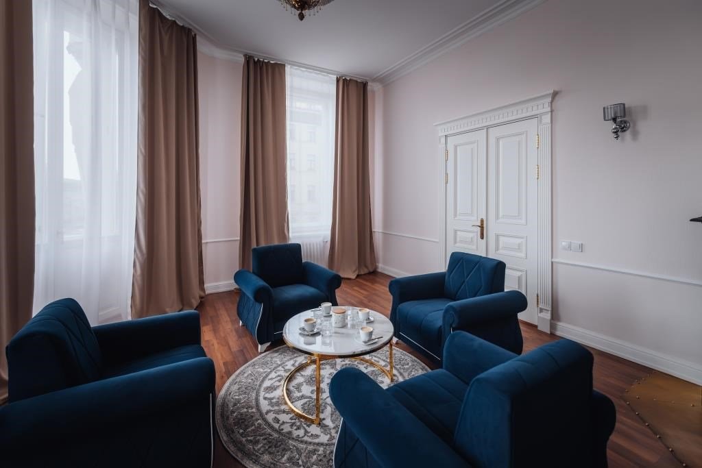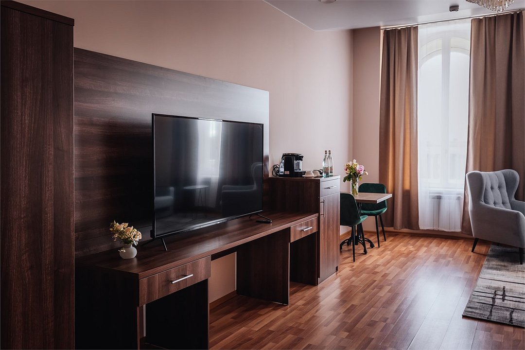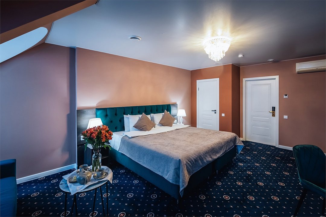 Самый роскошный номер Люкс с собственным балконом и фронтальным видом на Казанский собор делает его главным украшением отеля. Площадь номера - 50 кв. м., расположен на четвертом этаже. В номере отлично сочетаются классический стиль интерьера и современный комфорт. Здесь есть все необходимое для комфортного проживания - спальная зона с кроватью king size, гостиная зона с уютным диваном и креслами, рабочая зона с полноценным столом для работы. Помимо этого в номере располагается большой обеденный стол с мягкими стульями. Большая ванная комната с душем увеличенного размера, с красивой люстрой и полным спектром косметических принадлежностей не оставит никого равнодушным.Услуги и удобства