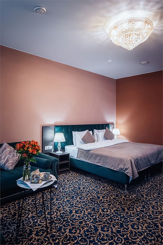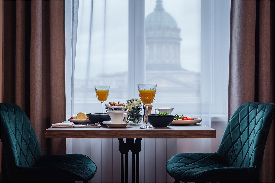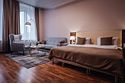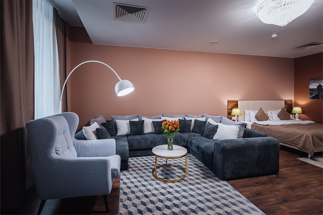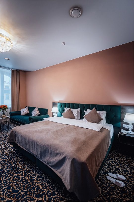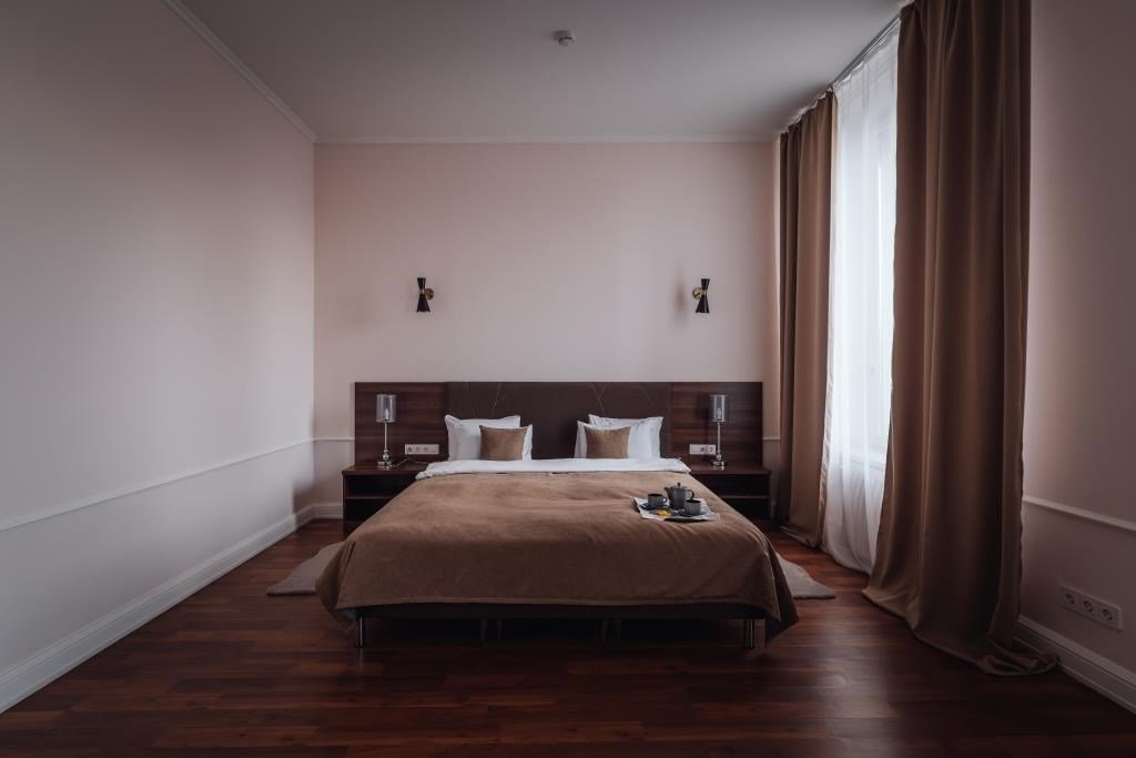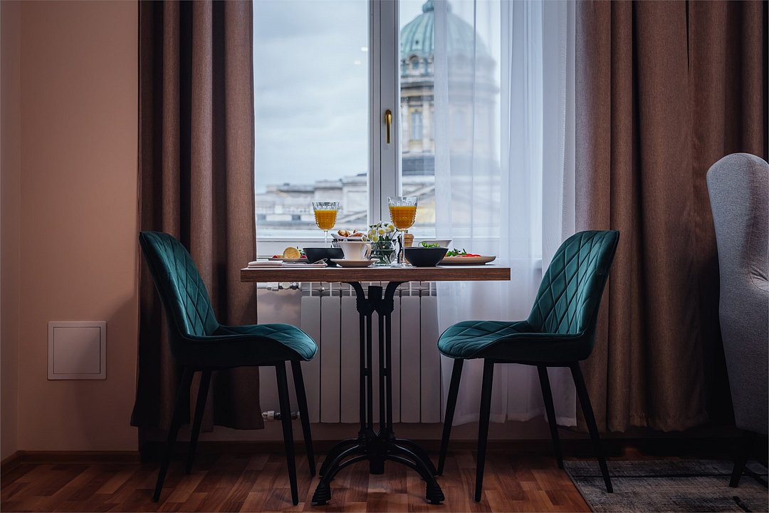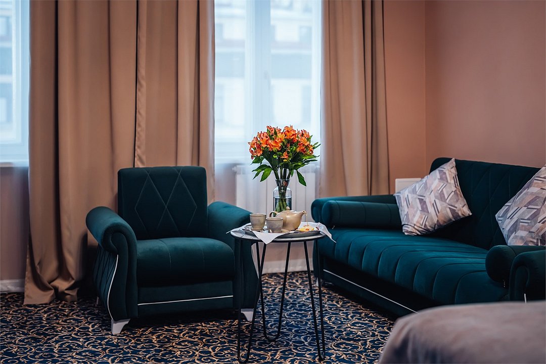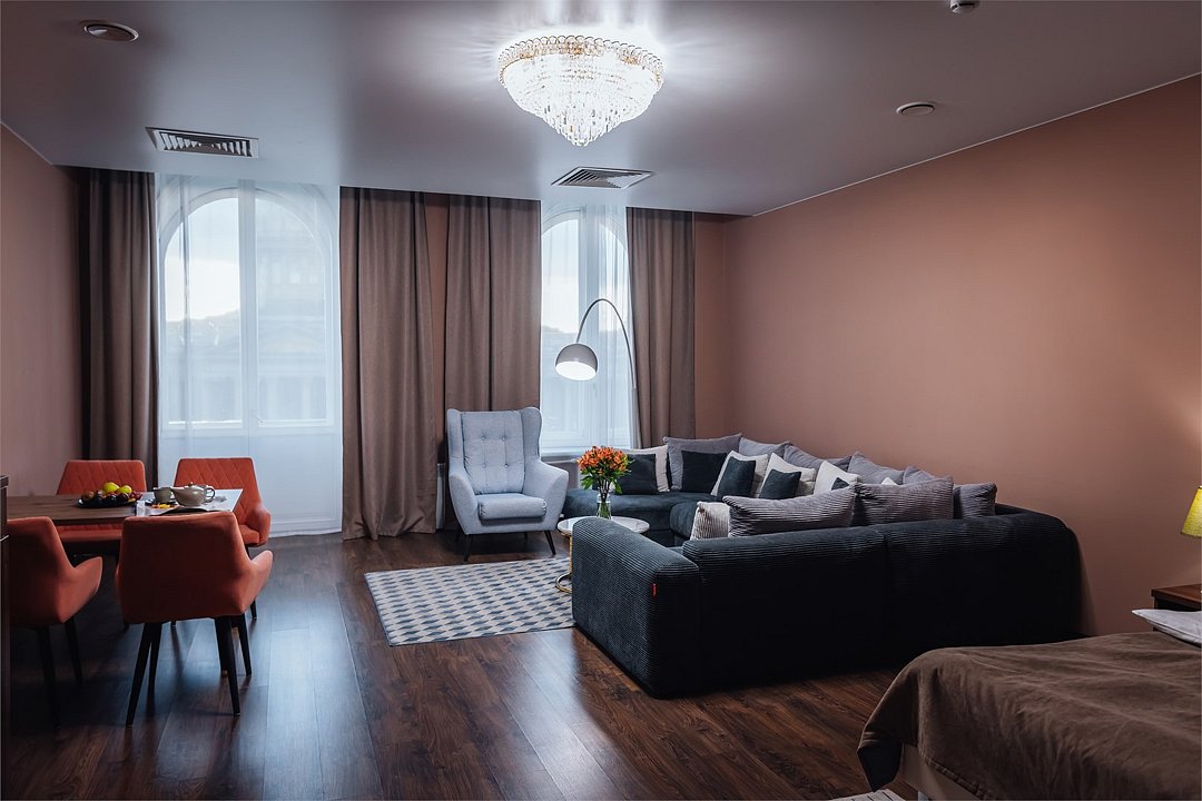 Великолепный номер "Люкс" с видом на пешеходную зону улицы Малая Конюшенная позволит Вам насладиться красотами города не выходя из отеля! Один из люксов панорамный, с окнами в пол и балконом. Площадь номеров 55- 60 кв. м, возможно как двухместное размещение, так и семейное проживание (есть возможность поставить дополнительное спальное место и/или детскую кроватку). В номерах есть все необходимое для комфортного проживания: двуспальная кровать размером King size, мягкое кресло и двухместный диванчик, телевизор, письменный стол для работы, настольная лампа, торшеры. Великолепная ванная комната с итальянской сантехникой, где в полном распоряжении гостей – фен, халаты, полотенца, тапочки, гели и шампуни премиум класса .Услуги и удобства