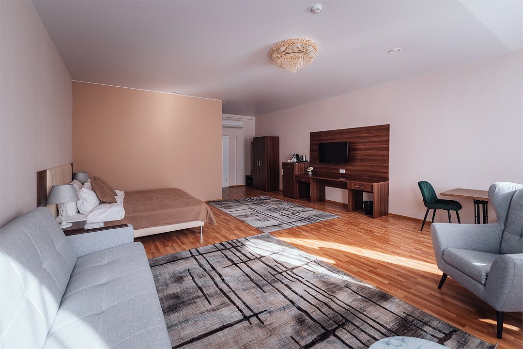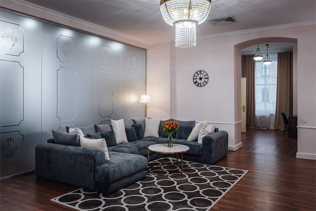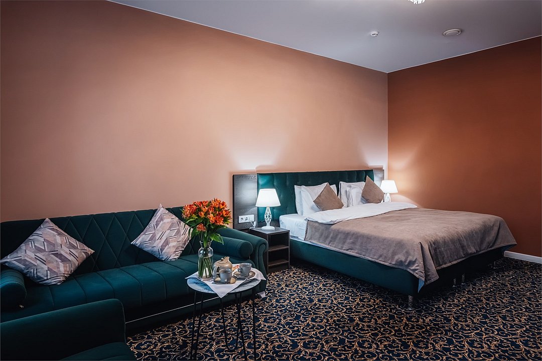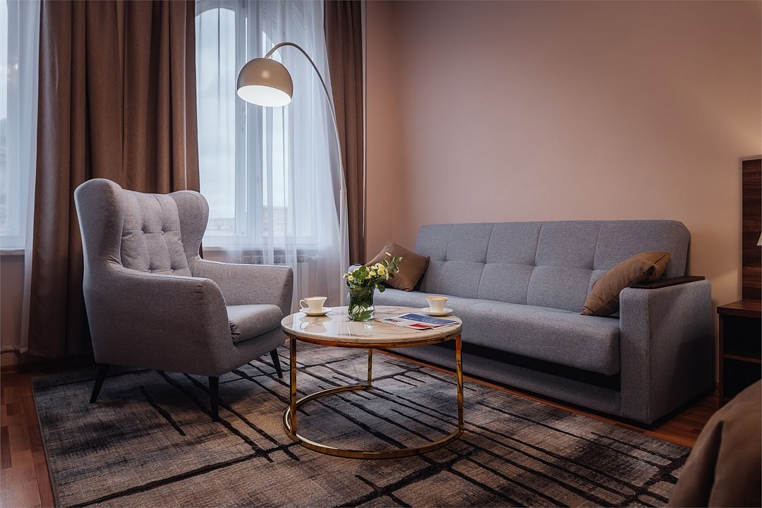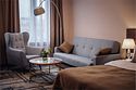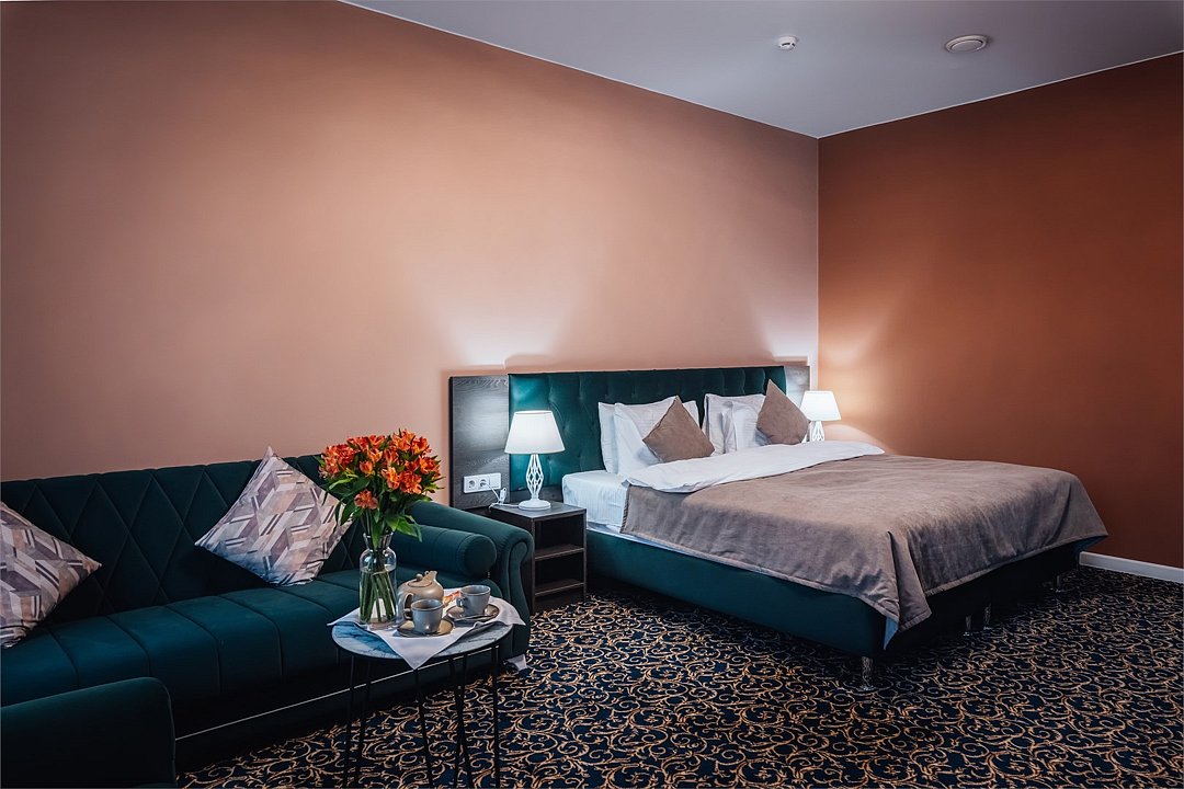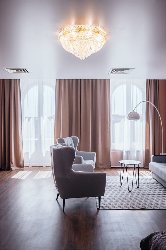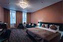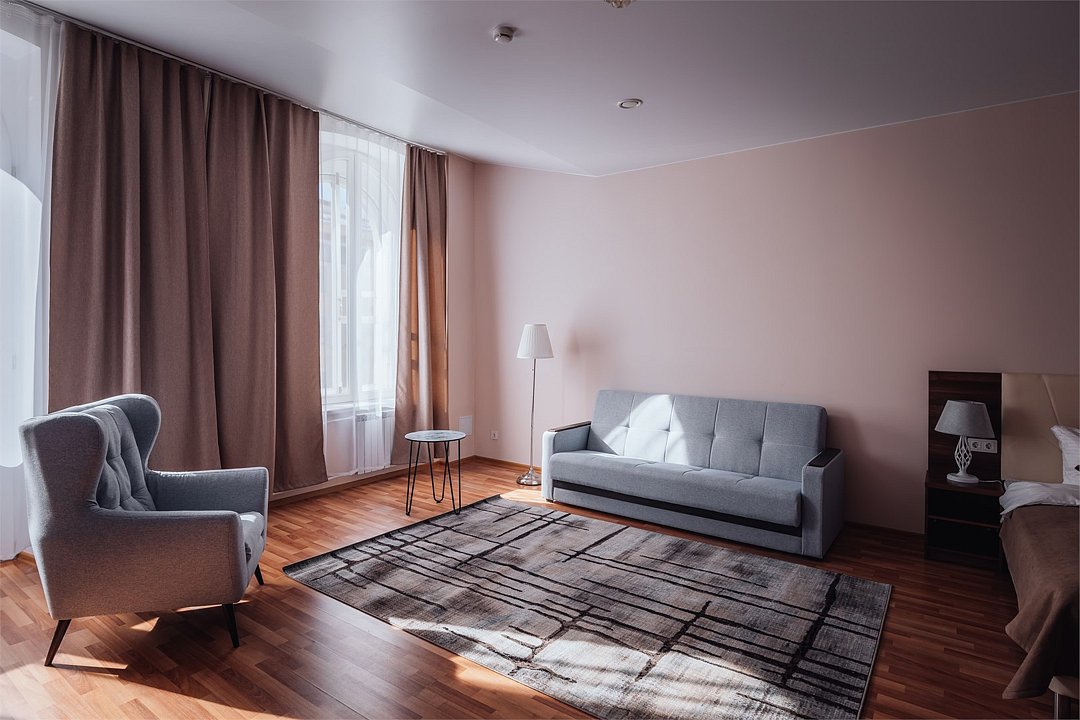 Великолепный номер "Люкс" с видом на пешеходную зону улицы Малая Конюшенная позволит Вам насладиться красотами города не выходя из отеля! Один из люксов панорамный, с окнами в пол и балконом. Площадь номеров 55- 60 кв. м, возможно как двухместное размещение, так и семейное проживание (есть возможность поставить дополнительное спальное место и/или детскую кроватку). В номерах есть все необходимое для комфортного проживания: двуспальная кровать размером King size, мягкое кресло и двухместный диванчик, телевизор, письменный стол для работы, настольная лампа, торшеры. Великолепная ванная комната с итальянской сантехникой, где в полном распоряжении гостей – фен, халаты, полотенца, тапочки, гели и шампуни премиум класса .Услуги и удобства