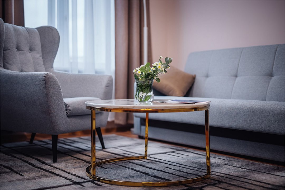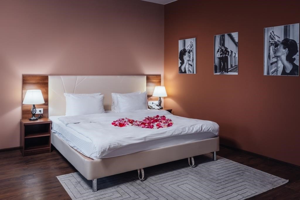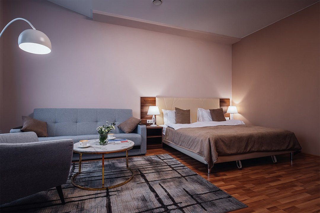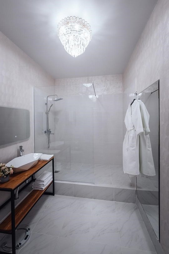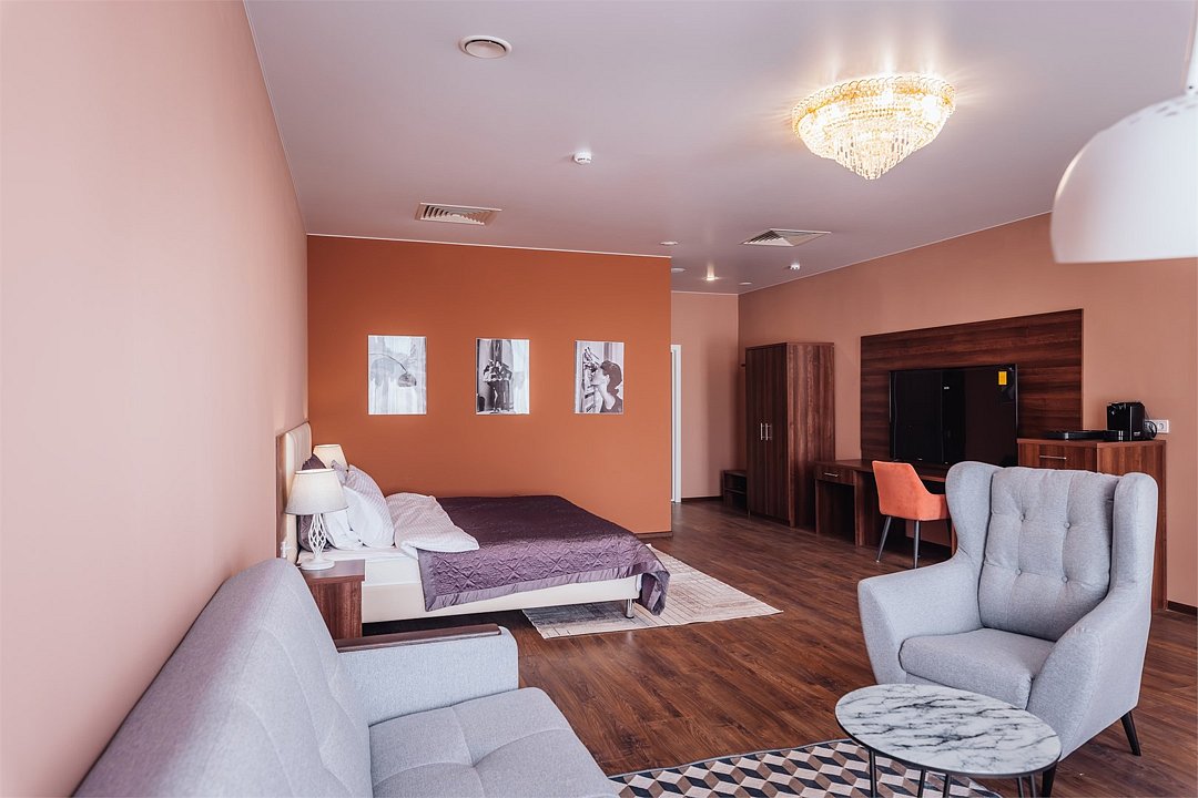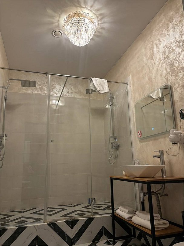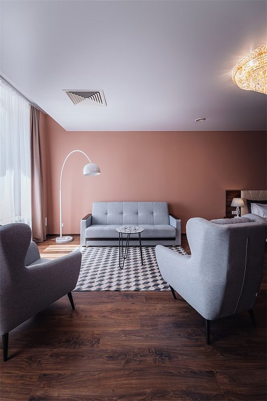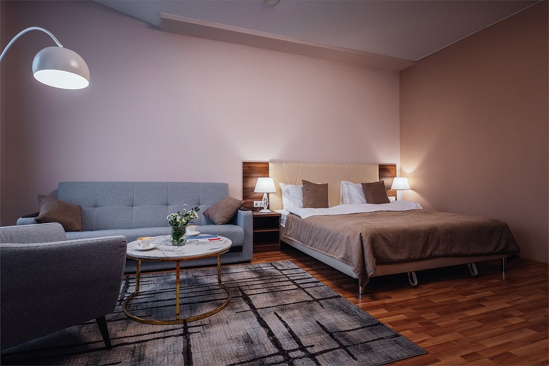 Великолепный номер "Люкс" с видом на пешеходную зону улицы Малая Конюшенная позволит Вам насладиться красотами города не выходя из отеля! Один из люксов панорамный, с окнами в пол и балконом. Площадь номеров 55- 60 кв. м, возможно как двухместное размещение, так и семейное проживание (есть возможность поставить дополнительное спальное место и/или детскую кроватку). В номерах есть все необходимое для комфортного проживания: двуспальная кровать размером King size, мягкое кресло и двухместный диванчик, телевизор, письменный стол для работы, настольная лампа, торшеры. Великолепная ванная комната с итальянской сантехникой, где в полном распоряжении гостей – фен, халаты, полотенца, тапочки, гели и шампуни премиум класса .Услуги и удобства