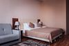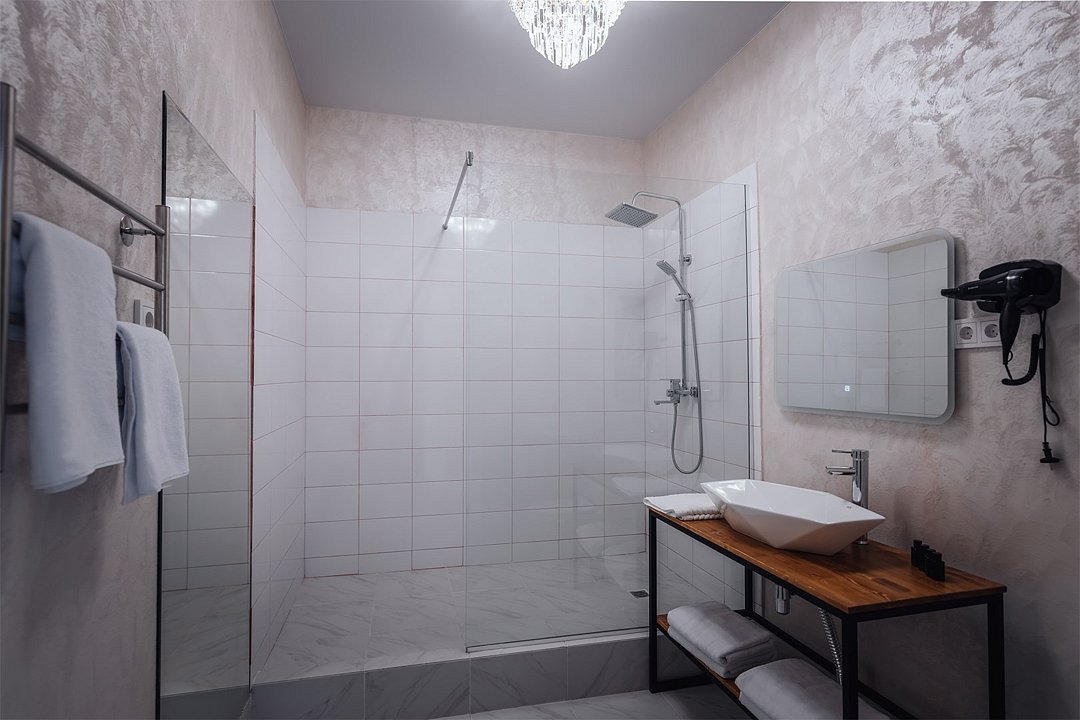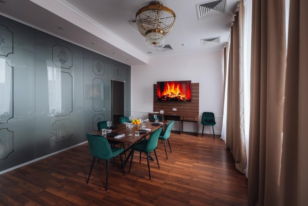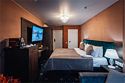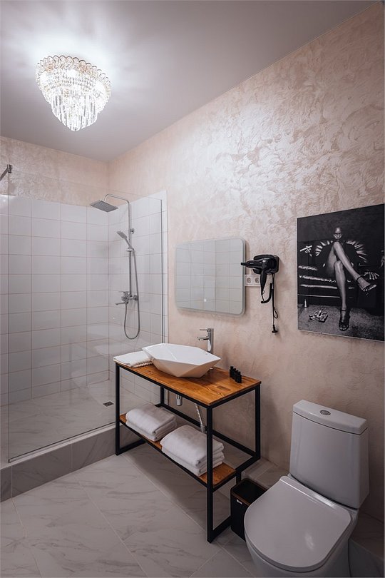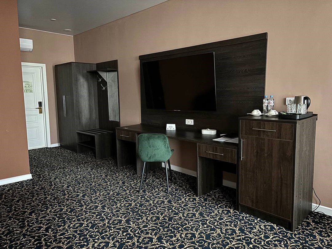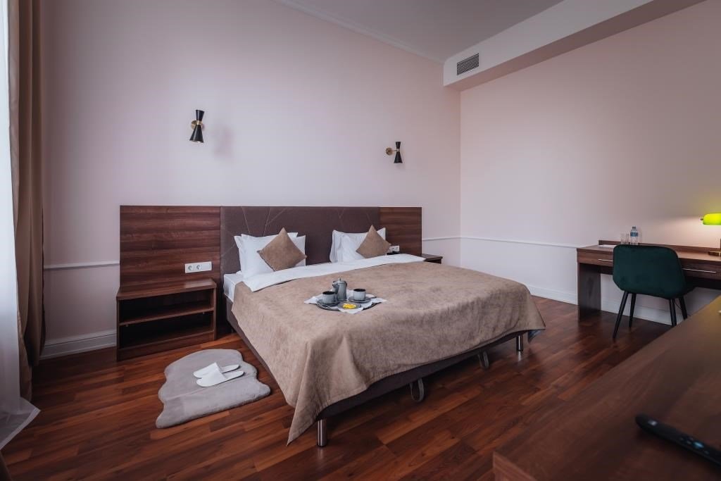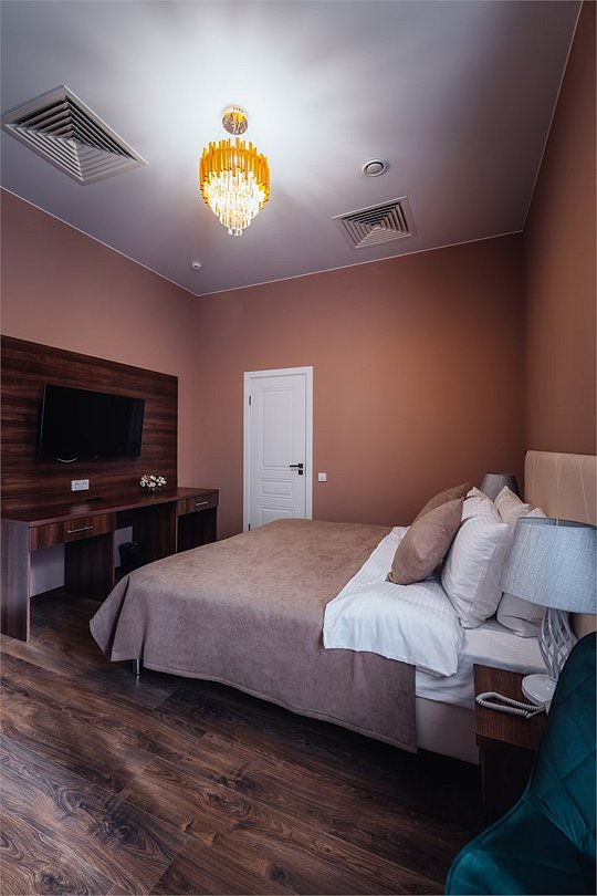 спутниковое телевидение, Wi-Fi, IP-телефон, кондиционер, система климат-контроля, настольные лампы, фен, весы, электронные замки, утюг, ванная комната, банные принадлежности, банные полотенца, тапочки, гигиенические средства, косметические средства, кровать «King size», гладильная доска, тумбы, стулья, шкаф для одежды, вешалки, журнальный столик, письменный стол, багажная тумба, зеркало, комод, мини-бар, чайный набор, сейф, чайник, унитаз, раковина, питьевая вода, отопление, душ, вид на город, вид во двор, паркет, высокие потолки, стаканы, кофейный столик, стул, стол, туалет, сплит-система, мини-холодильник, шкаф-купе, телевизор со Smart TV, номер для некурящих, онлайн-регистрация до заезда, чайная станция, уборка номера, бутилированная водаВ номере