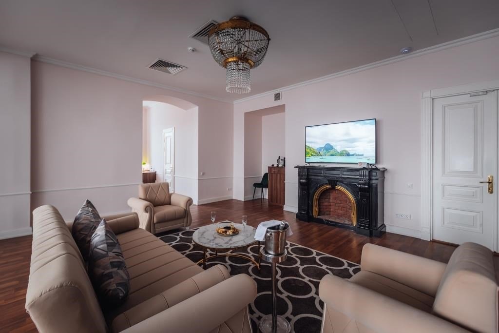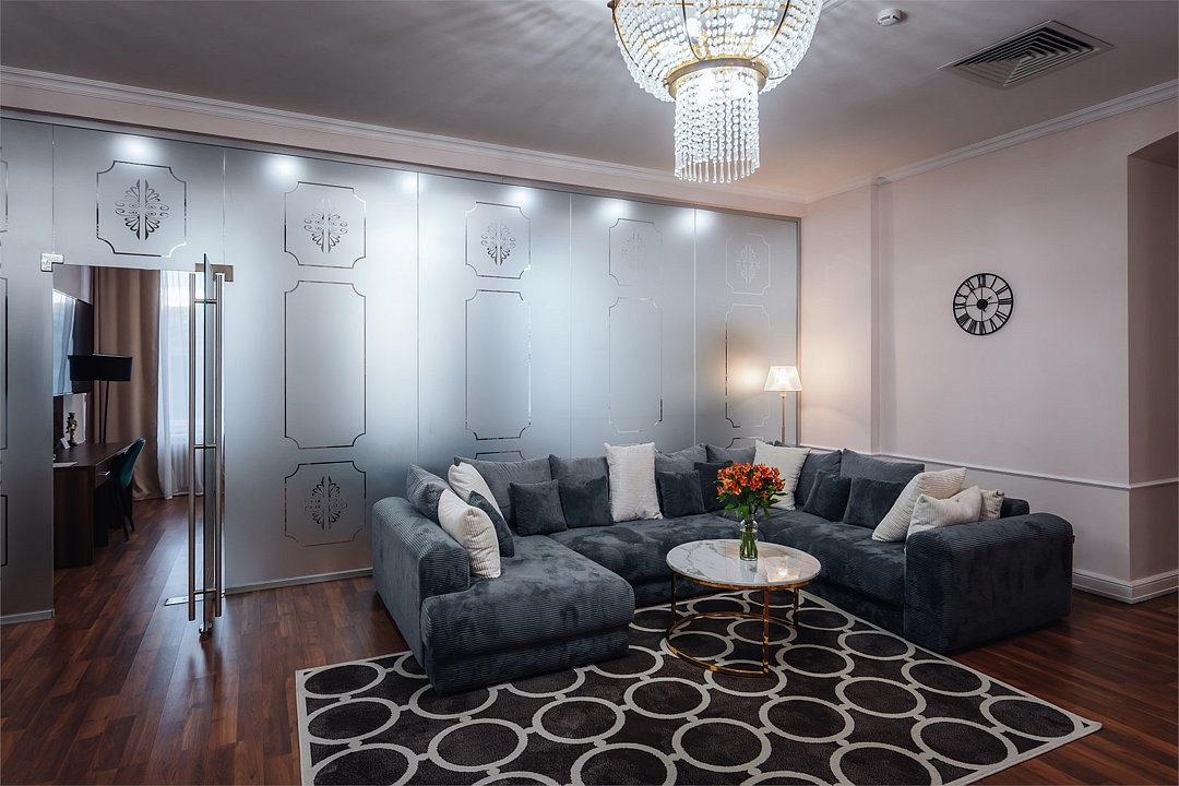 Комфортабельный двухкомнатный люкс площадью 100 кв. м подойдет для размещения 4-6 гостей с детьми. Есть возможность организации смежных номеров для комфортного размещения семьи. Из панорамных окон номера открывается потрясающий вид на Казанский собор! В номере: 2 изолированные спальни, 2 санузла, общий холл. Двуспальная кровать (Super King size) в каждой комнате или две полутороспальные кровати, высокий ортопедический матрас, комфортабельная мебель, шкаф для хранения одежды, рабочий стол, плазменный телевизор, многоканальный телефон, wi-fi, кондиционер, сейф, мини-бар, чайная станция, утюг и гладильная доска. Дополнительное спальное место в каждой комнате, позволяющие с комфортом разместиться в номере 6 гостям , детская кровать –манеж предоставляется по запросу.Услуги и удобства