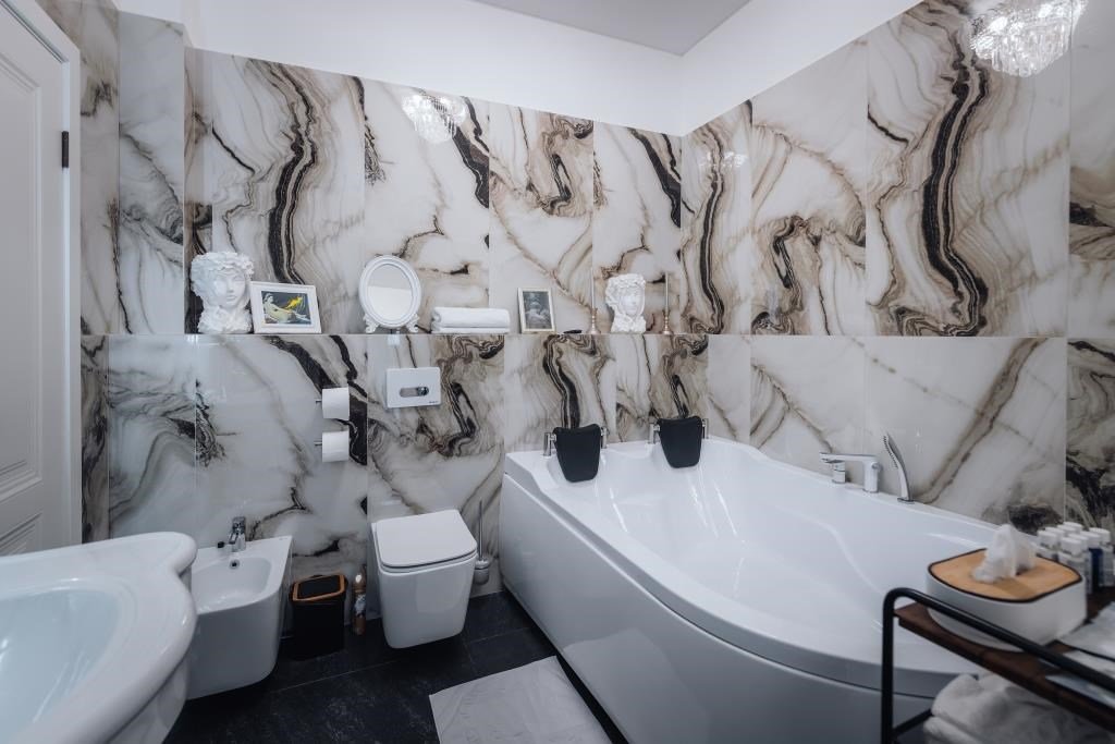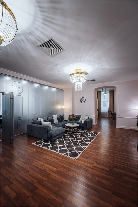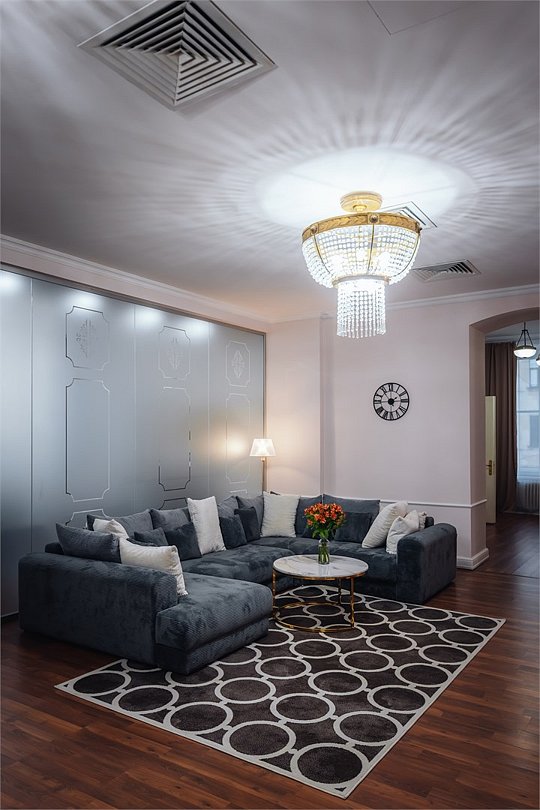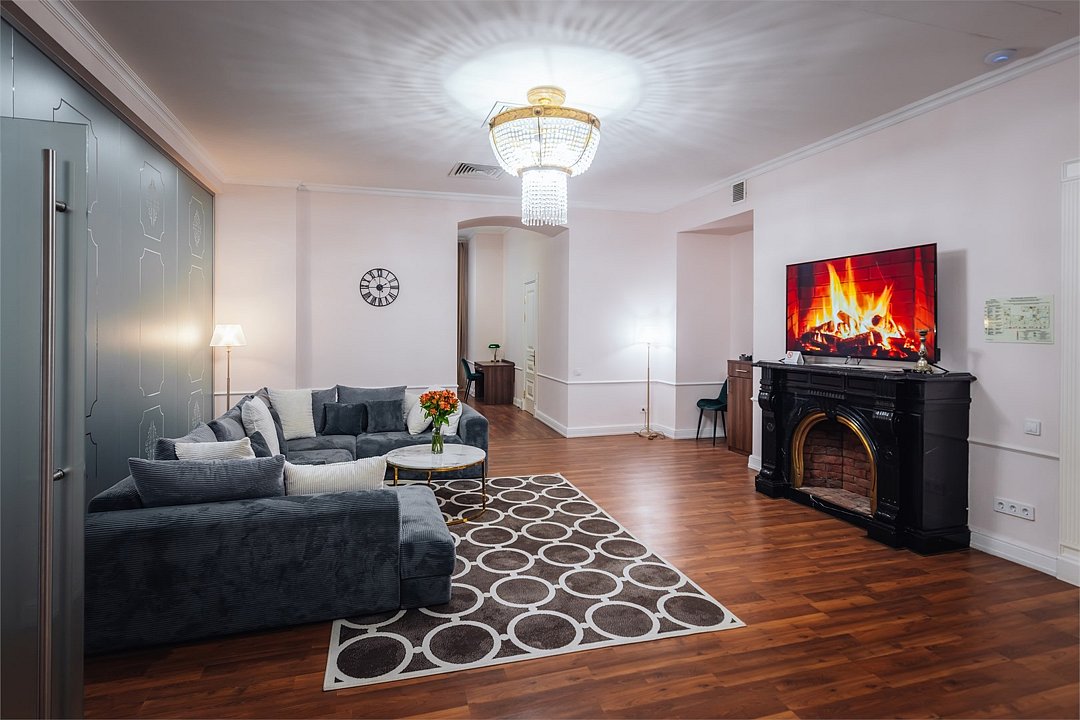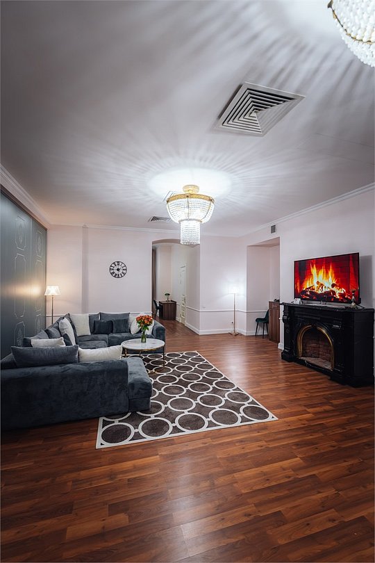 Wi-Fi, интернет, холодильник, кондиционер, светильник, настольные лампы, фен, весы, электронные замки, утюг, санузел, халаты, тапочки, косметические средства, гладильная доска, диван, тумбы, стулья, шкаф для одежды, вешалки, зеркало, комод, письменные принадлежности, чайный набор, обслуживание номеров, сейф, минеральная вода, чайник, унитаз, раковина, питьевая вода, отопление, душ, вид на город, две спальни, паркет, высокие потолки, две кровати «King size», стаканы, две ванные комнаты, стол, туалет, внутренний телефон, мини-холодильник, телевизор со Smart TV, номер для некурящих, морозильная камера, два дивана-кровати, чайная станцияВ номере