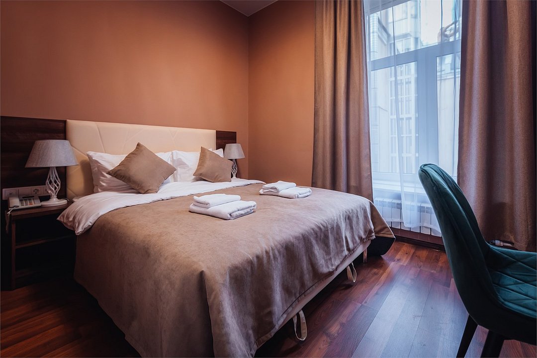 Номер "Стандарт" идеально подходит для размещения 1-2 человек. Площадь номера варьируется от 18 до 20 кв.м. Окна номера выходят во внутренний двор здания - архитектурная особенность Санкт-Петербурга или мансардные окна на ул. Малая Конюшенная. В каждом номере имеется спальная зона с удобной двуспальной кроватью с высоким ортопедическим матрасом, также есть номера с двумя односпальными кроватями , рабочая зона с функциональным рабочим столом, плазменным телевизором, wi-fi, кондиционером, сейфом, мини-баром, чайной станцией, утюгом и гладильной доской и просторная ванная комната.Услуги и удобства