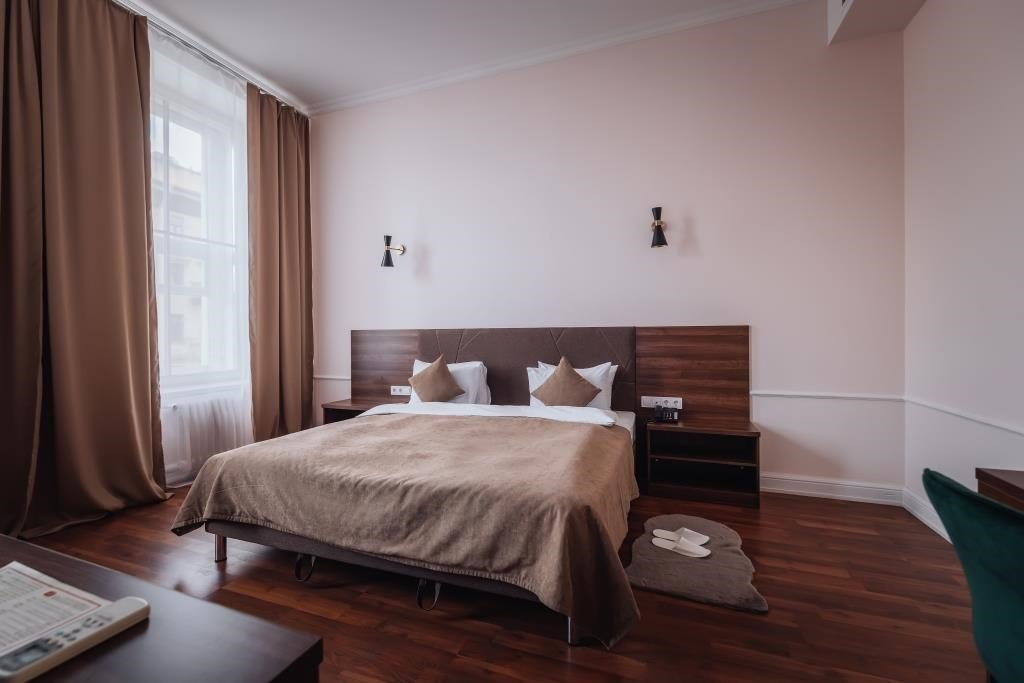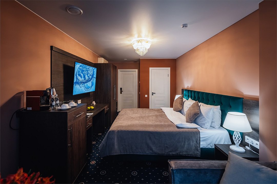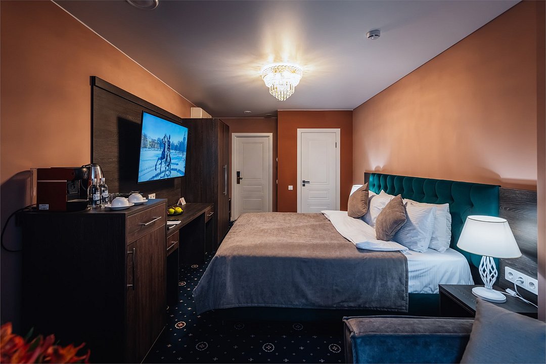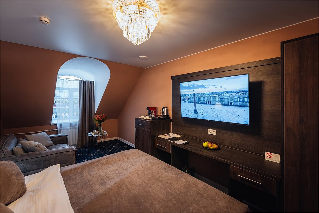 Просторный улучшенный номер площадью 25 кв. м. с окнами на пешеходную зону Малой Конюшенной улицы. Номер подходит для комфортного размещения 1-3 гостей. Есть возможность поставить дополнительное спальное место для взрослого гостя или детскую кроватку. В каждом номере имеется спальная зона с двуспальной кроватью King size с высоким ортопедическим матрасом или двумя односпальными кроватями, комфортабельная мебель (диван), шкаф для хранения одежды, рабочий стол, плазменный телевизор, многоканальный телефон, wi-fi, кондиционер, сейф, мини-бар, чайная станция, утюг и гладильная доска. Хрустальные люстры украшают номера и ванные комнаты. В ванной комнате: душевая увеличенного размера, оснащённая качественной сантехникой, раковина, фен, весы, халаты, тапочки. Ванная комната укомплектована всеми необходимыми туалетно-косметическими принадлежностями.Услуги и удобства
