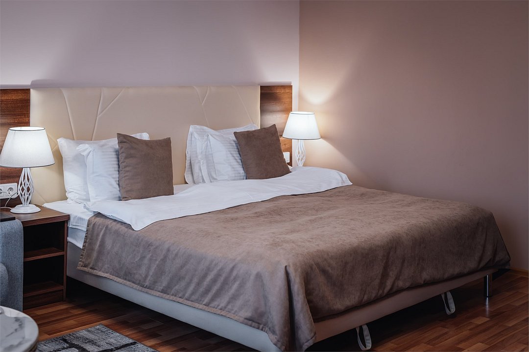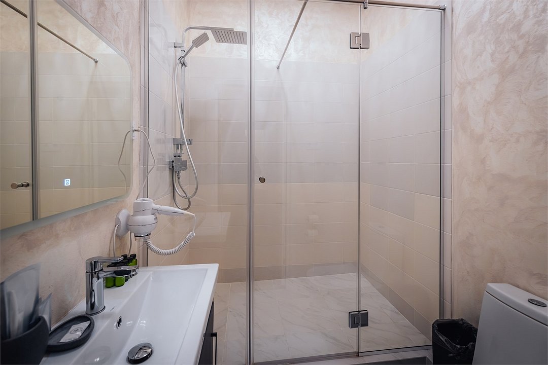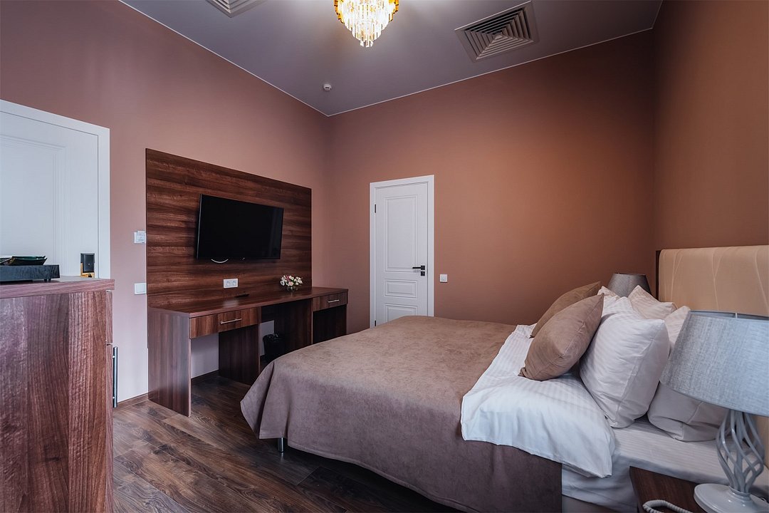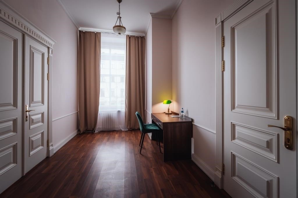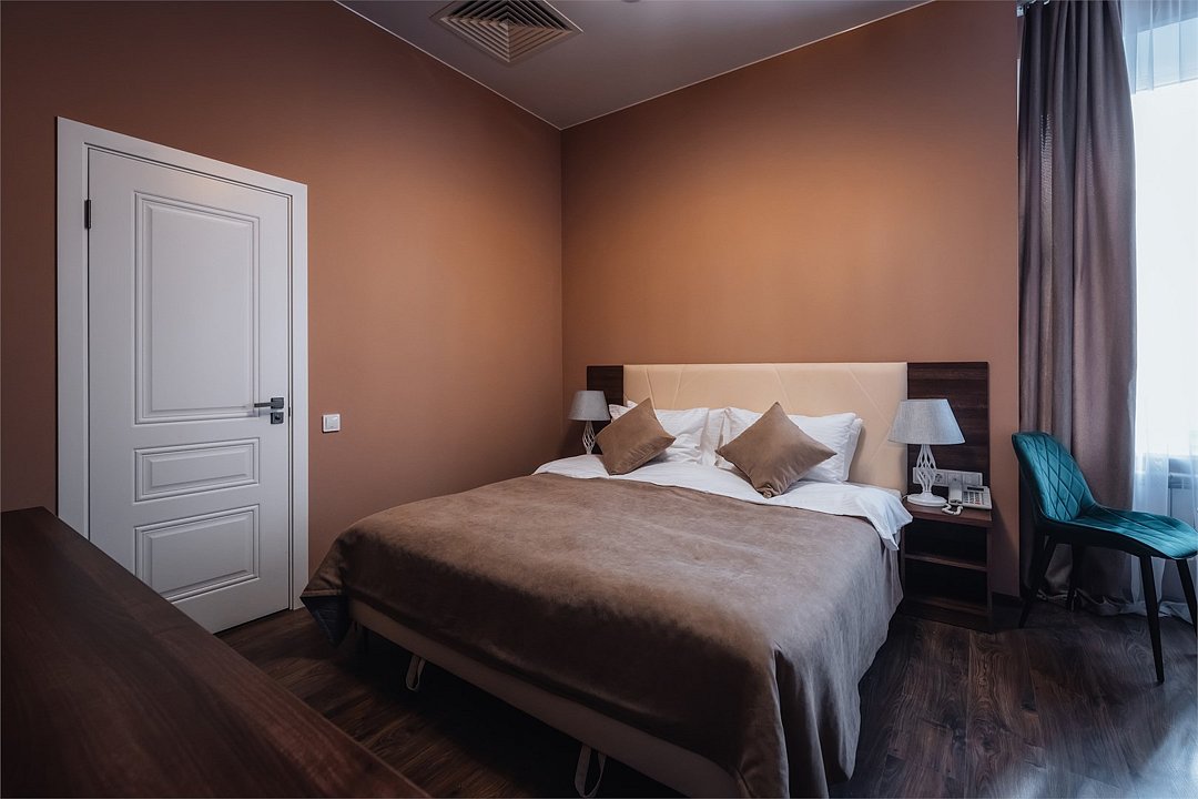 Просторный улучшенный номер площадью 25 кв. м. с окнами на пешеходную зону Малой Конюшенной улицы. Номер подходит для комфортного размещения 1-3 гостей. Есть возможность поставить дополнительное спальное место для взрослого гостя или детскую кроватку. В каждом номере имеется спальная зона с двуспальной кроватью King size с высоким ортопедическим матрасом или двумя односпальными кроватями, комфортабельная мебель (диван), шкаф для хранения одежды, рабочий стол, плазменный телевизор, многоканальный телефон, wi-fi, кондиционер, сейф, мини-бар, чайная станция, утюг и гладильная доска. Хрустальные люстры украшают номера и ванные комнаты. В ванной комнате: душевая увеличенного размера, оснащённая качественной сантехникой, раковина, фен, весы, халаты, тапочки. Ванная комната укомплектована всеми необходимыми туалетно-косметическими принадлежностями.Услуги и удобства