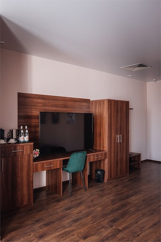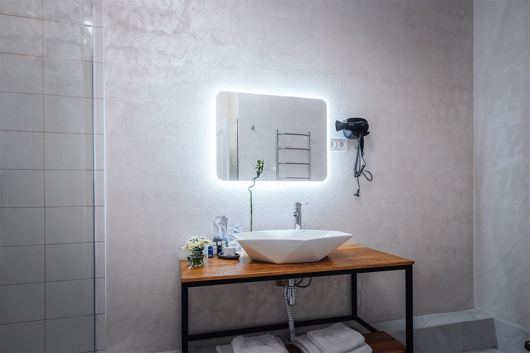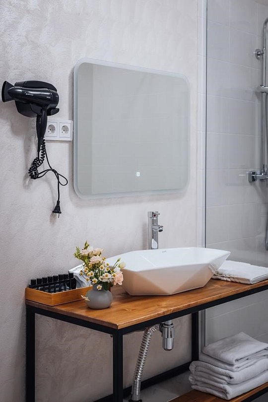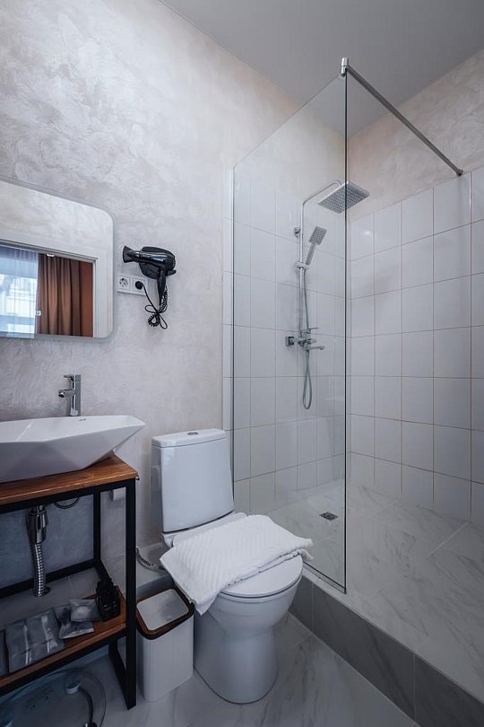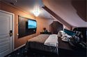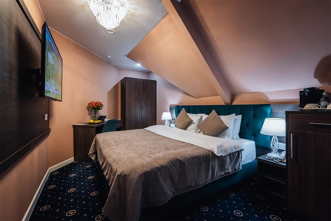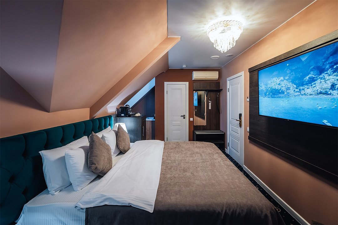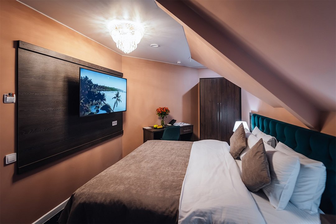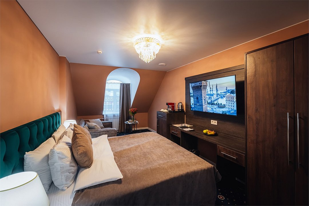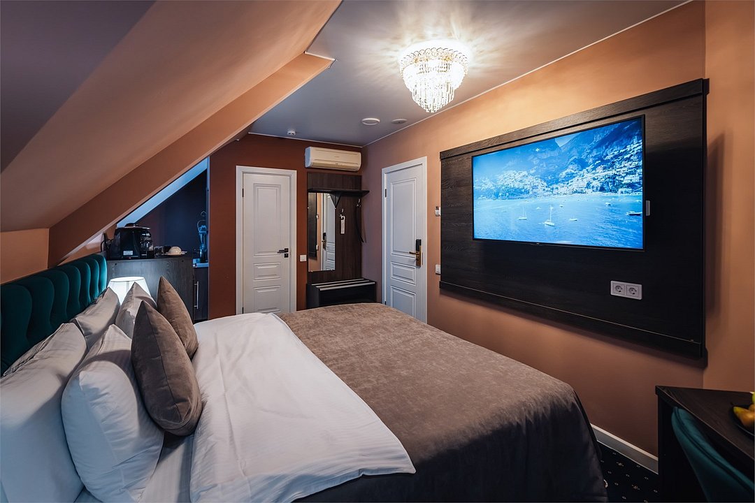 Wi-Fi, кондиционер, светильник, фен, утюг, халаты, тапочки, косметические средства, кровать «King size», две односпальные кровати, гладильная доска, тумбы, стулья, шкаф для одежды, вешалки, письменный стол, багажная тумба, чайный набор, обслуживание номеров, сейф, чайник, унитаз, питьевая вода, ковровое покрытие, отопление, душ, вид на город, вид во двор, стаканы, внутренний телефон, мини-холодильник, мансардные окна, телевизор со Smart TV, чайная станция, уборка номера, вешалки-плечики, шапочка для душа, мылоВ номере