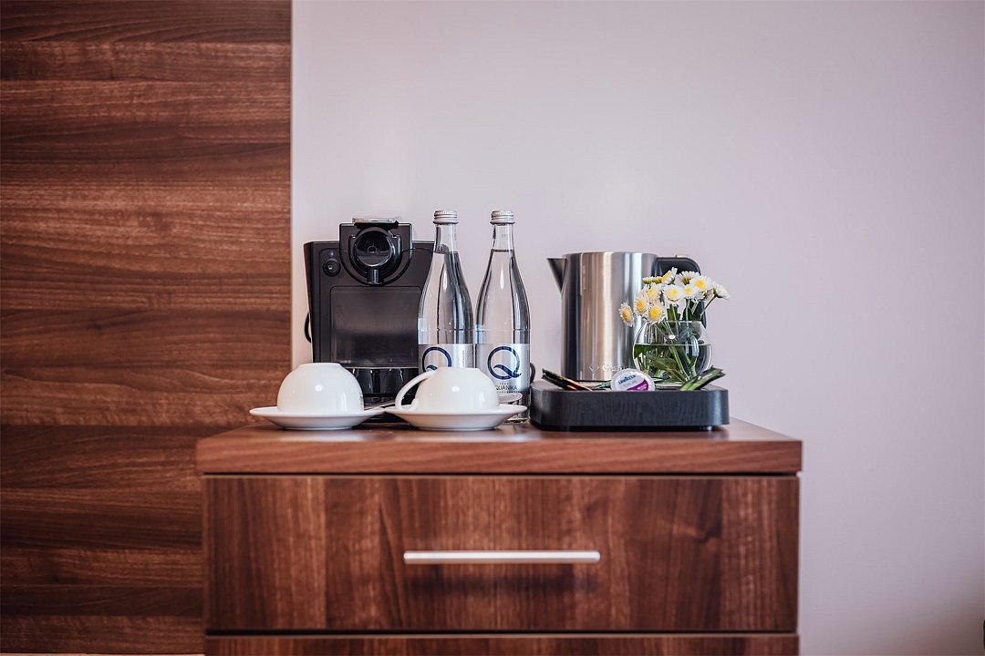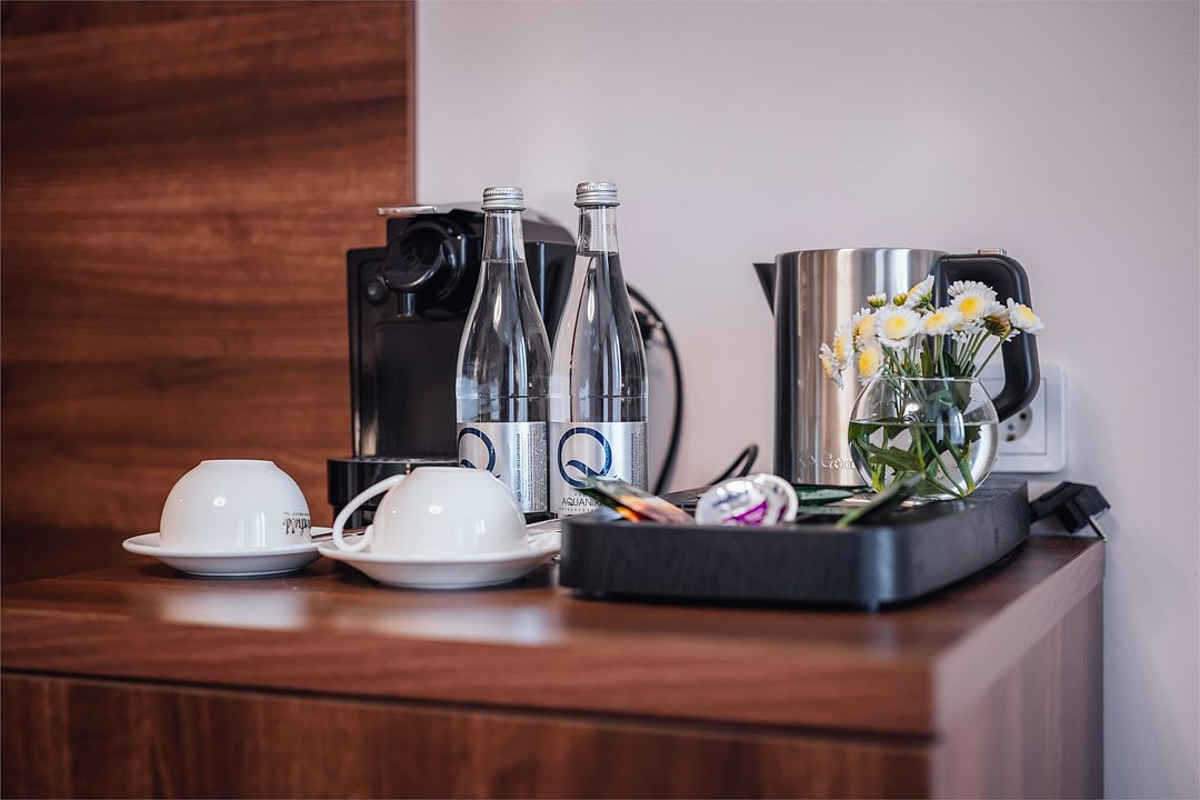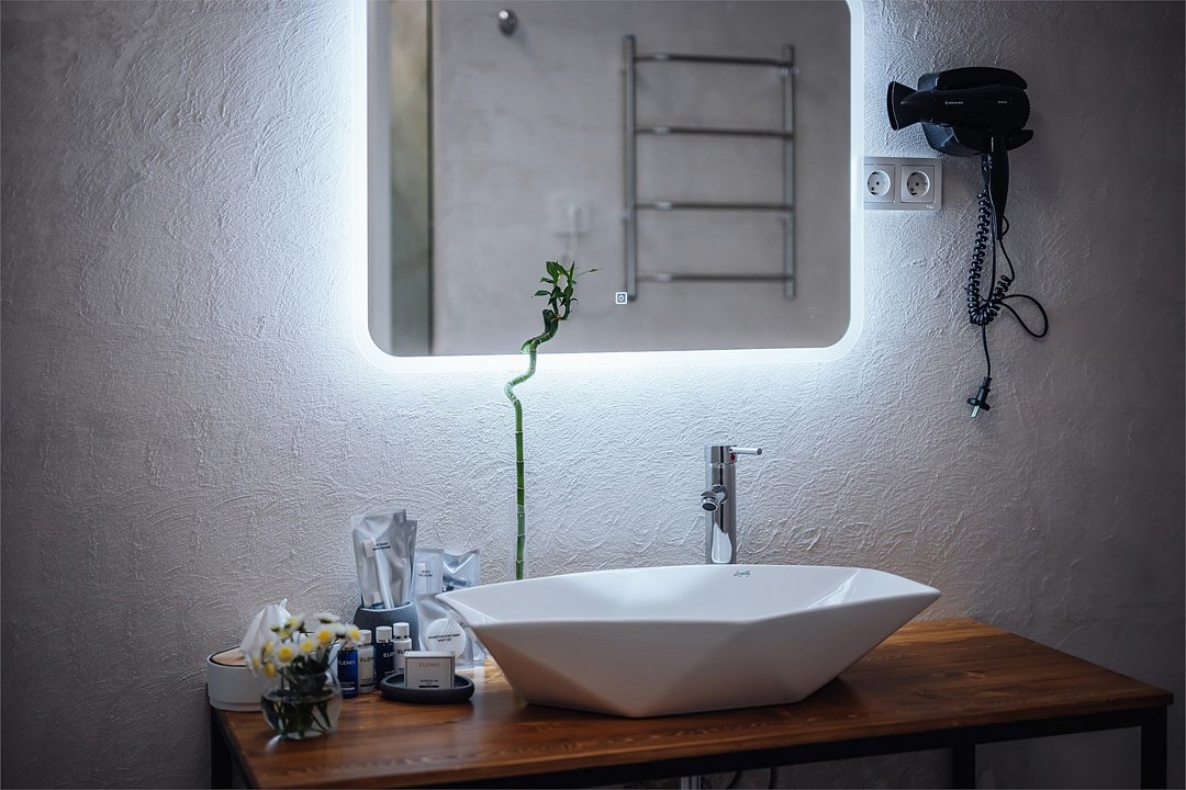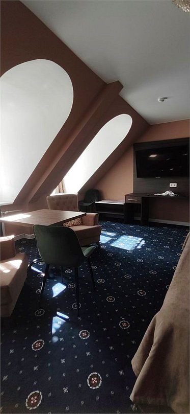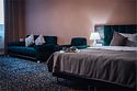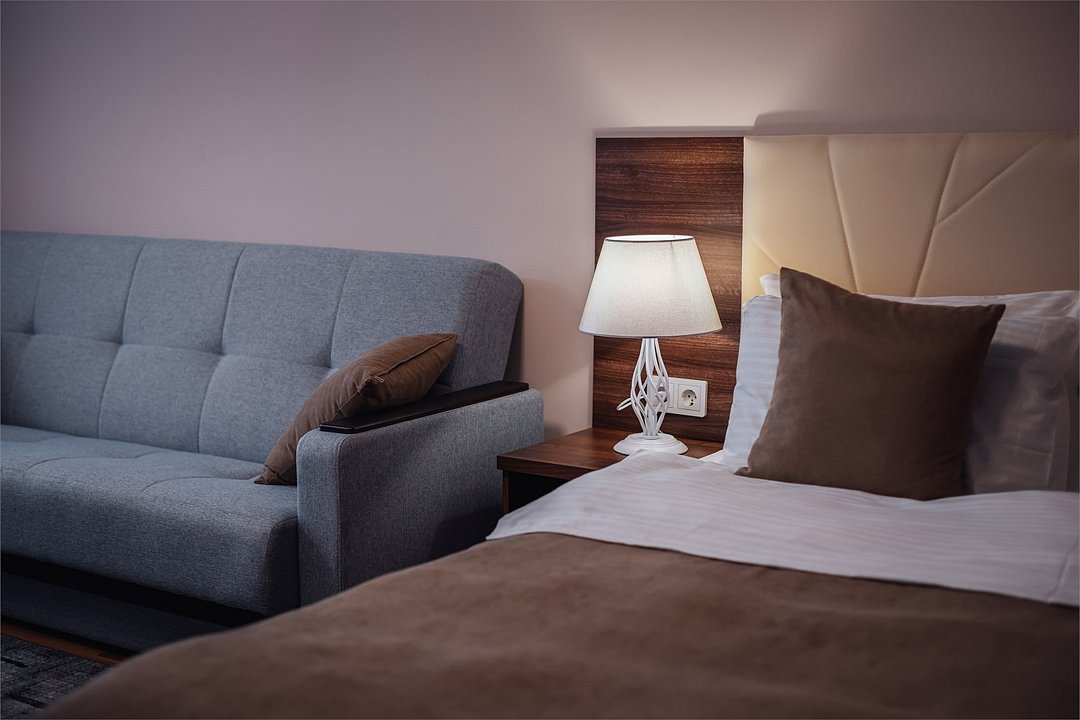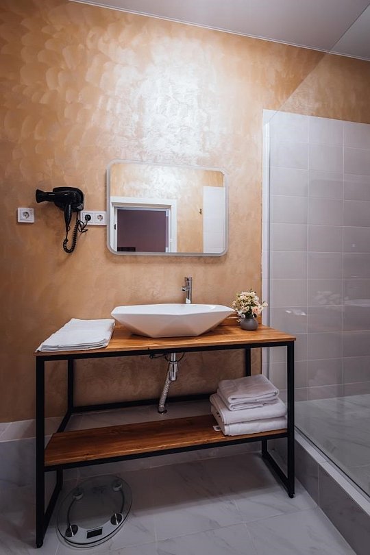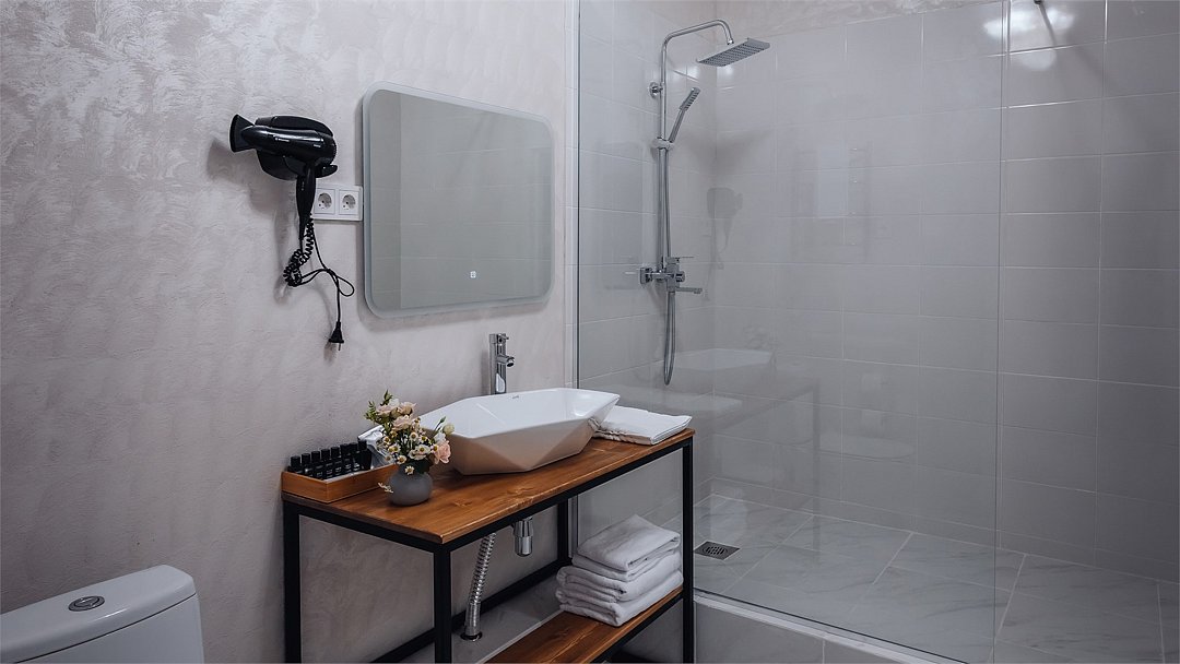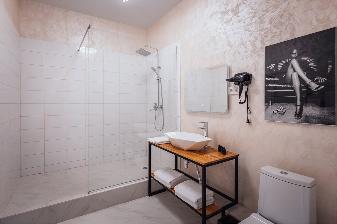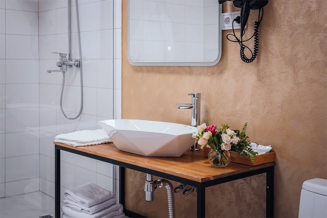 Wi-Fi, кондиционер, светильник, фен, утюг, халаты, тапочки, косметические средства, кровать «King size», две односпальные кровати, гладильная доска, тумбы, стулья, шкаф для одежды, вешалки, письменный стол, багажная тумба, чайный набор, обслуживание номеров, сейф, чайник, унитаз, питьевая вода, ковровое покрытие, отопление, душ, вид на город, вид во двор, стаканы, внутренний телефон, мини-холодильник, мансардные окна, телевизор со Smart TV, чайная станция, уборка номера, вешалки-плечики, шапочка для душа, мылоВ номере