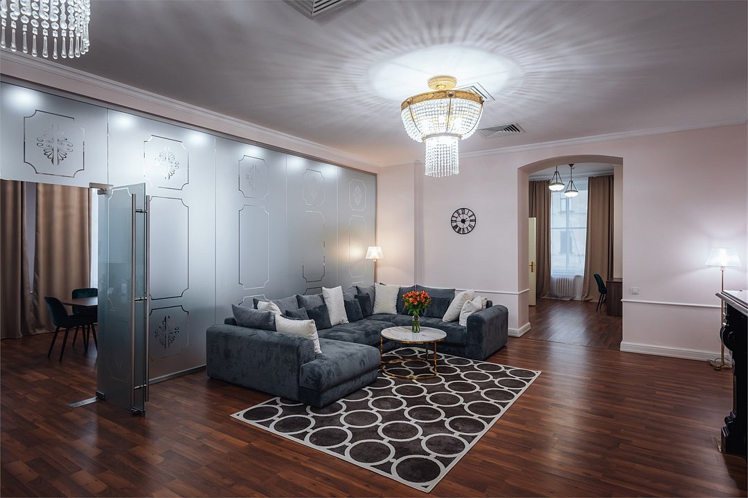 Комфортабельный трехкомнатный номер площадью 70 кв. м подойдет для размещения 6-9 гостей с детьми. Есть возможность организации смежных номеров для комфортного размещения семьи. Из панорамных окон номера открывается вид на пешеходную зону исторической улицы Малая Конюшенная. В номере: 3 изолированные спальни, 3 санузла, общий холл. Двуспальная кровать (King size) в каждой комнате. Комфортабельная мебель, шкафы для хранения одежды, рабочий стол, плазменный телевизор в каждой комнате, многоканальный телефон, wi-fi, кондиционер, сейф, мини-бар, чайная станция, утюг и гладильная доска. Дополнительное спальное место в каждой комнате, позволяющее с комфортом разместиться в номере 9 гостям , детская кровать –манеж предоставляется по запросу.Услуги и удобства