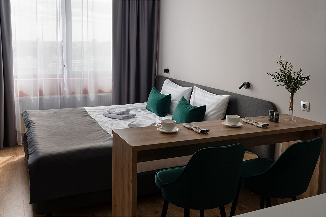 Оплачиваются дополнительно на заезде: административные расходы, связанные с регистрацией иностранных граждан, в режиме on-line, с использованием рекомендуемого Правительством Санкт-Петербурга программного обеспечения, гарантирующего полную защиту персональных данных иностранных граждан, составляют 350 рублей за каждую операцию, НДС не облагается300 рублей за каждую операцию, НДС не облагается Апартаменты категории «Стандарт» - это сочетание функциональности и элегантности в пространстве, которое включает в себя спальную зону с двумя раздельными кроватями, отдельное рабочее место и кухонную зону с обеденным столом. В апартаментах установлен телевизор с функцией Smart TV, с помощью которой Вы всегда сможете найти желаемый контент, а для отдыха с максимальным комфортом кровати оборудованы профессиональными матрасами. Стильная ванная комната оборудована встроенной душевой кабиной и стиральной машиной, а также электрическим полотенцесушителем. Также в ванной установлен гигиенический душ, а над раковиной размещено зеркало с удобной подсветкой. Приятное сочетание цветовых акцентов выгодно подчеркивает светлые апартаменты и радует в любую Петербургскую погоду.Услуги и удобства