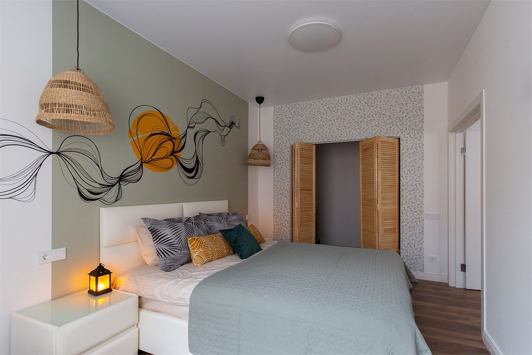 Wi-Fi, холодильник, фен, микроволновая печь, утюг, ванна, теплый пол, диван, тумбы, стулья, шкаф для одежды, обеденный стол, зеркало, посудомоечная машина, стиральная машина, отопление, кресло, раздельный санузел, две спальни, кухонная утварь, столовые приборы, туалетный столик, туалет, сушилка для белья, телевизор со Smart TV, духовкаВ квартире