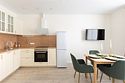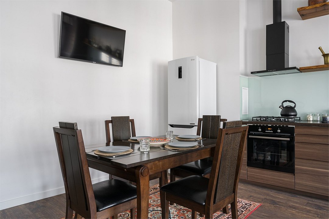 Wi-Fi, холодильник, фен, плита для приготовления пищи, утюг, обогреватель, теплый пол, гигиенические средства, двуспальная кровать, тумбы, стулья, вешалки, обеденный стол, зеркало, ковер, эксклюзивная мебель, кухня, чайный набор, набор посуды, посудомоечная машина, стиральная машина, чайник, унитаз, раковина, гостиная зона, отопление, душ, вид на город, плиточное покрытие, высокие потолки, кухонная утварь, стол, туалетные средства, диван-кровать, раскладной диван, телевизор с плоским экраном, теплые полы, гигиенический душ, духовкаВ квартире