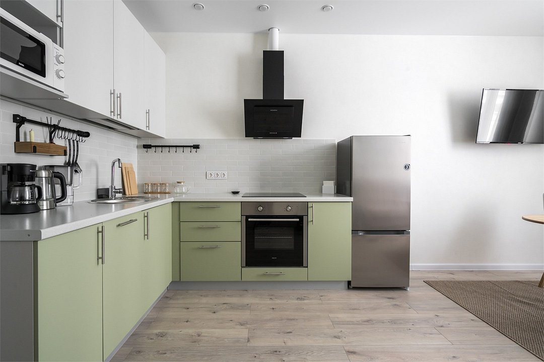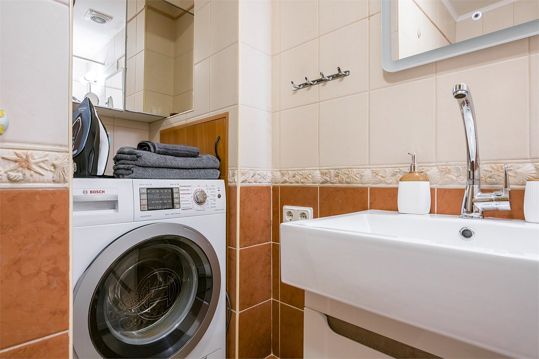Wi-Fi, холодильник, светильник, фен, вентилятор, электронные замки, плита для приготовления пищи, кофемашина, утюг, радио, обогреватель, ванная комната, ванна, санузел, теплый пол, банные полотенца, гигиенические средства, кровать «King size», гладильная доска, диван, кресла, тумбы, стулья, шкаф для одежды, вешалки, журнальный столик, зеркало, комод, две комнаты, чайный набор, набор посуды, посудомоечная машина, стиральная машина, чайник, унитаз, раковина, мягкая мебель, питьевая вода, обеденная зона, вид на город, плиточное покрытие, раздельный санузел, паркет, ламинат, высокие потолки, тостер, кухонная посуда, стаканы, кухонная утварь, столовые приборы, кофейный столик, стол, туалетные средства, туалет, сушилка для белья, цифровое тв, диван-кровать, раскладной диван, телевизор с плоским экраном, кухонный уголок, москитная сетка, теплые полы, антибактериальное средство для рук, гигиенический душ, духовкаВ квартире