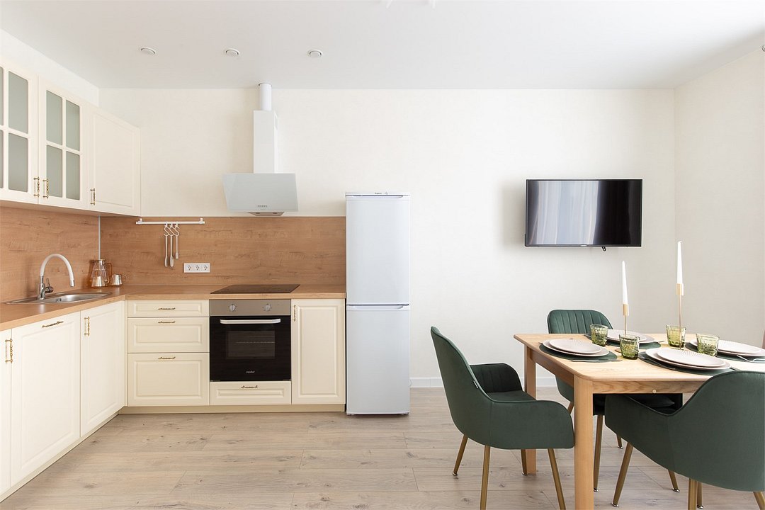 Wi-Fi, холодильник, фен, утюг, ванна, теплый пол, двуспальная кровать, стулья, шкаф для одежды, вешалки, комод, кухня, чайный набор, набор посуды, посудомоечная машина, стиральная машина, чайник, мягкая мебель, отопление, вид во двор, стаканы, столовые приборы, стол, тумба, туалетный столик, туалет, телевизор со Smart TV, духовка, кофеварка, зеркало в полный ростВ квартире