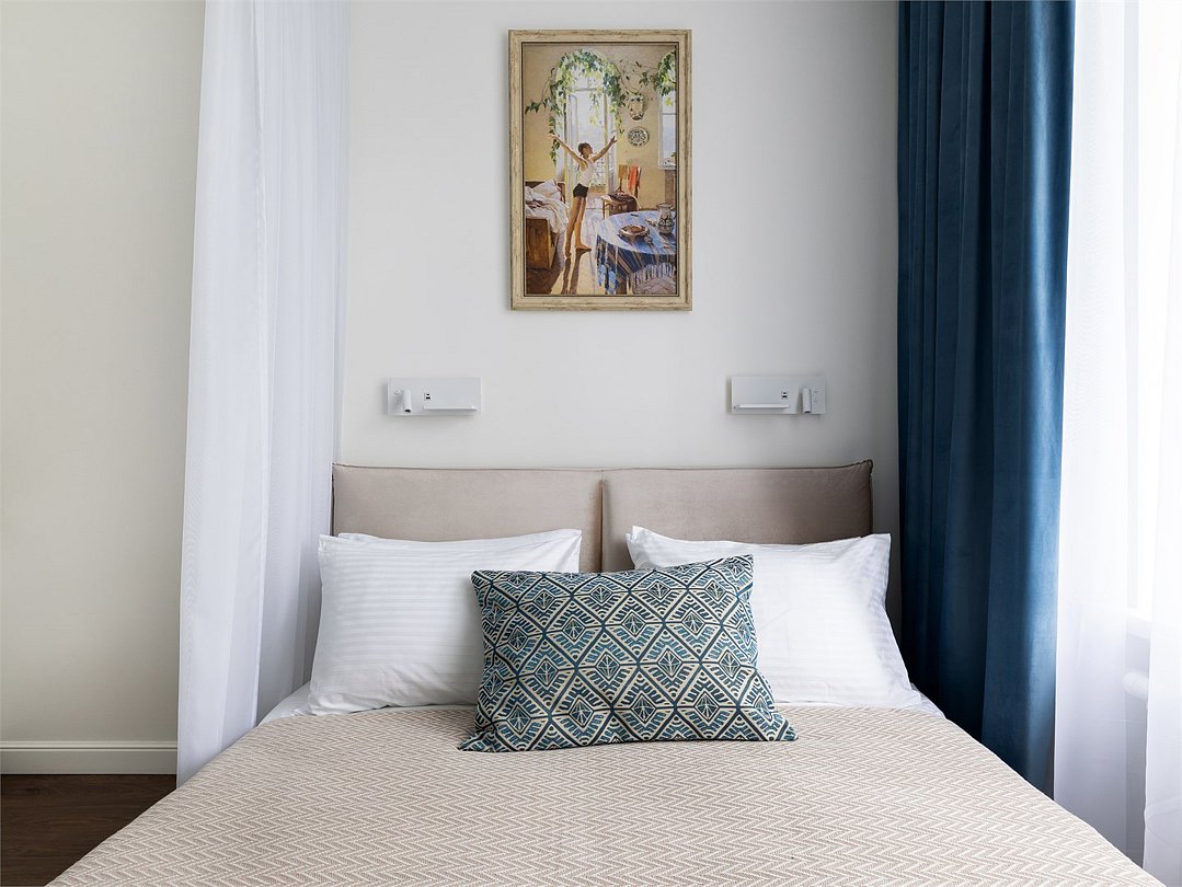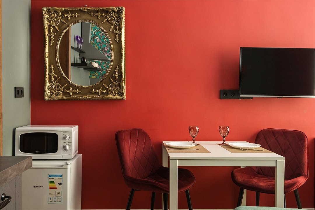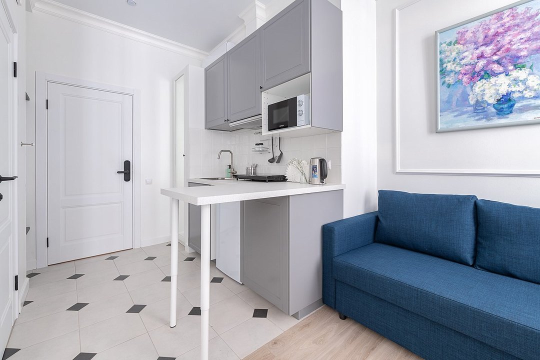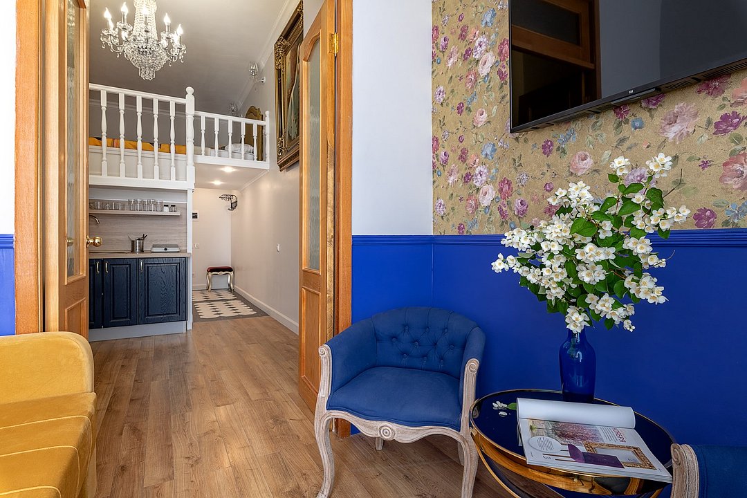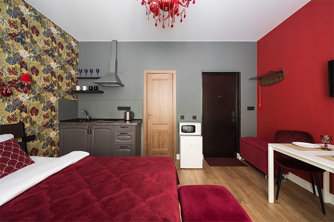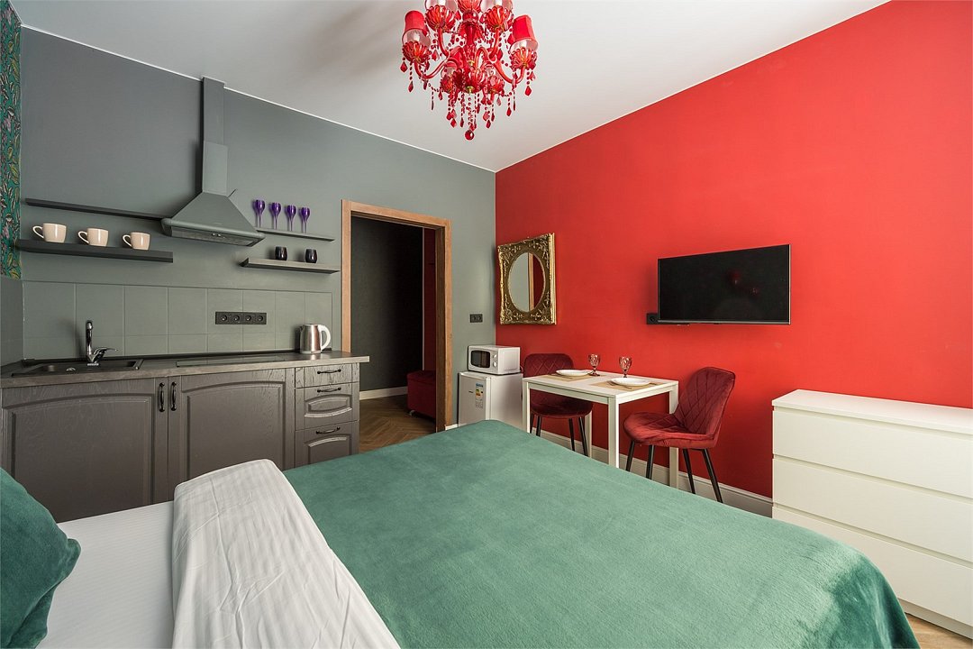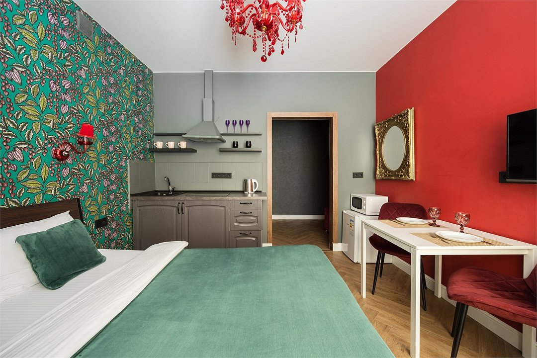 Комплекс апартаментов “Дом Смотрителя” располагается сразу за Казанским собором, в 5 минутах от ст.м. “Невский проспект”. Благодаря удачному расположению на тихой улочке вы сможете проживать в самом сердце города вне загруженных центральных улиц. ”Дизайнерские апартаменты” выполнены в современном стиле, искусно сочетая лазурные и алые цвета интерьера и мебели. Данная квартира особенно понравится любителям креатива и творчества! Апартаменты размещают до 4 гостей. В отдельной комнате расположена двуспальная кровать с ортопедическим матрасом, а в гостиной - удобный диван, который при необходимости, раскладывается, превращаясь в односпальное/двуспальное место. Всё постельное белье самого высокого качества. В апартаментах предусмотрено все для комфортного отдыха и проживания: бесплатный Wi-Fi, Smart TV, утюг, гладильная доска, система хранения одежды, обеденная зона и зона для отдыха. Два больших окна студии выходят в тихий двор - ночной шум центра города не помешает вашему отдыху. Собственная кухня располагает всем необходимым для приготовления любимых блюд: электроплита, микроволновая печь, чайник, холодильник, а также посуда и столовые приборы. В ванной комнате вы найдете фен и комплекты свежих полотенец. В общей зоне есть стиральная машина и порошок, которыми можно воспользоваться в любое время совершенно бесплатно. Апартаменты идеально подойдут как для семейного проживания, так и для романтического свидания, а близость ко всем достопримечательностям сэкономит ваше время и позволит увидеть больше, даже за самый короткий отдых! Важно: Стандартное время заезда: 14:00 Стандартное время выезда: 12:00 Для заселения вам потребуется прислать фото паспорта. -при проживании взимается залог 5000 рублей (возвращается после выезда и уборки). -для заселения понадобится прислать фото паспорта . -у нас запрещено проведение вечеринок(установлено общедомовое видеонаблюдение), КУРЕНИЕ/парение любых курительных средств и жидкостей, в том числе на балконе. Штраф 5000 рублей При бронировании вы можете оформить ранний заезд или поздний выезд.Услуги и удобства