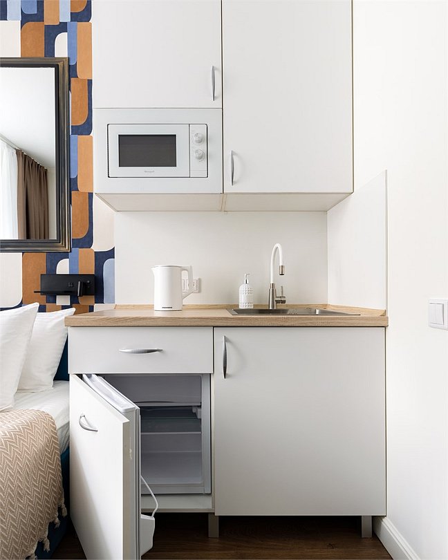 Wi-Fi, фен, плита для приготовления пищи, микроволновая печь, утюг, двуспальная кровать, гладильная доска, стулья, вешалки, зеркало, комод, чайник, унитаз, раковина, отопление, душ, вид на город, кухонная посуда, стаканы, столовые приборы, стиральная машина и сушилка, раскладной диван, телевизор с плоским экраном, мини-холодильник, мини-кухня, номер для некурящихВ студии