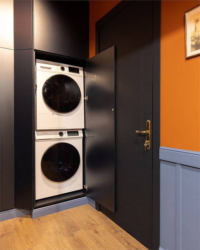 Wi-Fi, холодильник, фен, электронные замки, плита для приготовления пищи, микроволновая печь, утюг, двуспальная кровать, письменный стол, пуфики, стиральная машина, чайник, душ, вид во двор, туалет, сушилка для белья, диван-кровать, телевизор со Smart TVВ апартаментах