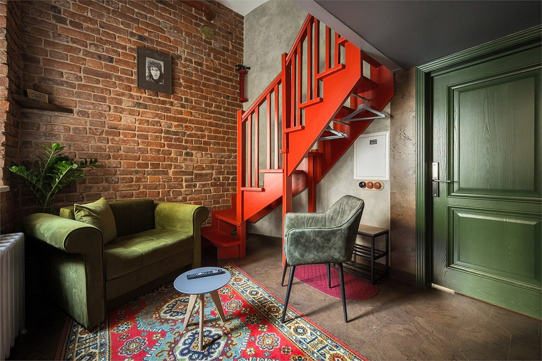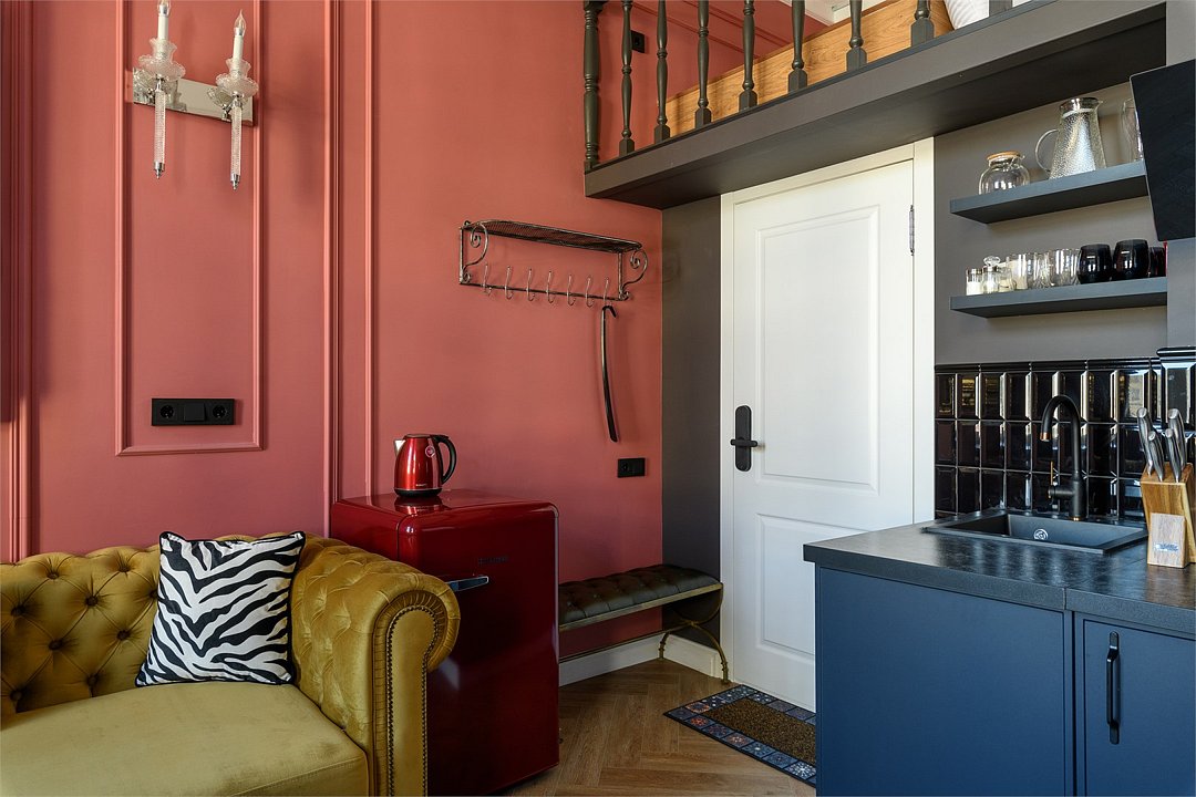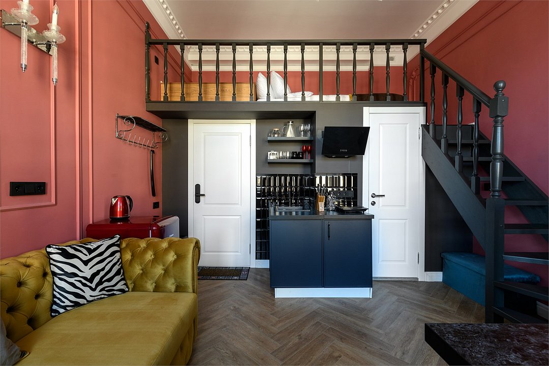Комплекс апартаментов “Дом Смотрителя” располагается сразу за Казанским собором, в 5 минутах от ст.м. “Невский проспект”. Благодаря удачному расположению на тихой улочке вы сможете проживать в самом сердце города вне загруженных центральных улиц. Близость апартаментов ко всем историческим достопримечательностям сэкономит ваше время и позволит увидеть больше, даже за короткий период! Дизайн студии оформлен в ярких и необычных тонах: коралловый в сочетании с золотым делают студию настоящим предметом современного искусства. В двухуровневой студии могут разместиться до 4х человек: на первом уровне расположен удобный диван, при необходимости, превращающийся в спальное место для двоих; на втором уровне - уединенная спальная зона - полноценная двуспальная кровать с ортопедическим матрасом и белоснежным бельем высокого качества. В квартире предусмотрено все для комфортного отдыха и проживания: бесплатный Wi-Fi, Smart TV, утюг, гладильная доска, система хранения одежды, обеденная зона и зона для отдыха. Собственная кухня располагает всем необходимым для самостоятельного приготовления: электроплита, микроволновая печь, чайник, холодильник, а также посуда и столовые приборы. Вы легко сможете приготовить завтрак и любимые блюда, наслаждаясь лучшим видом в городе! В ванной комнате вы найдете фен и комплекты свежих полотенец. В общей зоне есть стиральная машина и порошок, которыми можно воспользоваться в любое время совершенно бесплатно. Важно: Для заселения вам потребуется прислать фото паспорта. Стандартное время заезда: 14:00 Стандартное время выезда: 12:00 При бронировании вы можете оформить ранний заезд или поздний выезд.Услуги и удобства