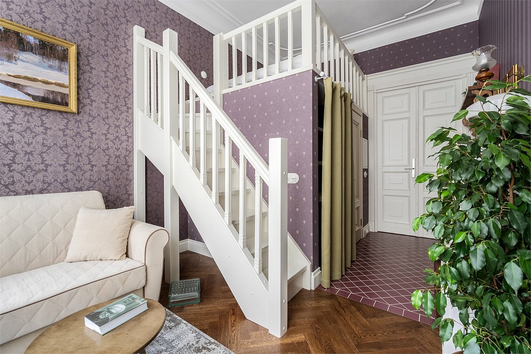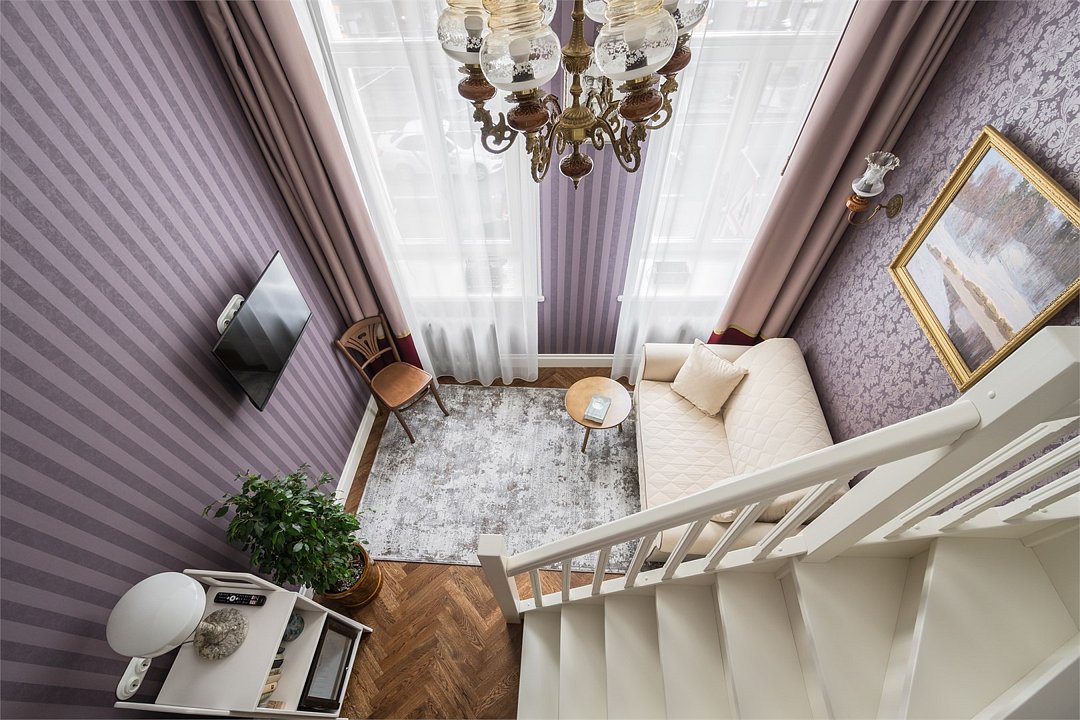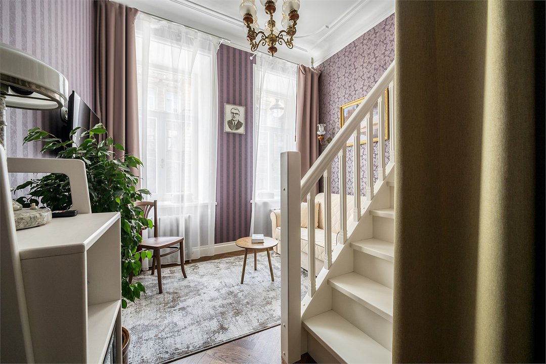 На стенах апартаментов Вы сможете увидеть репродукции известных картин художника. Апартаменты идеально подойдут тем, кто любит тишину и комфорт – окна выходят в просторный двор. Великолепный большой диван станет Вашим излюбленным местом в квартире. Двуспальная кровать на верхнем уровне, куда ведёт удобная лестница, позволит хорошо выспаться, благодаря ортопедическому матрасу. Двухуровневые апартаменты в классическом стиле на Инженерной ул, д.7. «Золотой треугольник» Санкт-Петербурга, все культовые достопримечательности в шаговой доступности. Ст.м."Гостиный Двор" - 3 минуты пешком.Услуги и удобства