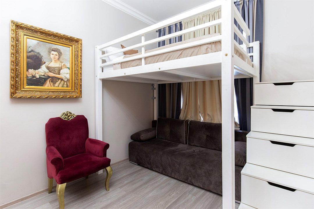 Апартаменты, носящие фамилию великого русского художника Валентина Серова, идеально подойдут тем, кто любит тишину и комфорт – окна выходят в просторный двор. На стенах, среди прочих репродукций, Вы встретите и знаменитую «Девочку с персиками». Апартаменты идеальны для двоих – на верхнем уровне Вас ждёт большая двуспальная кровать. Внизу, в гостиной зоне, находится кресло-кровать, которое, при желании, может стать комфортным спальным местом для третьего гостя. Двухуровневые апартаменты в классическом стиле на Инженерной ул, д.7. «Золотой треугольник» Санкт-Петербурга, все культовые достопримечательности в шаговой доступности. Ст.м."Гостиный Двор" - 3 минуты пешком.Услуги и удобства
