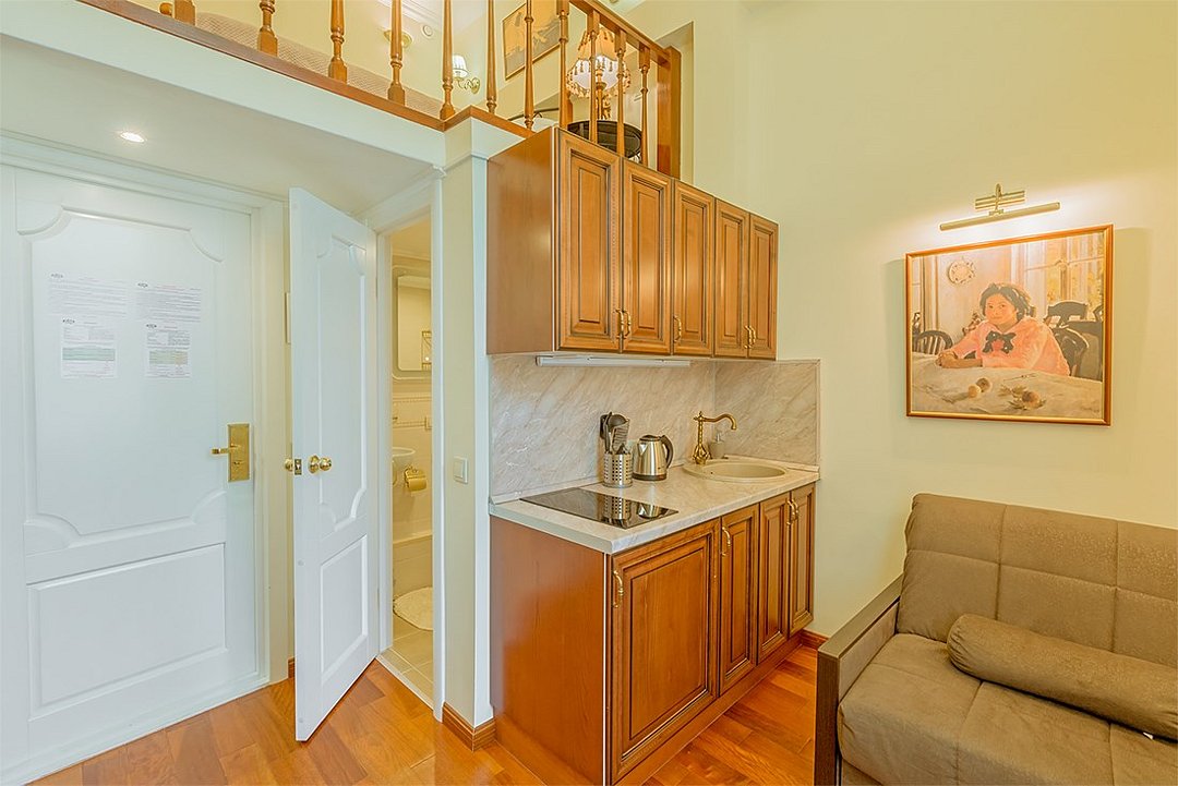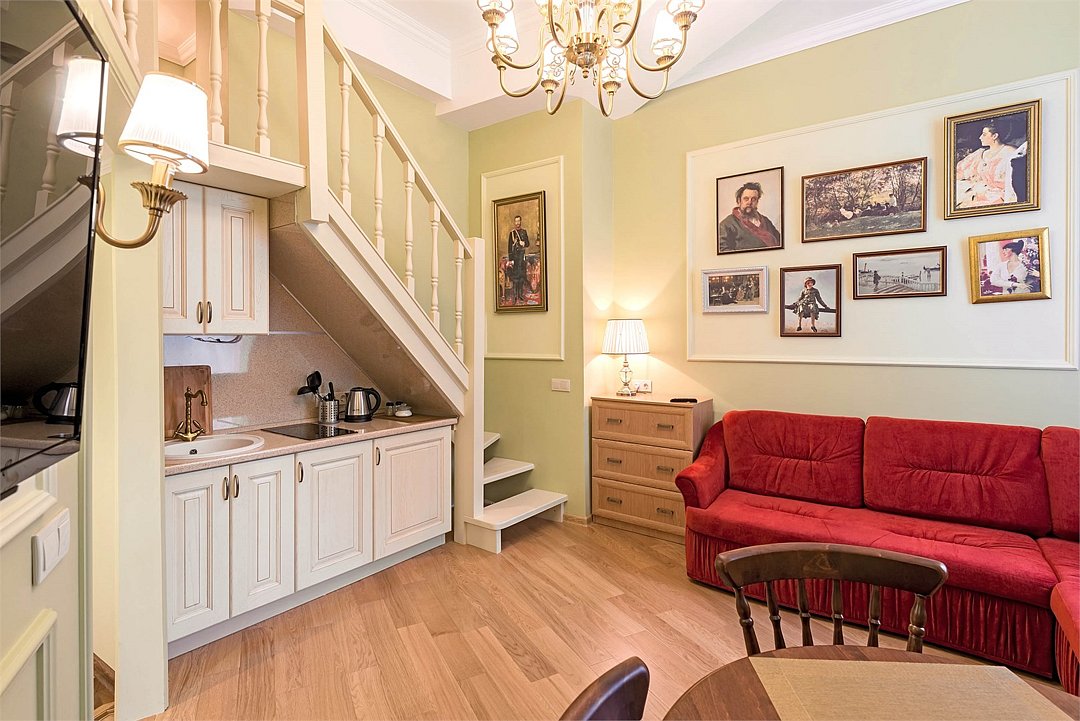 Апартаменты названы в честь великого русского живописца Ильи Репина, творчество которого тесно связано и с Петербургом. На стенах апартаментов Вы сможете увидеть репродукции известных картин художника. Апартаменты идеально подойдут тем, кто любит тишину и комфорт – окна выходят в просторный двор. Великолепный большой диван станет Вашим излюбленным местом в квартире. Двуспальная кровать на верхнем уровне, куда ведёт удобная лестница, позволит хорошо выспаться, благодаря ортопедическому матрасу. Апартаменты "Репин"" носят фамилию знаменитого русского художника. Двухуровневые апартаменты в классическом стиле на Инженерной ул, д.7. «Золотой треугольник» Санкт-Петербурга, все культовые достопримечательности в шаговой доступности. Ст.м."Гостиный Двор" - 3 минуты пешком.Услуги и удобства