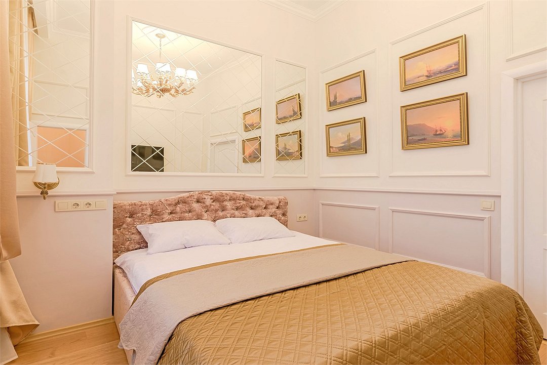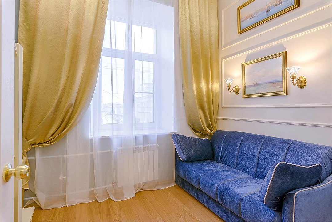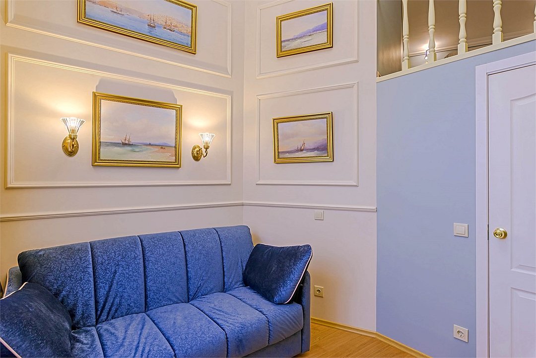 Апартаменты носят фамилию великого русского художника-мариниста Ивана Айвазовского. Живописец Главного Морского штаба, академик и почётный член Императорской Академии художеств, почётный член Академий художеств в Амстердаме, Риме, Париже, Флоренции и Штутгарте. На стенах апартаментов Вы сможете увидеть репродукции картин художника. Окна апартаментов выходят на панораму Садовой и Инженерной улиц, с прекрасными видовыми характеристиками на Русский и Этнографический музеи. А буквально в 200-х метрах находится Инженерный (Михайловский) замок. Апартаменты состоят из двух комнат: спальня с гардеробной и двухуровневая гостиная со спальной зоной на верхнем уровне. Просторный коридор и кухня выделены в отдельную зону. Санузел оборудован ванной и туалетом. Двухуровневые апартаменты в классическом стиле на Инженерной ул, д.7. «Золотой треугольник» Санкт-Петербурга, все культовые достопримечательности в шаговой доступности. Ст.м."Гостиный Двор" - 4 минуты пешком.Услуги и удобства