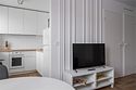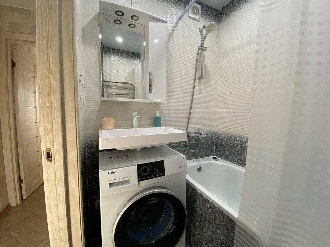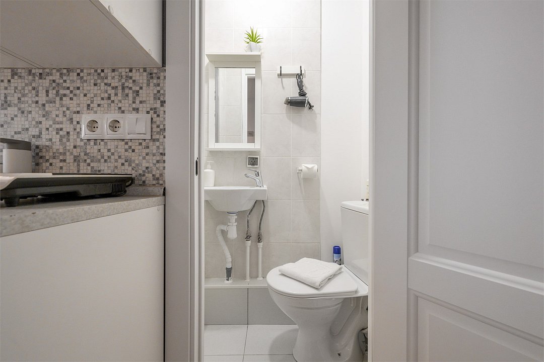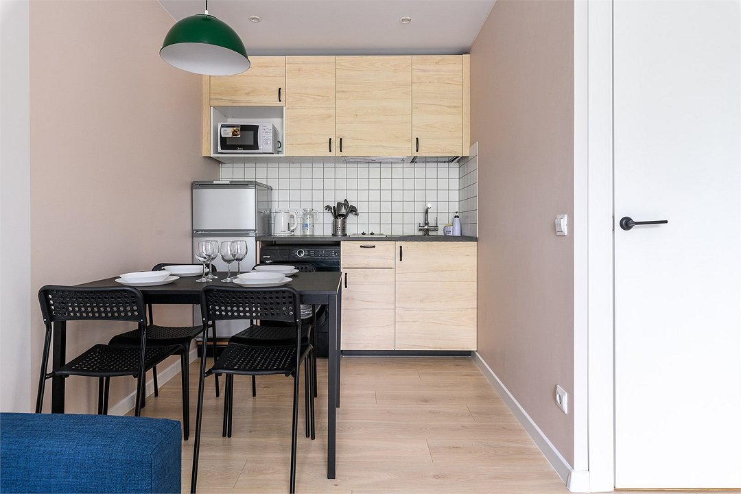 Wi-Fi, холодильник, кондиционер, фен, микроволновая печь, утюг, душевая кабина, двуспальная кровать, шкаф для одежды, стиральная машина, душ, стул, стол, туалет, телевизор с плоским экраном, мини-кухняВ студии