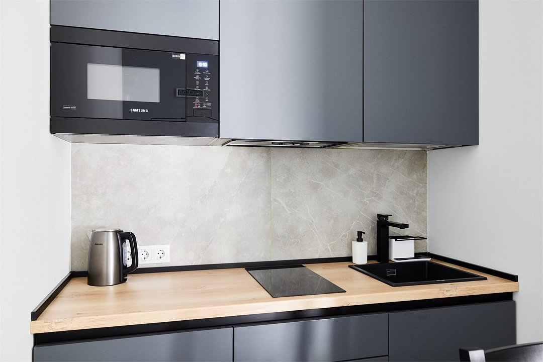 кабельное телевидение, Wi-Fi, кондиционер, светильник, фен, электронные замки, плита для приготовления пищи, микроволновая печь, утюг, ванная комната, теплый пол, банные полотенца, двуспальная кровать, гладильная доска, стулья, шкаф для одежды, зеркало, набор посуды, унитаз, раковина, обеденная зона, гостиная зона, отопление, душ, вид во двор, ламинат, кухонная посуда, стаканы, кухонная утварь, столовые приборы, стиральная машина и сушилка, стол, диван-кровать, раскладной диван, телевизор с плоским экраном, мини-холодильник, мини-кухня, номер для некурящихВ апартаментах